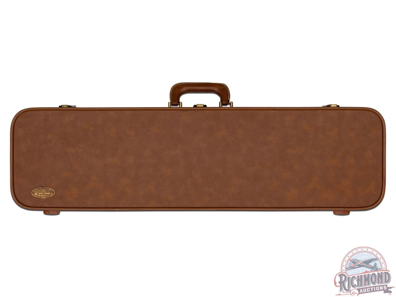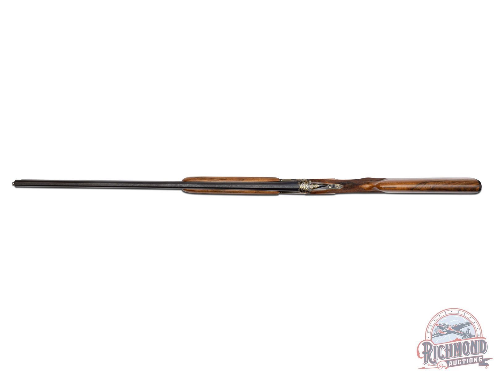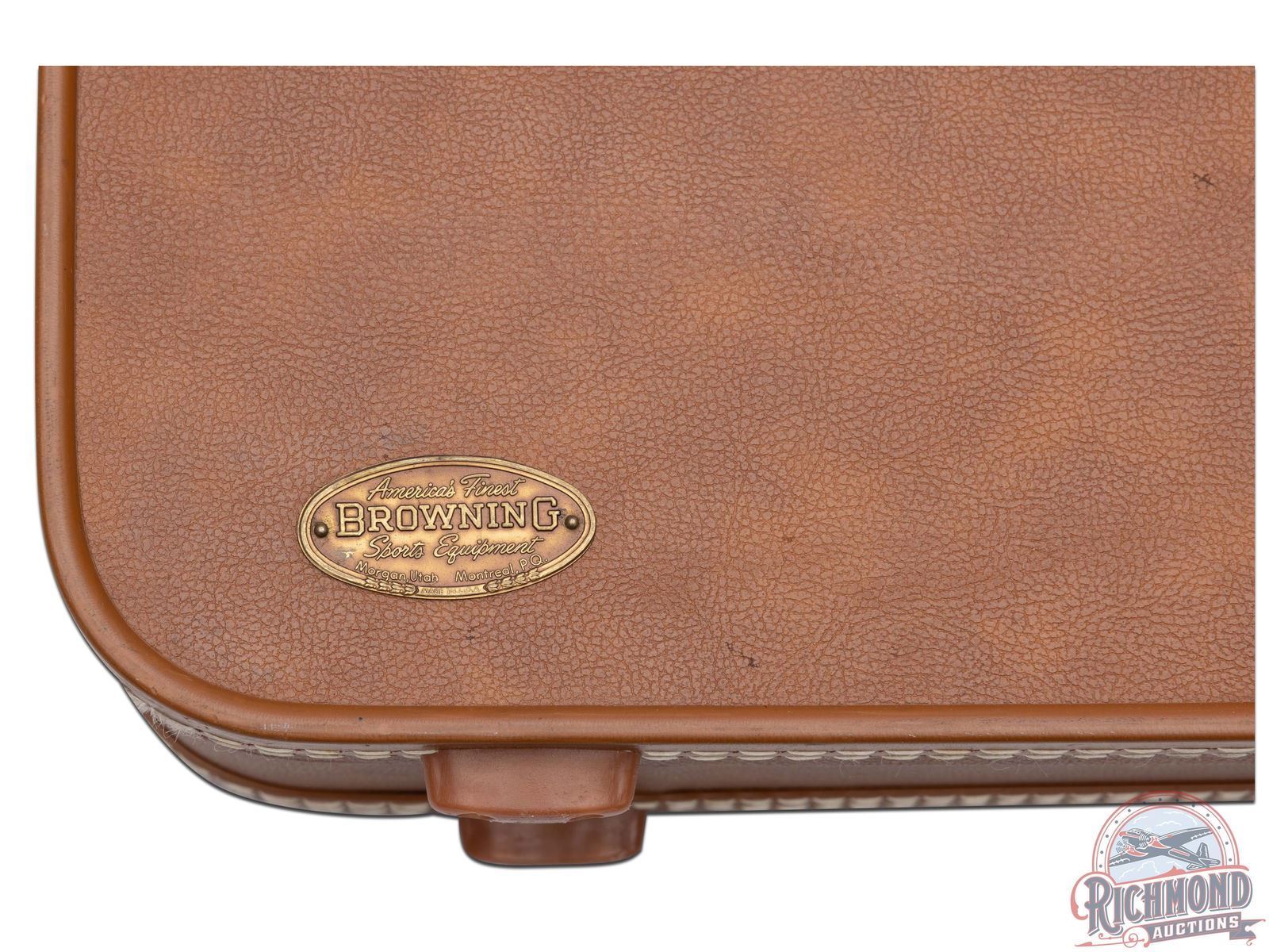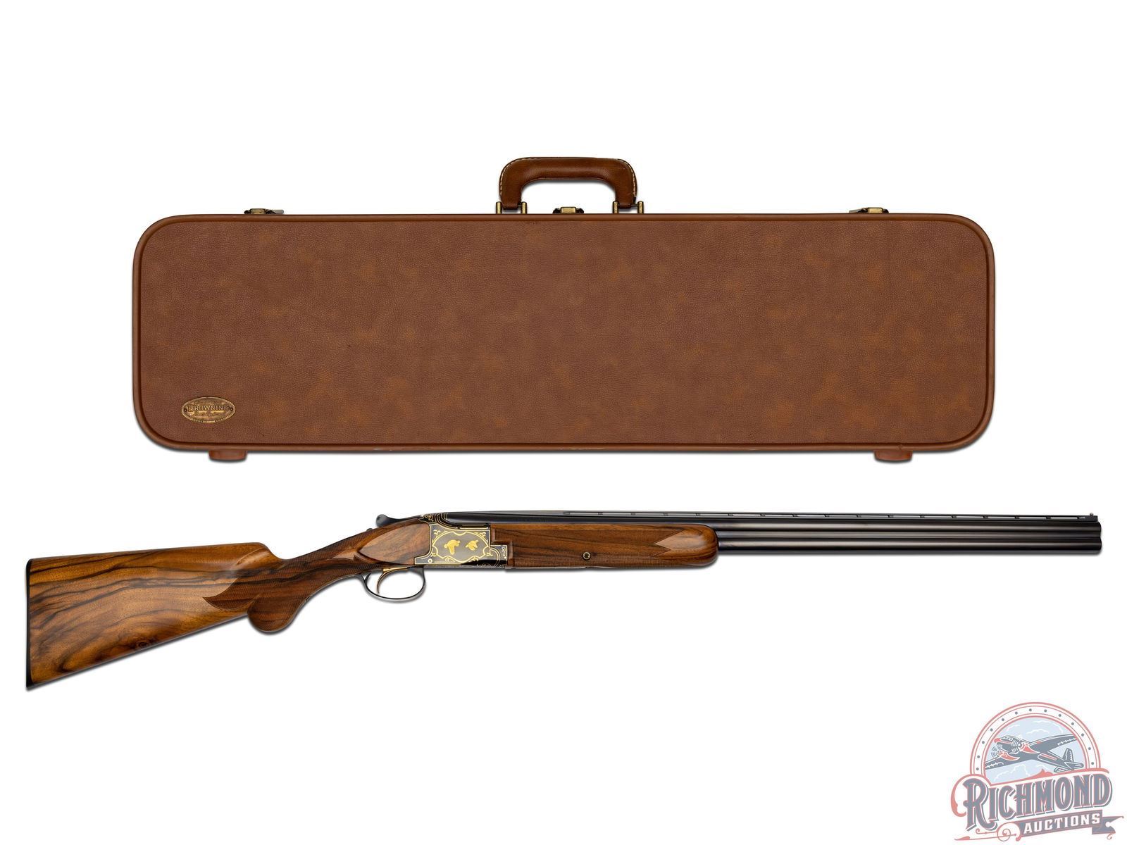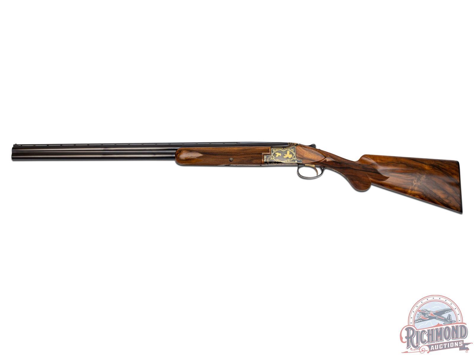 Manufactured in 1964 for Browning by FN in Belgium. Blued 28" O/U steel barrels with ventilated rib, single bead with fixed modified and improved cylinder and 3" chamber and ejectors. Blued action and barrel done by Paul Fuch, formally of Browning's Repair & Restoration Shop in St. Louis, Missouri. The action and barrels are engraved and inlayed in 24 kt gold in Browning Exhibition Forum by Jimmy Nixon. gold-plated single trigger with top tang safety selector. Gun is fitted with standard Browning Exhibition Form checkered round knob pistol grip and Browning hard rubber butt plate. English walnut stock fitted by Jack Haugh. Matching checkered sporting type forearm. Comes in original Browning luggage case with paperwork and history. This is an exceptional shotgun that would be an excellent addition to any collection. Weight: 6lbs. 6oz. LOP: 14-1/4". DAC: 1-3/8". DAH: 2-1/4". CALIBER: 20 GA. S/N: 34007V4. FFL STATUS: Curio & Relic.