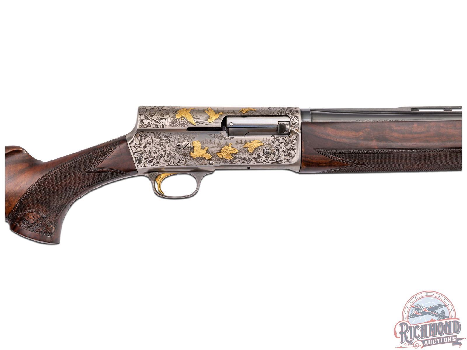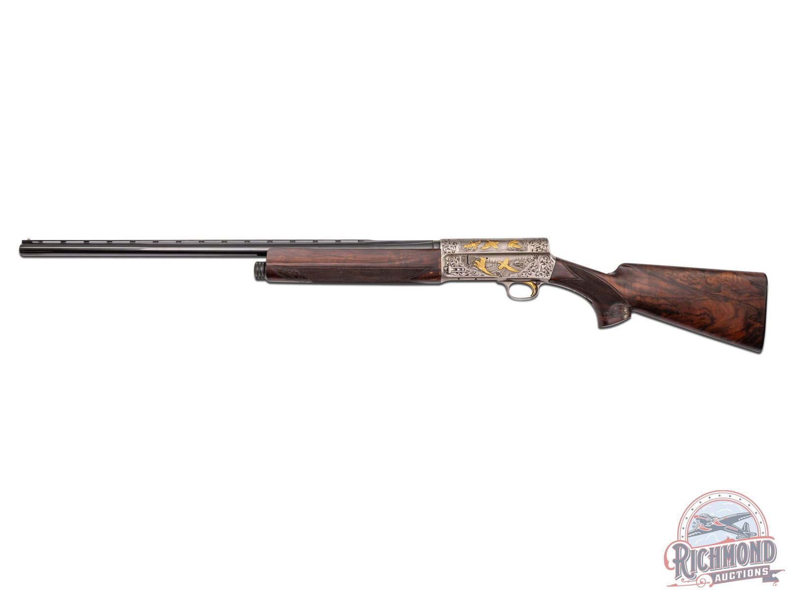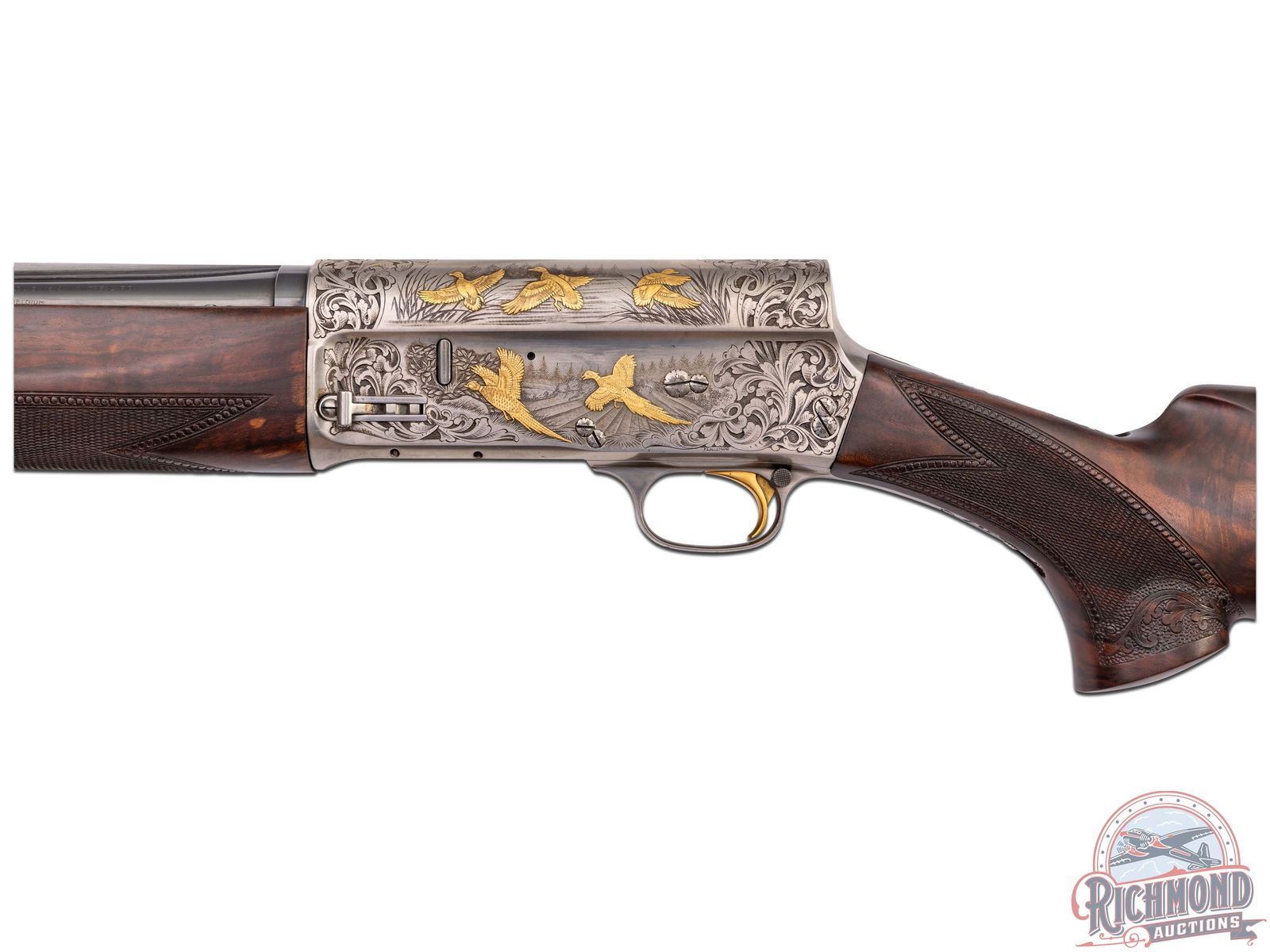 Made in Herstal, Belgium by Browning in 1972. Very little information is available on this gun and it might be a special ordered custom shop gun. 25-1/2" blued Special Steel barrel with Modified choke, 3" chambers, ventilated rib, and bead front sight. Barrel is marked with Browning St. Louis and Montreal addresses. Satin finish action with floral engraving and 3 gold flying quail on right and 3 gold flying ducks on top with 3 flying ducks and 2 flying pheasants in gold on left with engraver's signature "P. Lallemand". Fine Circassian walnut pistol grip stock with checkered grip with floral and chain engraved border. Stock is fitted with Browning butt plate. Matching walnut checkered forearm with floral and chain carved border. LOP: 14-1/4". DAC: 1-1/2". DAH: 2". CALIBER: 20 GA. S/N: 72X48416. FFL STATUS: Curio & Relic.