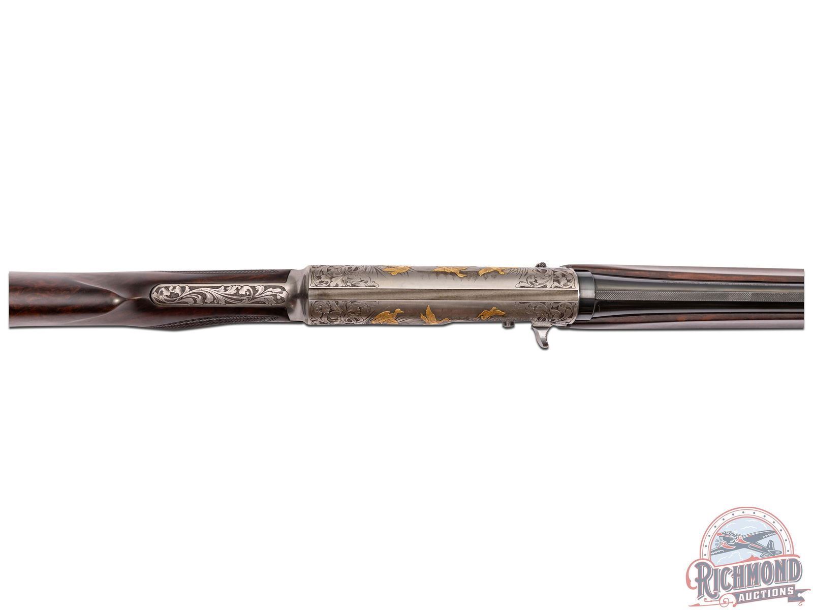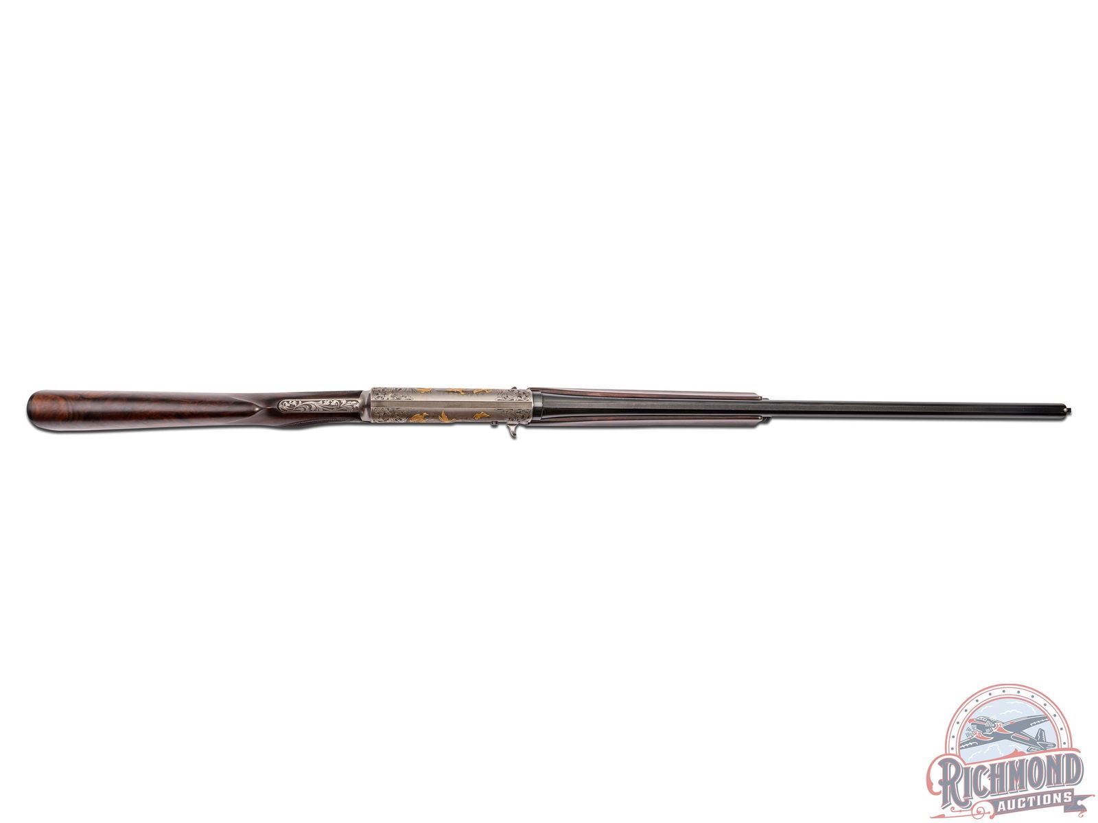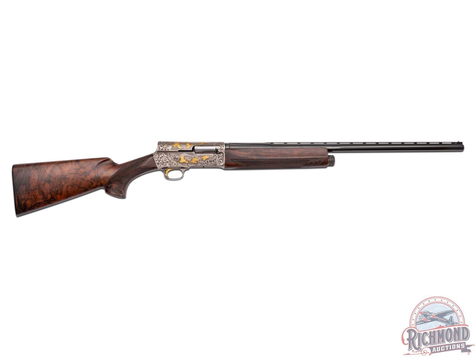 Made in Herstal, Belgium by Browning in 1972. Very little information is available on this gun and it might be a special ordered custom shop gun. 25-1/2" blued Special Steel barrel with Modified choke, 3" chambers, ventilated rib, and bead front sight. Barrel is marked with Browning St. Louis and Montreal addresses. Satin finish action with floral engraving and 3 gold flying quail on right and 3 gold flying ducks on top with 3 flying ducks and 2 flying pheasants in gold on left with engraver's signature "P. Lallemand". Fine Circassian walnut pistol grip stock with checkered grip with floral and chain engraved border. Stock is fitted with Browning butt plate. Matching walnut checkered forearm with floral and chain carved border. LOP: 14-1/4". DAC: 1-1/2". DAH: 2". CALIBER: 20 GA. S/N: 72X48416. FFL STATUS: Curio & Relic.