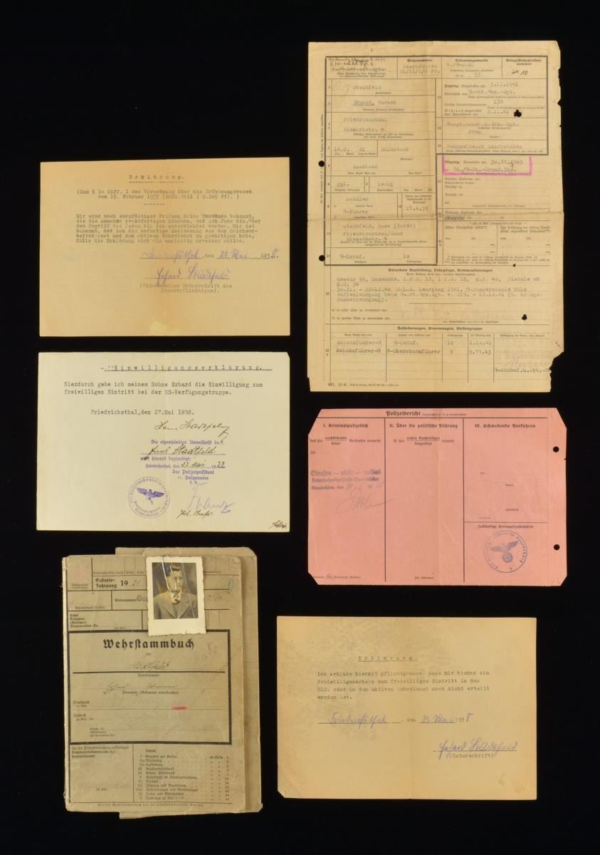 A multipage booklet & associated paperwork housed in a foldable cover file w/ photo for SS Sturmbannfuhrer Erhard Werner Stadfeld. The booklet & paperwork contain various information pertaining to Stadfeld’s life & service including what appears to be service in many SS units including the Deutschland Division & the Nord Division. He had extensive service in the north of Finland & appears to have served w/ distinction. The documents have many German Party eagle stamps from various organizations & divisions. An extremely rare & difficult WWII German artifact to locate that seldom comes to market. CONDITION: paperwork shows wear to edges & corners. Most paper is discolored but writing is easily legible. Official ink stamps are clear & vivid. Photograph is creased but clear. (02-14905/BF). $800-1,500.