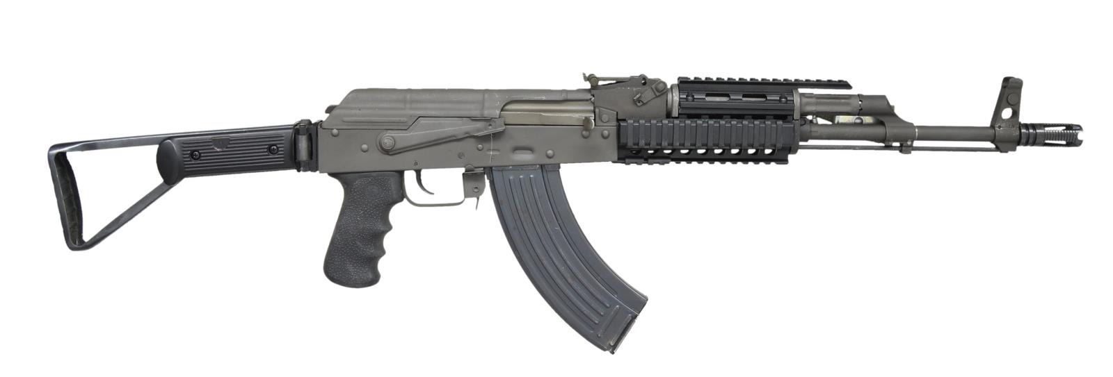 NDS RECEIVER. Cal. 7.62x39. S# M007878. Bbl. 16". An AK47 style rifle built on a NODAK Spud stamped receiver, utilizing what is an extremely accurate Polytech style right side folding stock. Left hand threaded muzzle w/ American made muzzle brake. Protected post front sights & bayonet lug hosts on board cleaning rod. Front rail section replaces traditional handguards w/ picatinny mounting positions at 3, 6, 9, 12 o’clock. A Hogue pistol grip. Right side controls. Matching parkerized finish on all exposed metal surfaces. Rear tangent sight marked to 1000m. Sling mounting on left side w/ green canvas sling. MAGS: 1-30 rd. metal. UNATTACHED ACCESSORIES: VISM canvas transport bag. CONDITION: finish on all exposed metal surfaces is complete & correct. Folding stock locks in both open & closed position. Rails appear not to have hosted any accessories preciously. Muzzle threads are free & clear. Bore is shiny w/ well pronounced rifling. Fire control mechanism appears to function correctly when cycled by hand. (21-778/JZ). MODERN. $500-800.