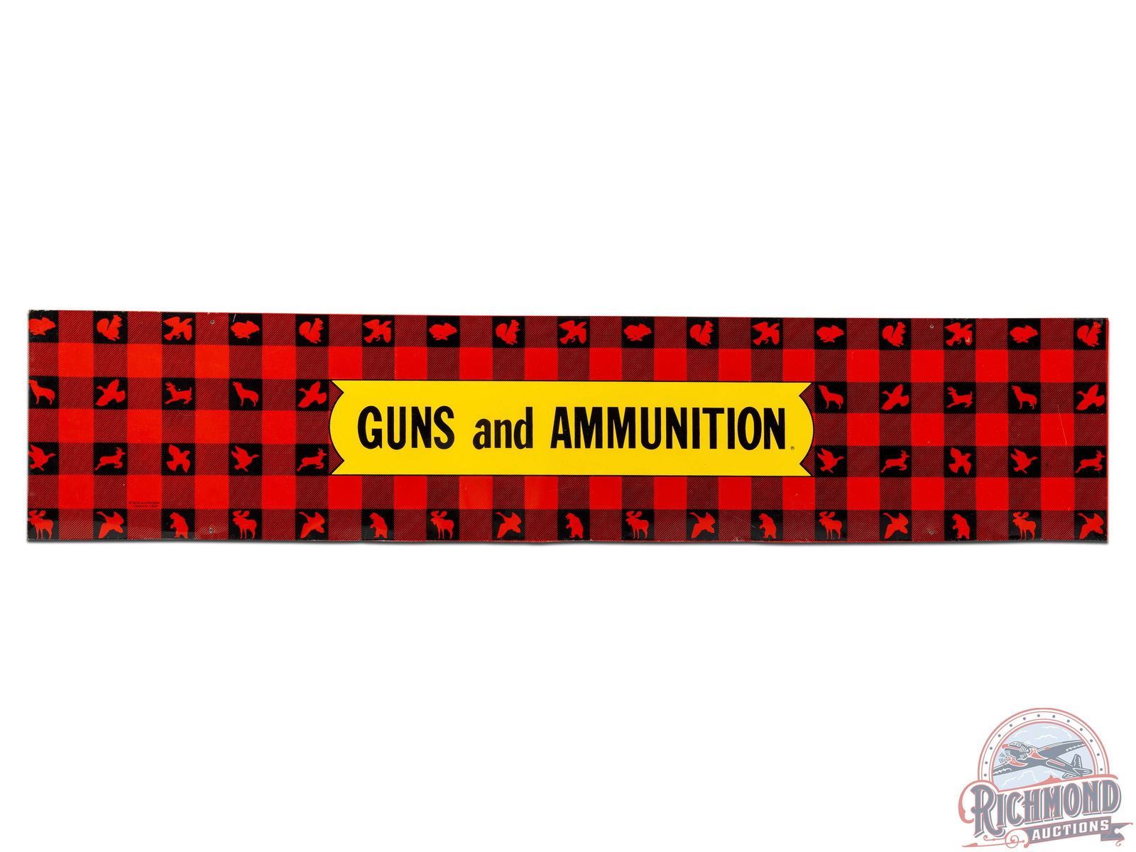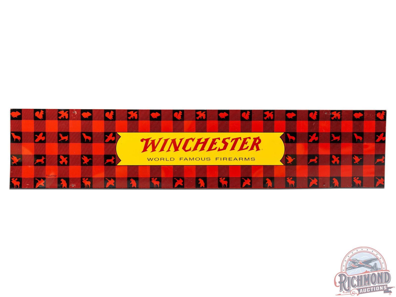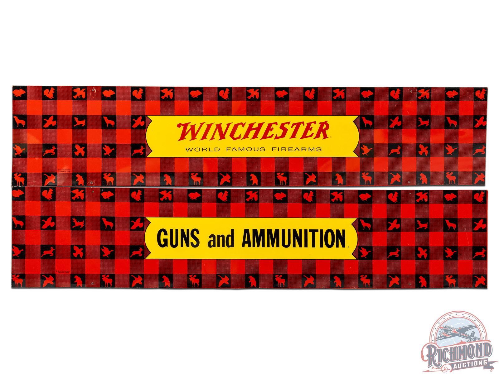 Pair of SST (single sided tin) strip signs with great color and shine. One reads "Guns & Ammunition" and the other "Winchester World Famous Firearms." Iconic Winchester plaid used in the 1960's and 1970's. Both signs are in similar condition with light storage wear including surface scratches and edge wear. Some additional wear around the mounting holes due to hanging. Both are marked Olin Mathieson Chemical Corp along bottom left. 10" H x 47" W.