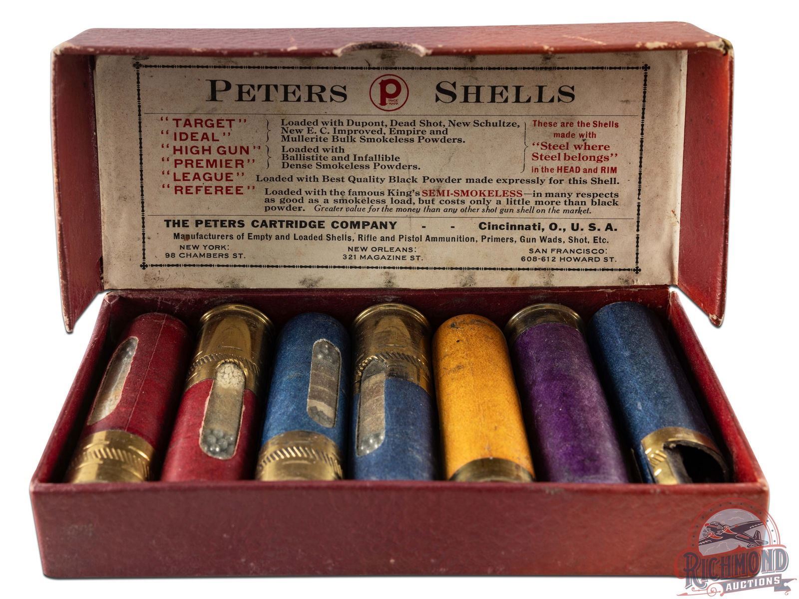 Peters Cartridge Company of Cincinnati, Ohio shotgun shell dummy sample kit with "Target, Ideal, High Gun, Premier, League and Referee" Window shells in hinged purple scale carboard box.