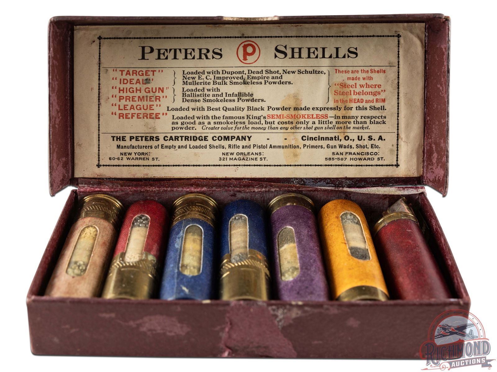 Peters Cartridge Company of Cincinnati, Ohio shotgun shell dummy sample kit with "Target, Ideal, High Gun, Premier, League and Referee" Window shells in hinged purple scale cardboard box.