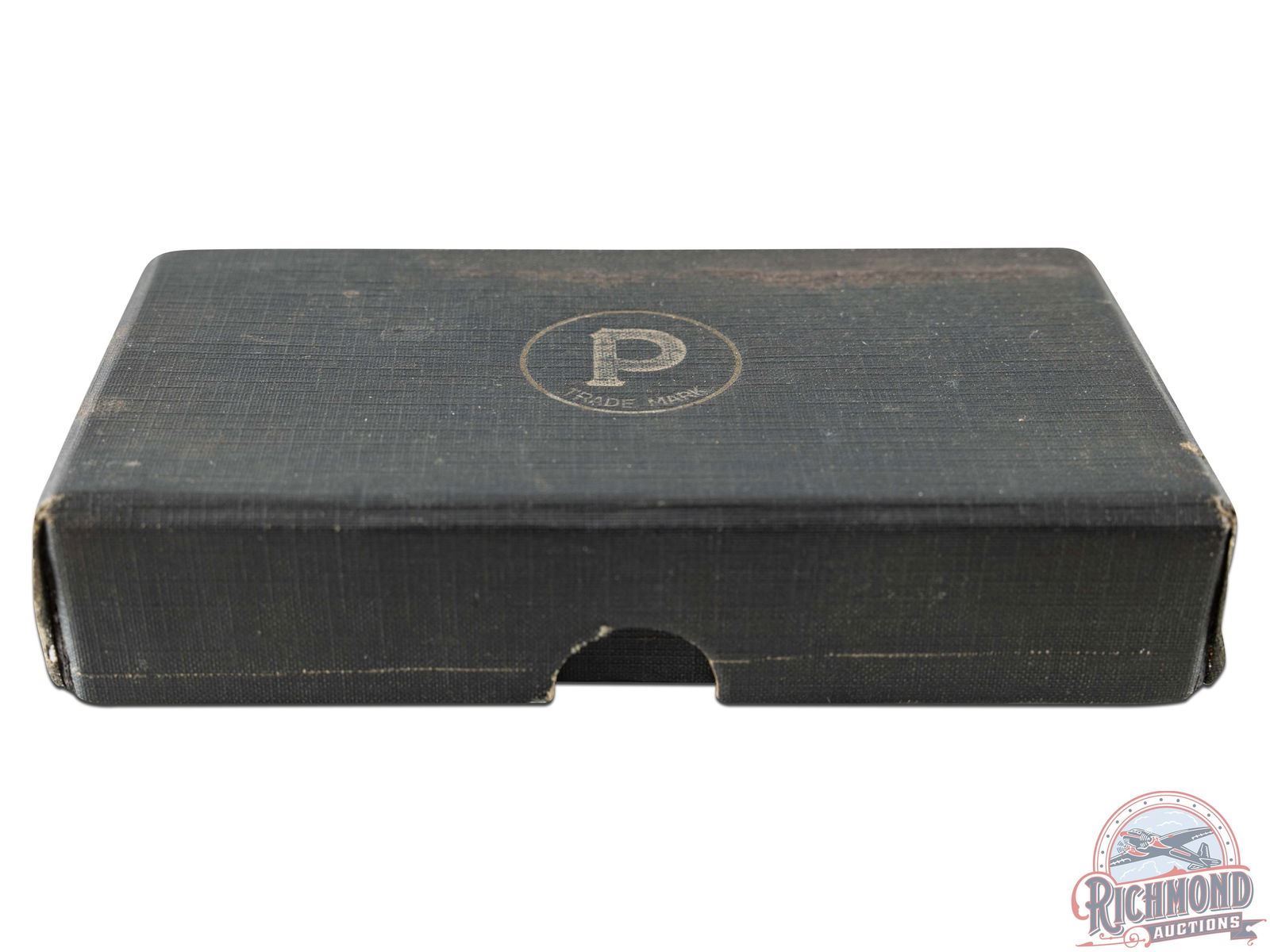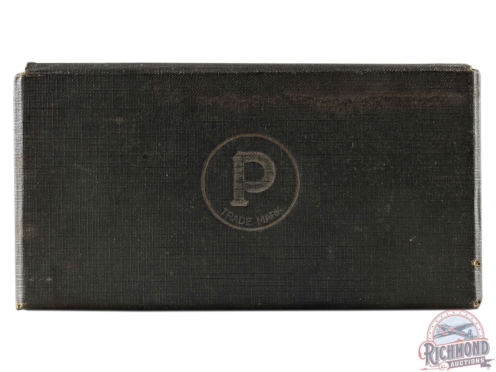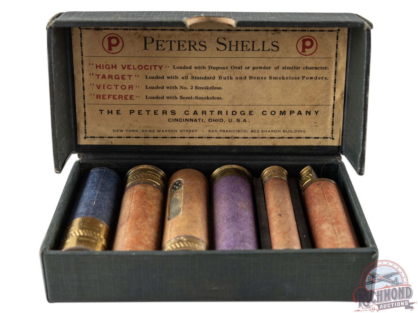 Peters Cartridge Company of Cincinnati, Ohio shotgun shell dummy sample kit with "High Velocity, Target, Victor and Referee" Window shells with 410 Victor shell. Kit is hinged lined black finish cardboard case with gold gilt "P" in circle lid logo.