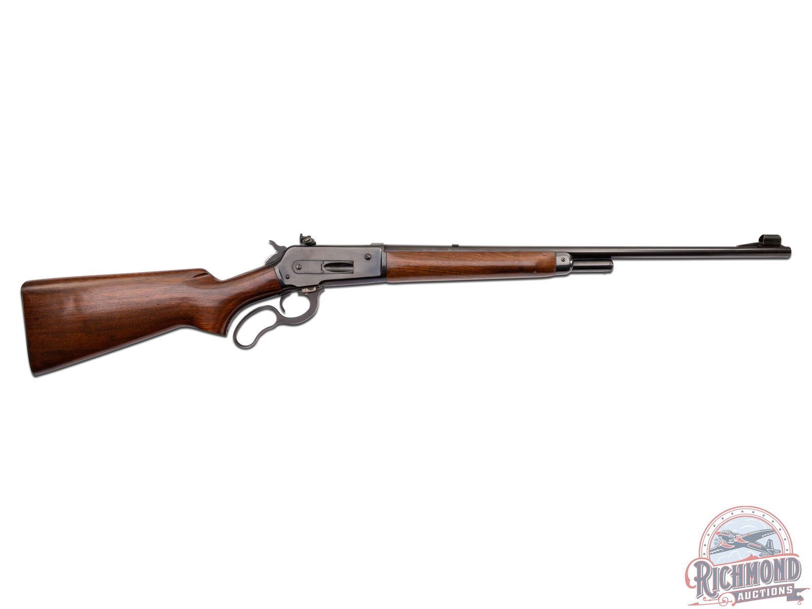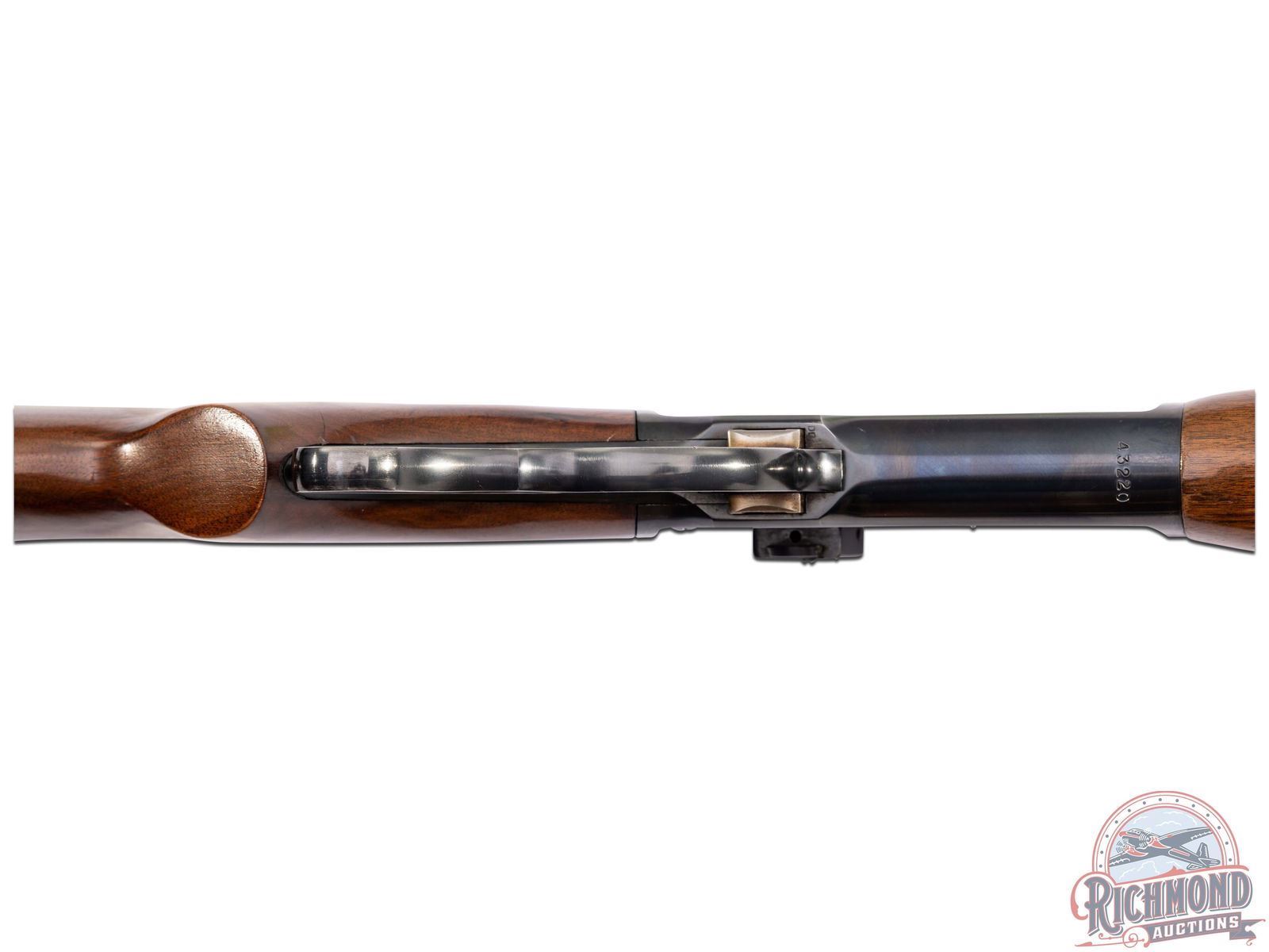 Manufactured in 1955 with all clear and standard Winchester roll marks and proof marks. Features a 24" blued barrel with ramp blade front sight and bolt mounted Lyman 66A rear adjustable peep sight. Blued receiver with side loading gate. Smooth walnut short tang stock with pistol grip. Fitted with a factory checkered metal butt plate. LOP: 13-1/4". CALIBER: 348 WCF. S/N: 43220. FFL STATUS: Curio & Relic.