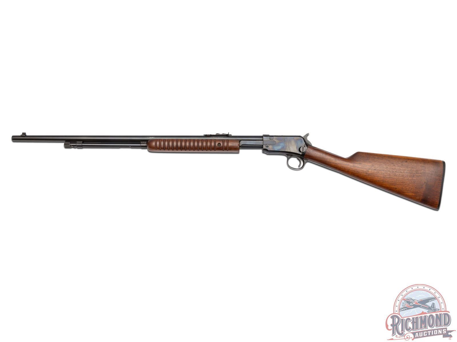Made by Winchester Repeating Arms in 1954. Fitted with 23" blued Winchester Proof Steel round barrel with standard sights, Winchester model/address/caliber marking with blued tubular magazine in 22 Short, Long, Long Rifle caliber. Blued visible hammer takedown frame with plain trigger. Standard walnut plain stocks with flat bottom corrugated slide handle. Butt stock fitted with Winchester hard rubber butt plate. CALIBER: 22 S/L/LR. S/N: 326767. FFL STATUS: Curio & Relic.