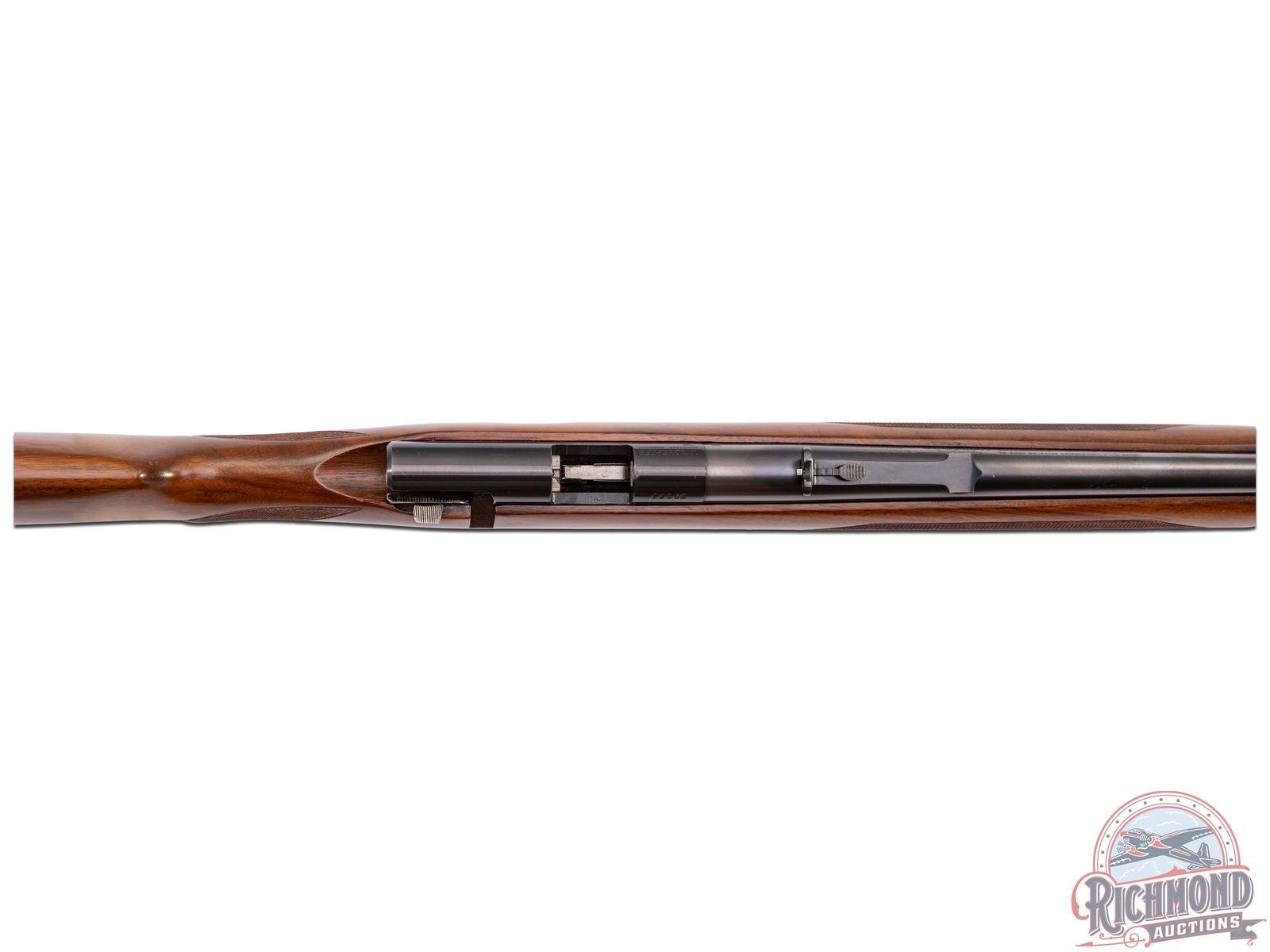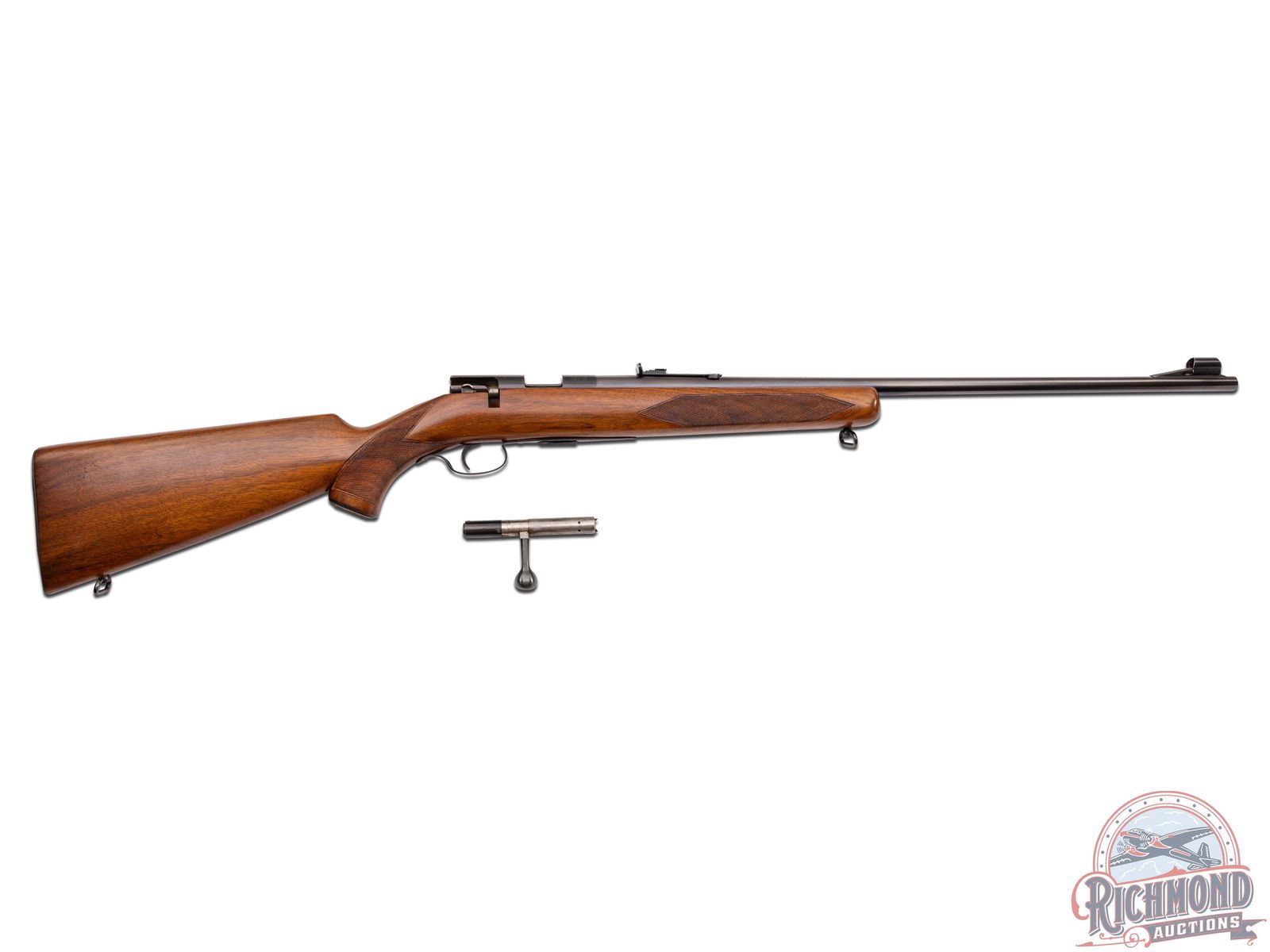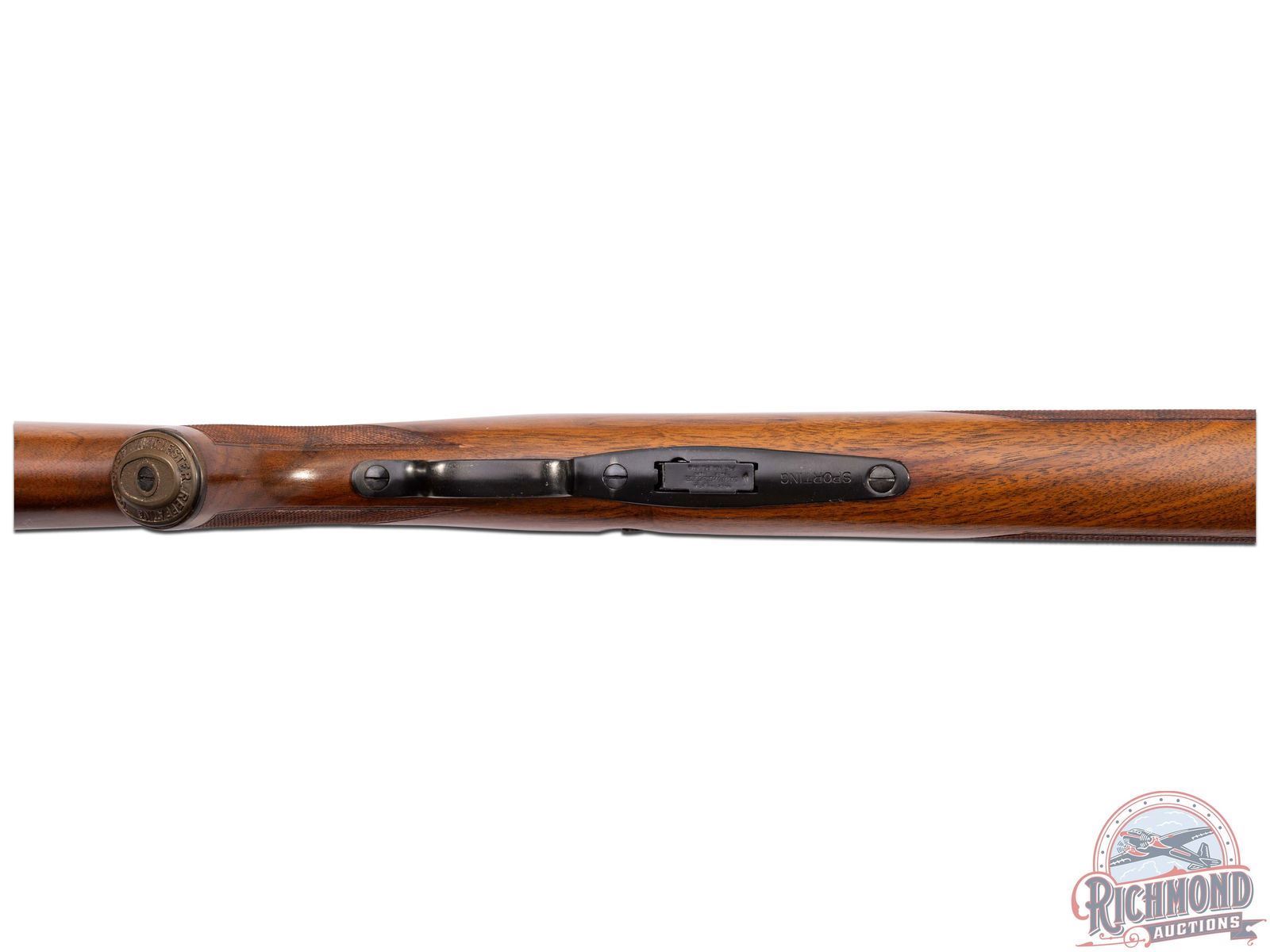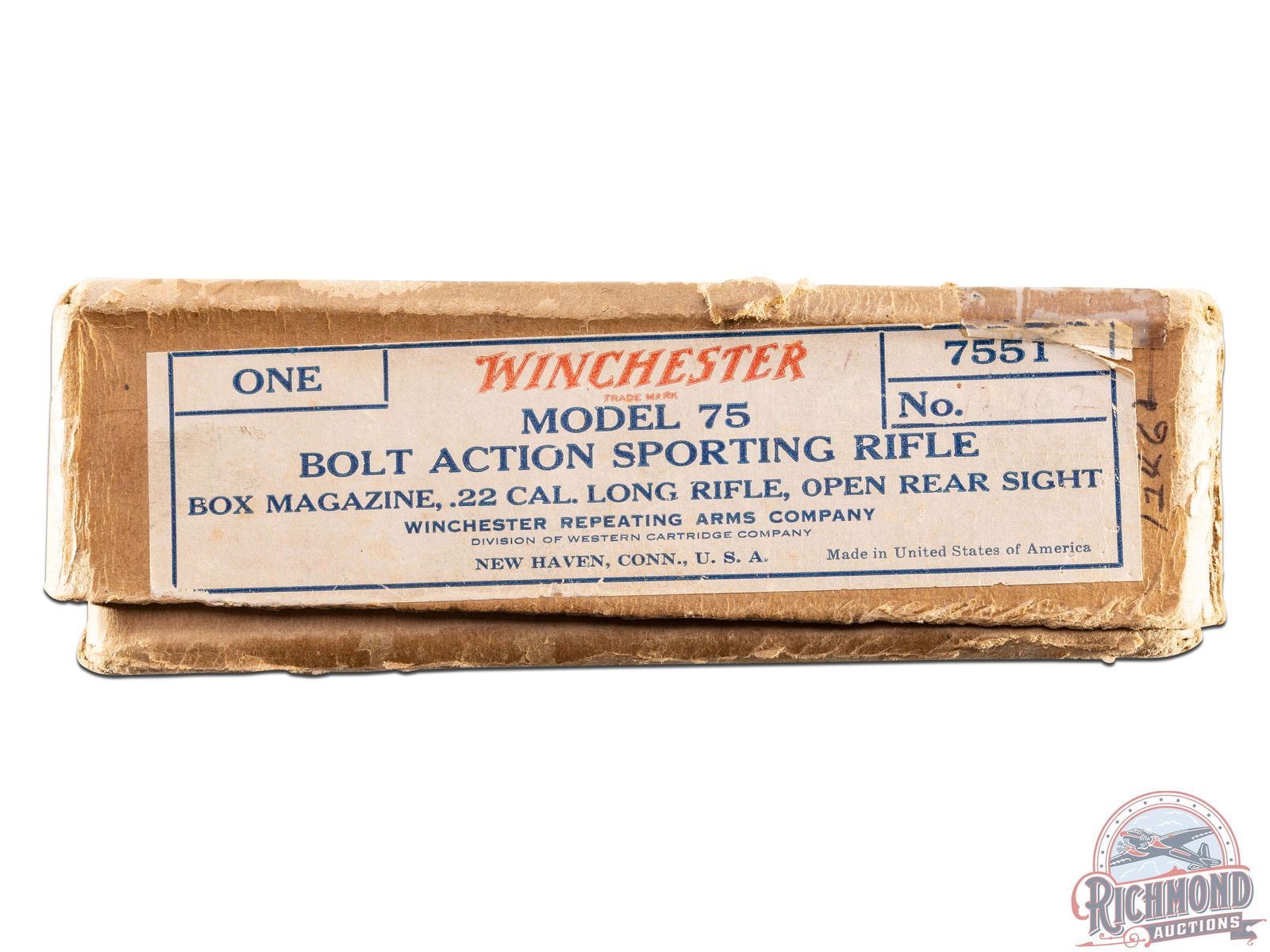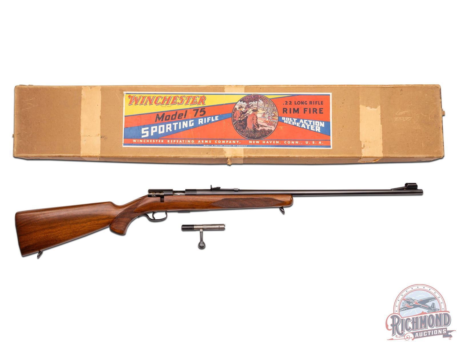 This model 75 Sporting Rifle was manufactured in 1940 and today is still in unfired condition in the original box. Features a 24" blued barrel with all standard Winchester roll marks and proof marks. Front hooded ramp sight with brass bead and rear Buckhorn adjustable sight. Nice hand checkered walnut stock with sling rings. Fitted with a Winchester logo metal pistol grip cap and ribbed meta butt plate. Includes the original factory detachable magazine, original factory box and instruction manual. LOP: 13-1/2". CALIBER: 22LR. S/N: 12462. FFL STATUS: Curio & Relic.