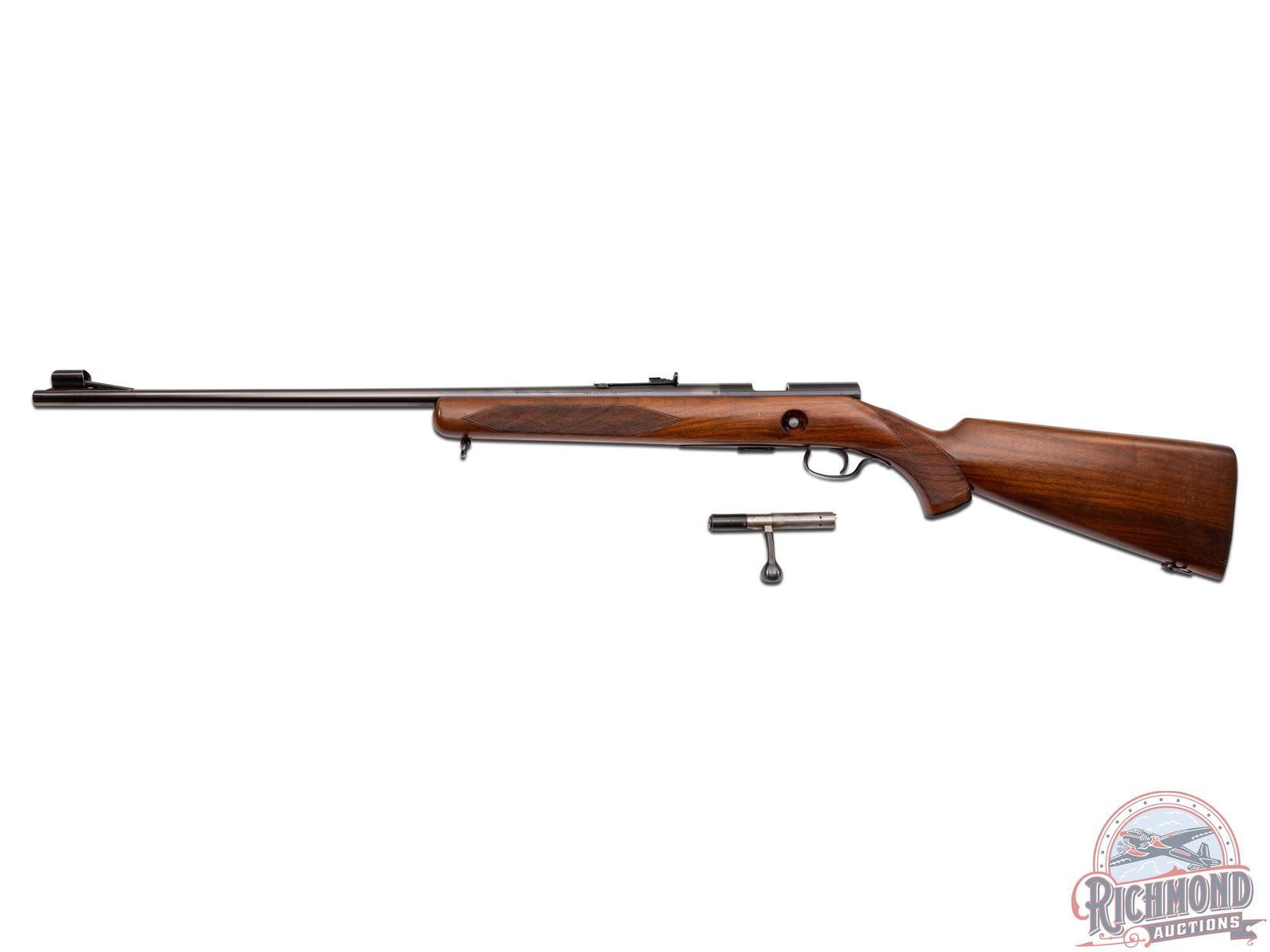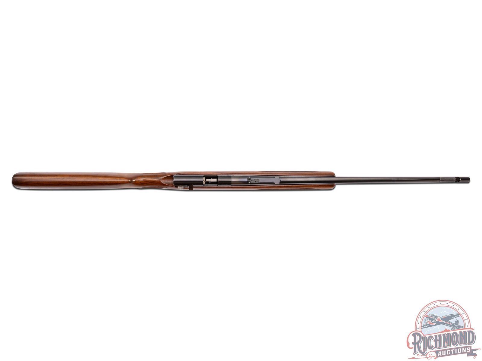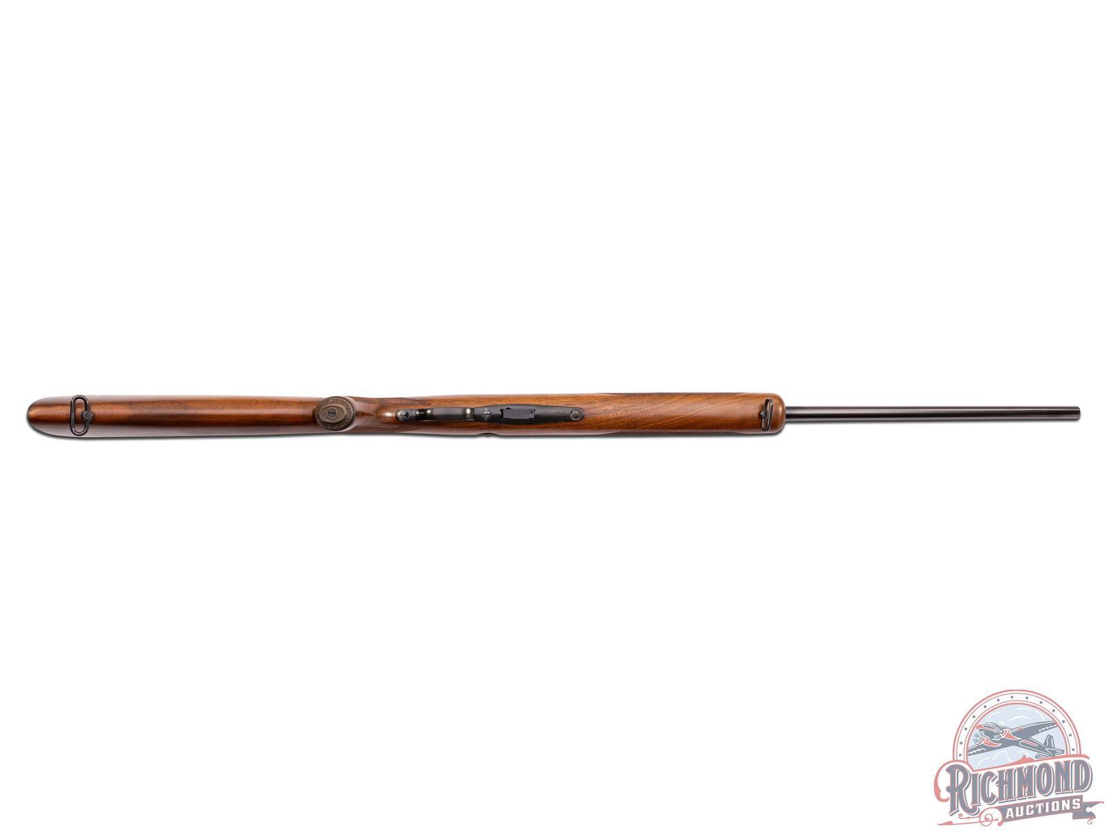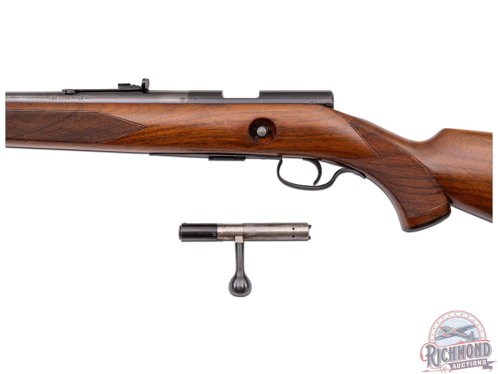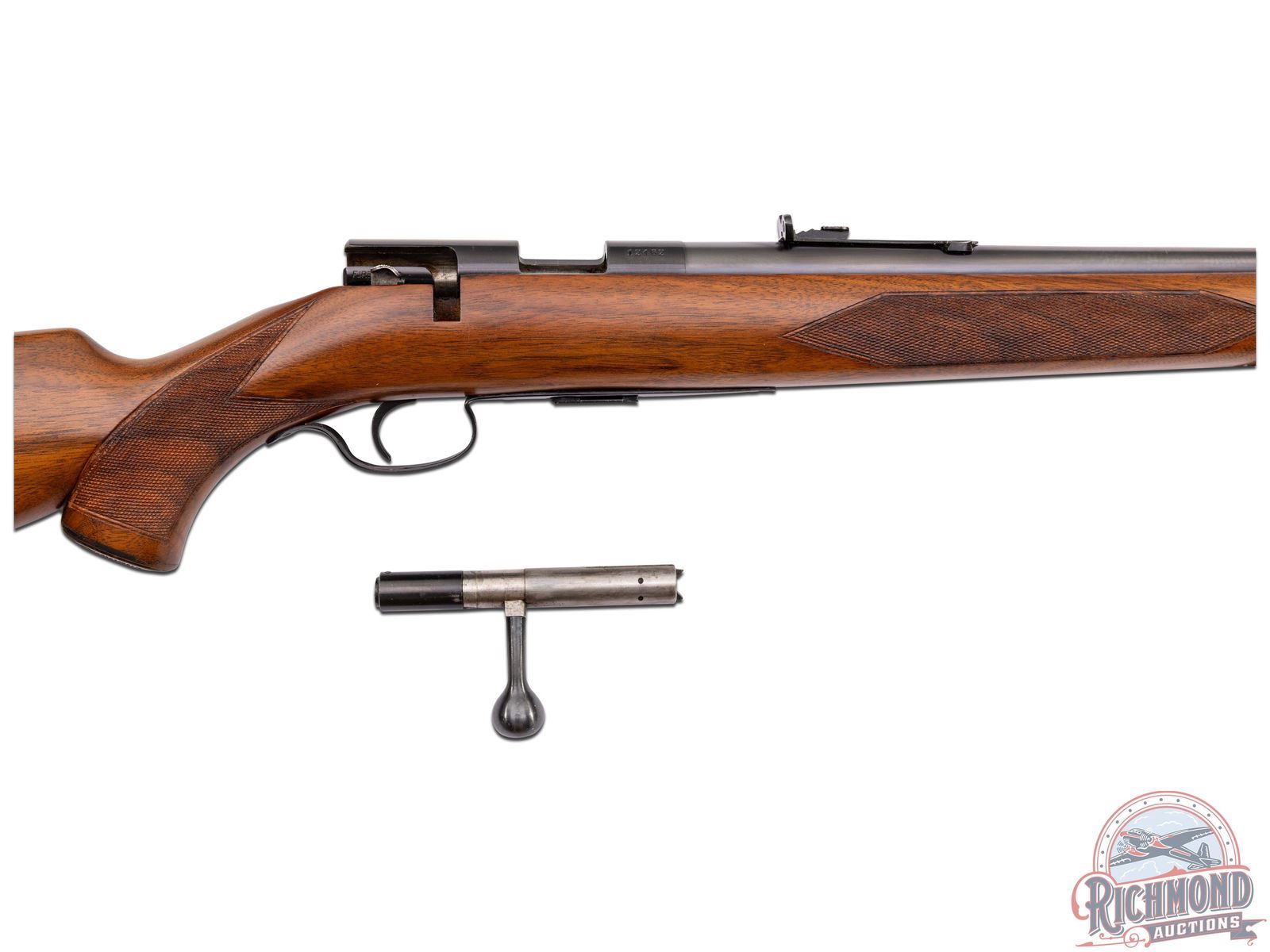 This model 75 Sporting Rifle was manufactured in 1940 and today is still in unfired condition in the original box. Features a 24" blued barrel with all standard Winchester roll marks and proof marks. Front hooded ramp sight with brass bead and rear Buckhorn adjustable sight. Nice hand checkered walnut stock with sling rings. Fitted with a Winchester logo metal pistol grip cap and ribbed meta butt plate. Includes the original factory detachable magazine, original factory box and instruction manual. LOP: 13-1/2". CALIBER: 22LR. S/N: 12462. FFL STATUS: Curio & Relic.