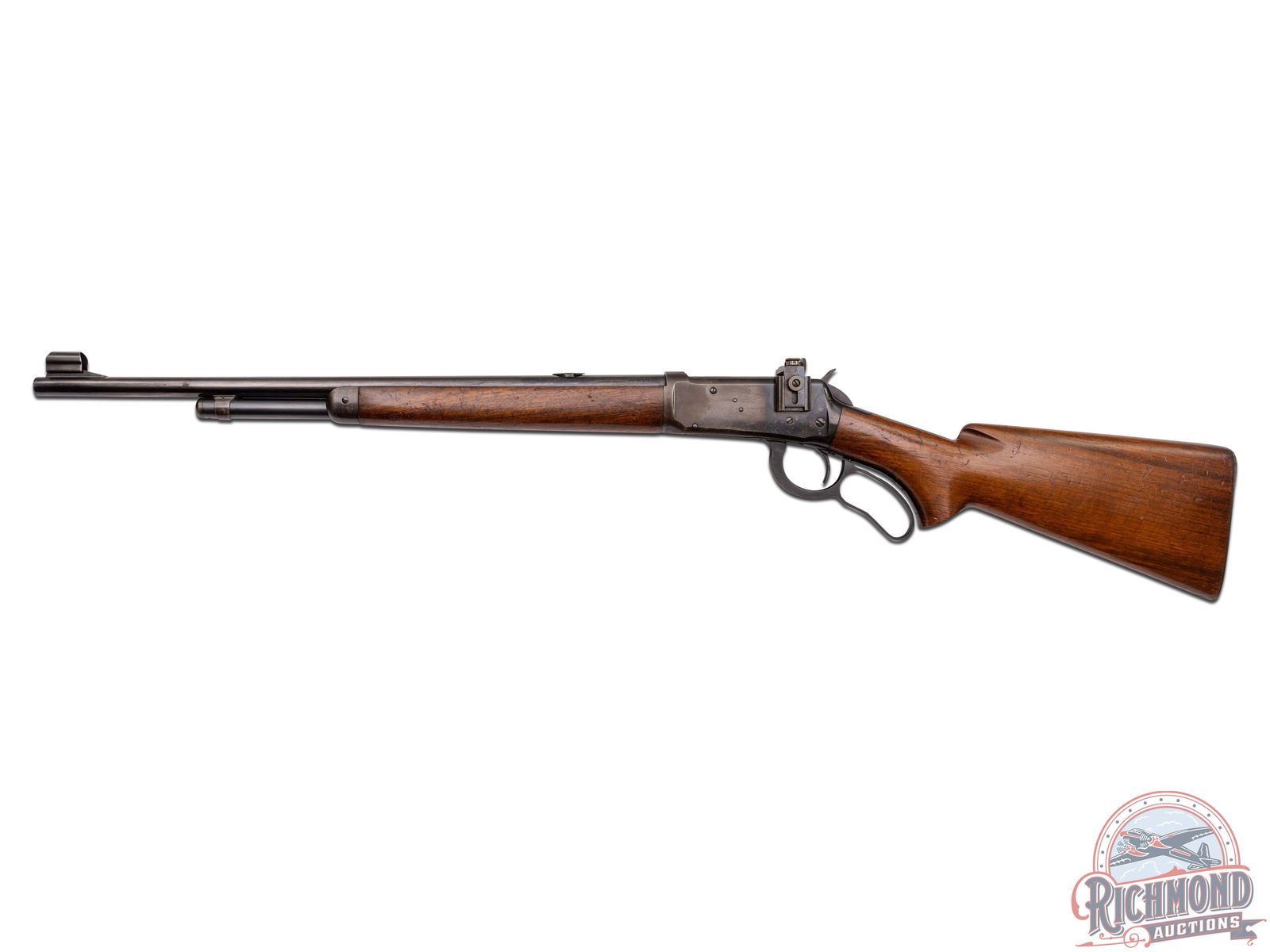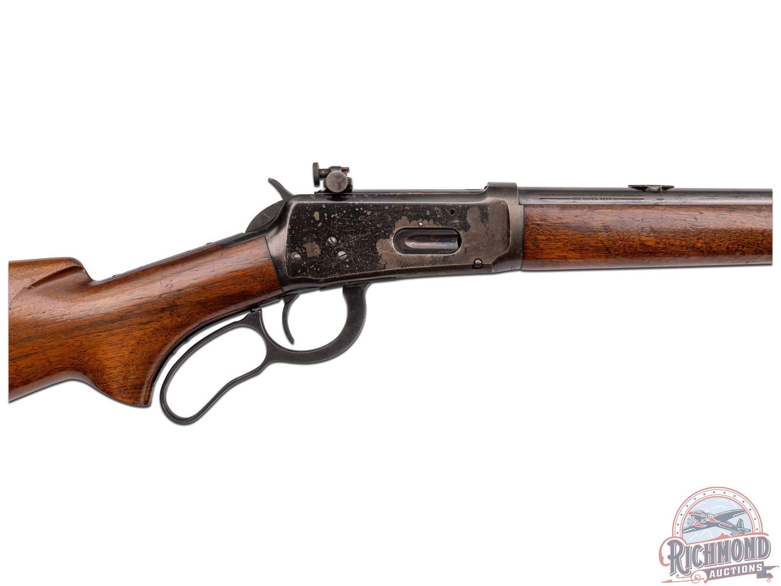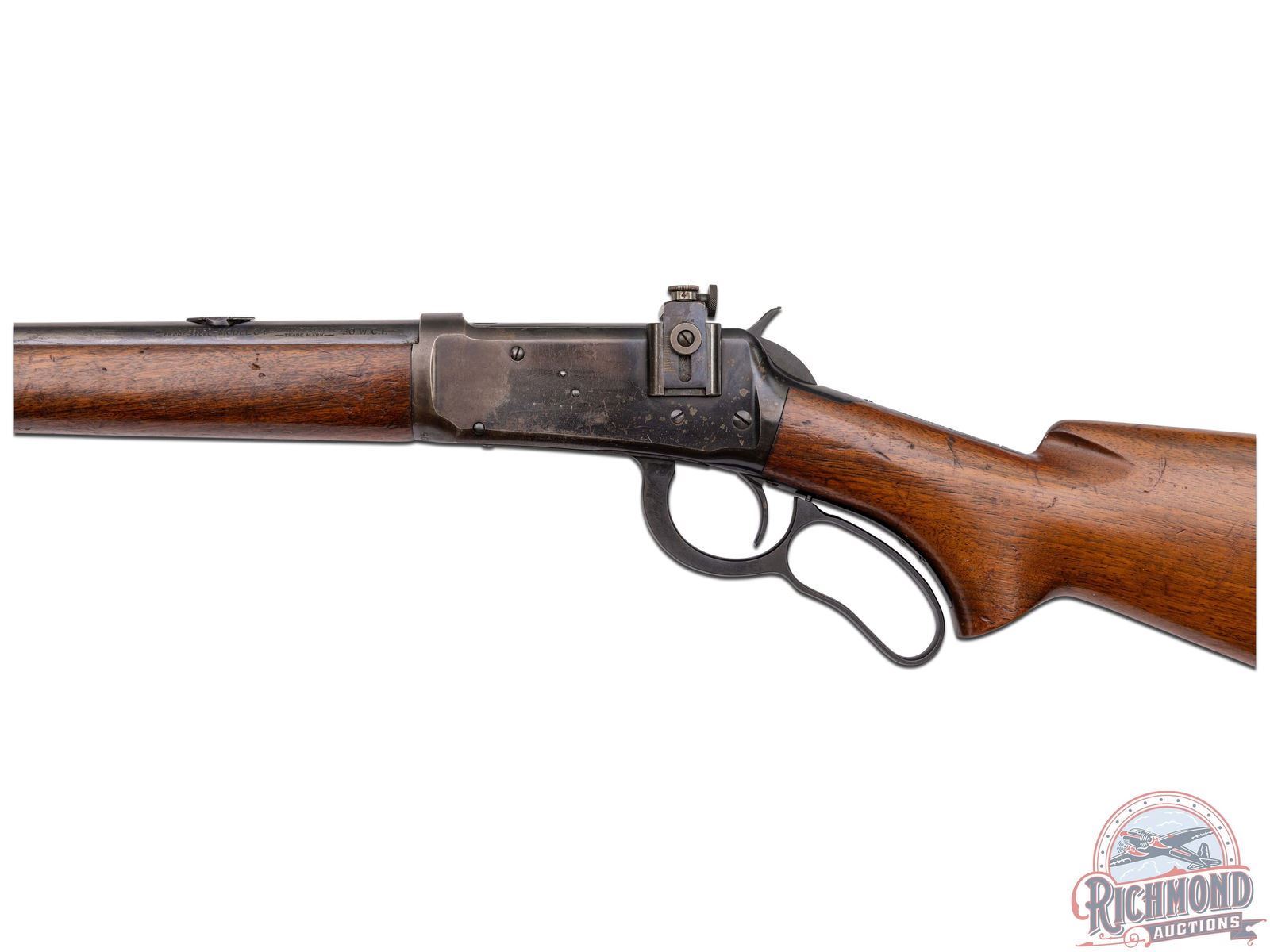 Manufactured in 1936. Features a factory carbine 20" blued barrel with carbine correct ramped hooded blade sight and 3/4 length magazine tube. Receiver mounted Lyman number 56 rear peep sight and Lyman barrel rear sight plug. Two-line Winchester address on the right side of the barrel and left side is stamped "WINCHESTER / PROOF STEEL / - MODEL 64 - / WINCHESTER / -TRADE MARK- / -30 WCF-". Winchester proof marks on the rear of the barrel as well on the top front of the receiver. Tang is also stamped with the three-line Winchester trade mark. Walnut wood stock with pistol grip and fitted with steel checkered butt plate. Matching forearm with steel cap. LOP: 13". CALIBER: 30 WCF. S/N: 1105095. FFL STATUS: Curio & Relic.
