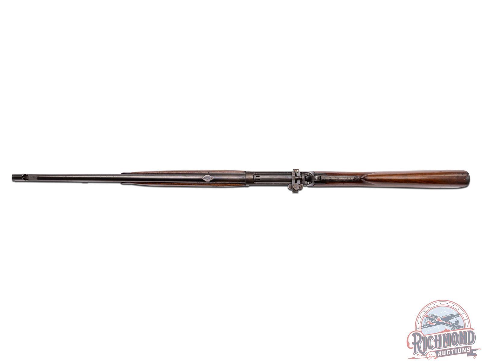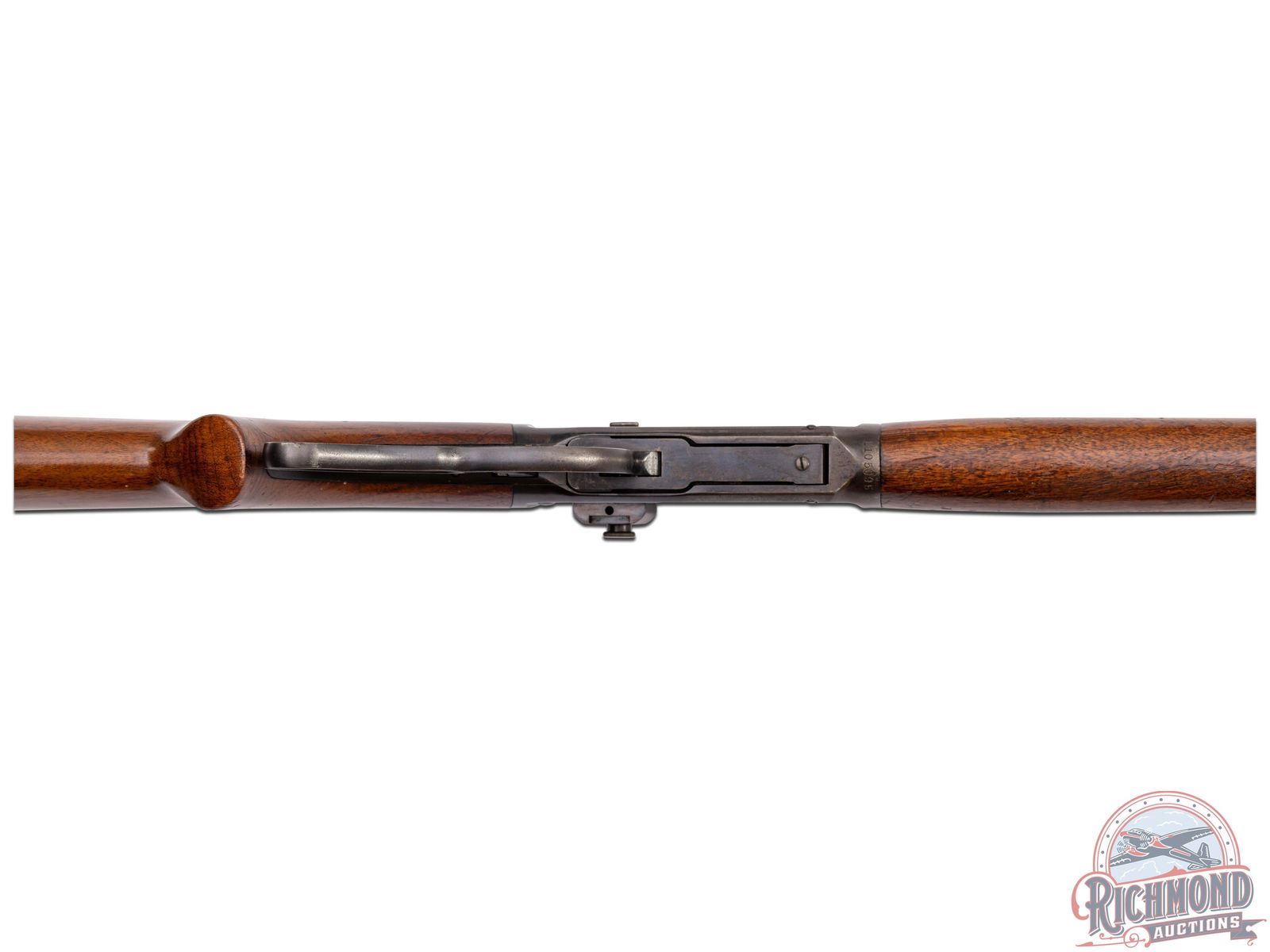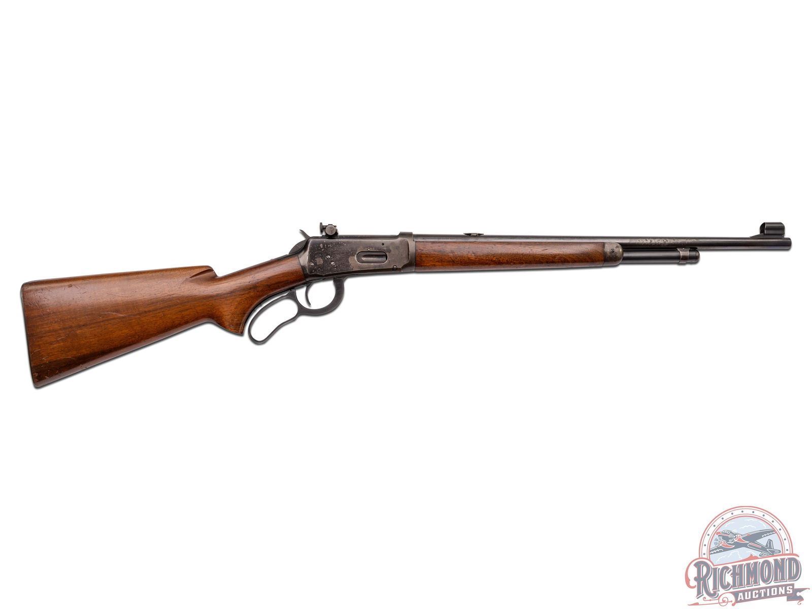Manufactured in 1936. Features a factory carbine 20" blued barrel with carbine correct ramped hooded blade sight and 3/4 length magazine tube. Receiver mounted Lyman number 56 rear peep sight and Lyman barrel rear sight plug. Two-line Winchester address on the right side of the barrel and left side is stamped "WINCHESTER / PROOF STEEL / - MODEL 64 - / WINCHESTER / -TRADE MARK- / -30 WCF-". Winchester proof marks on the rear of the barrel as well on the top front of the receiver. Tang is also stamped with the three-line Winchester trade mark. Walnut wood stock with pistol grip and fitted with steel checkered butt plate. Matching forearm with steel cap. LOP: 13". CALIBER: 30 WCF. S/N: 1105095. FFL STATUS: Curio & Relic.