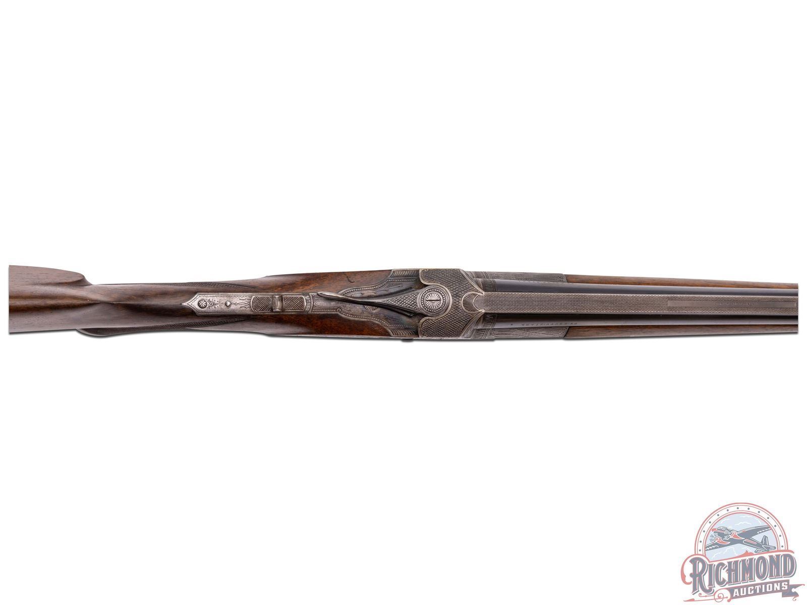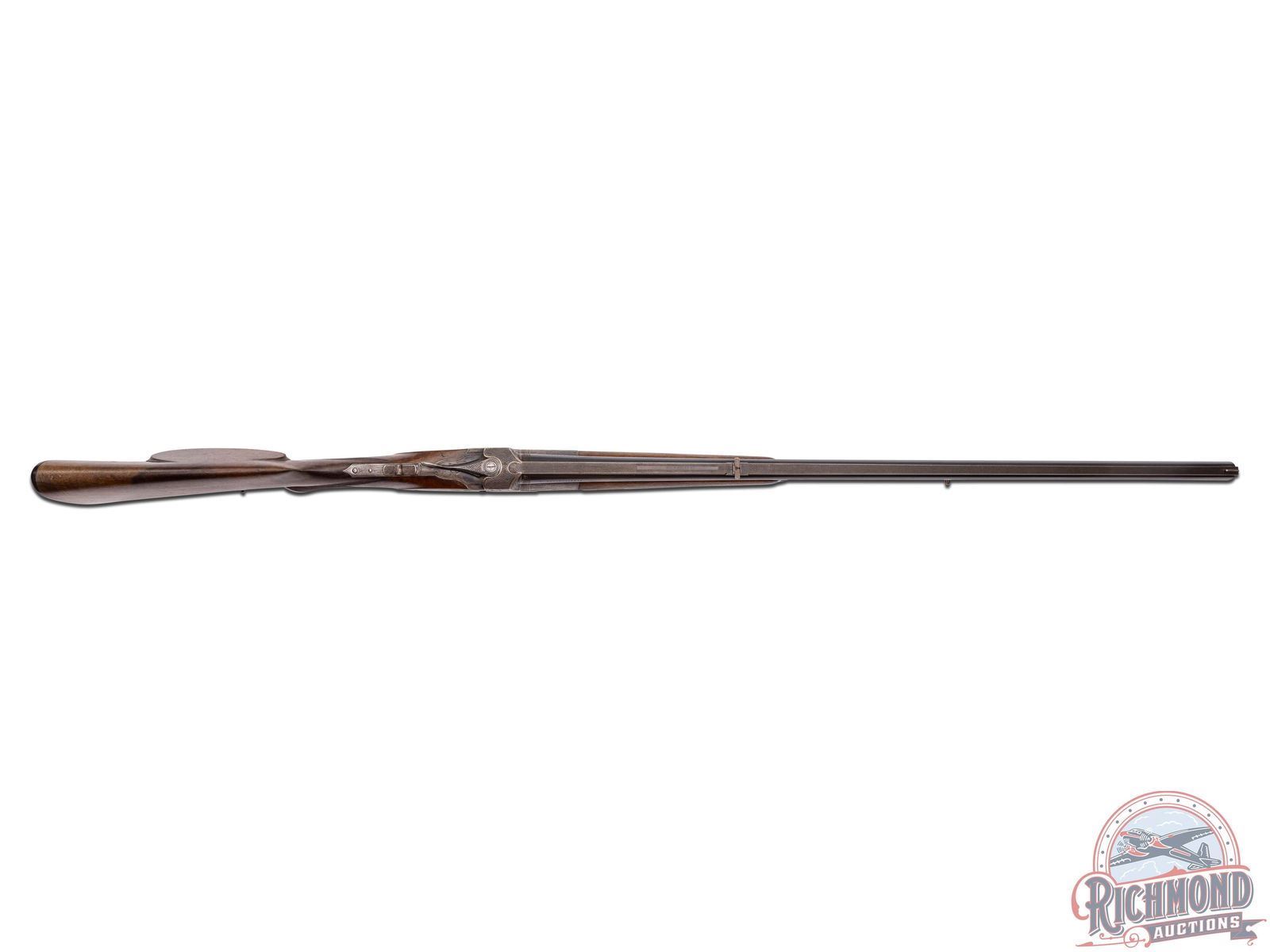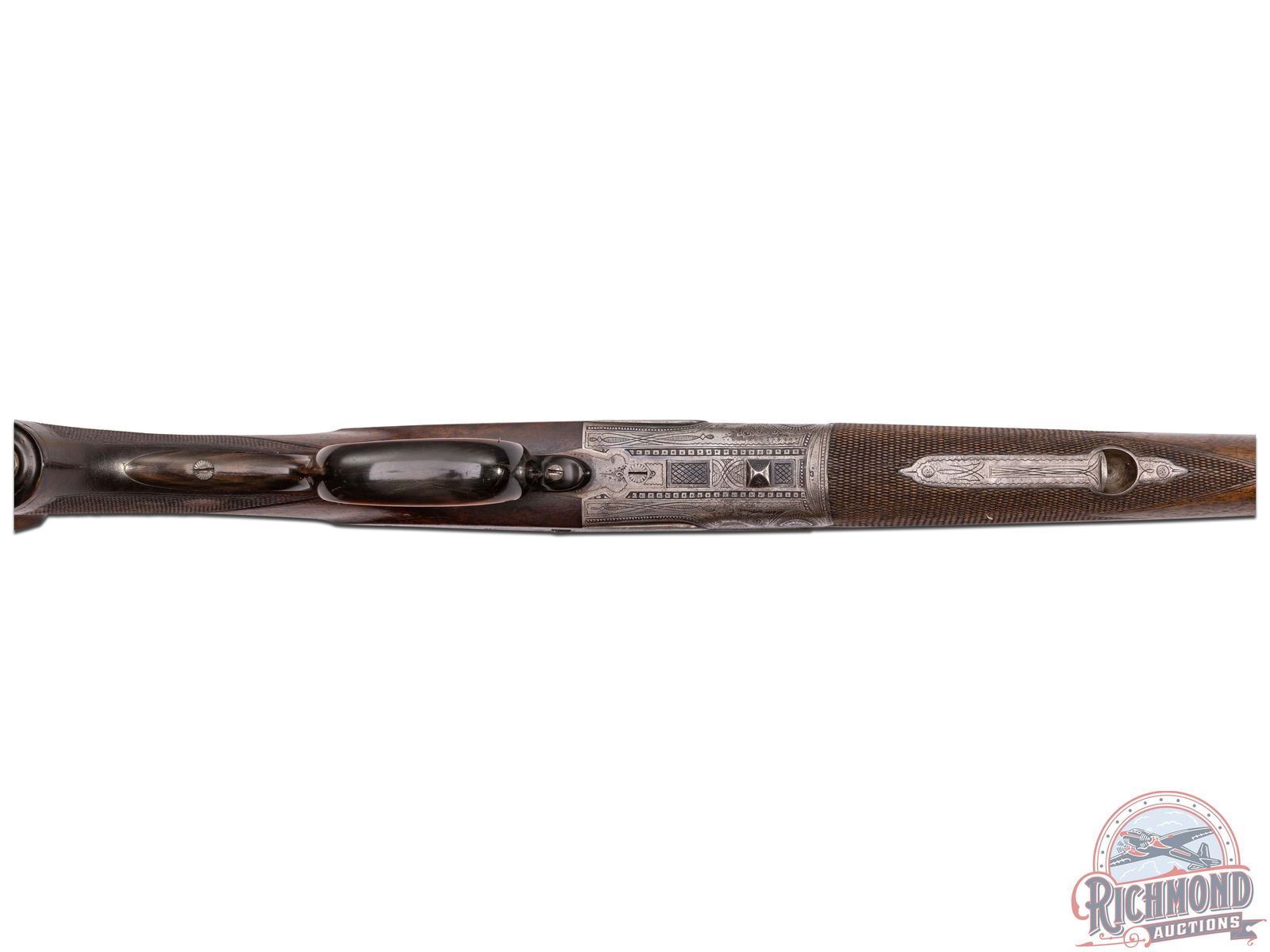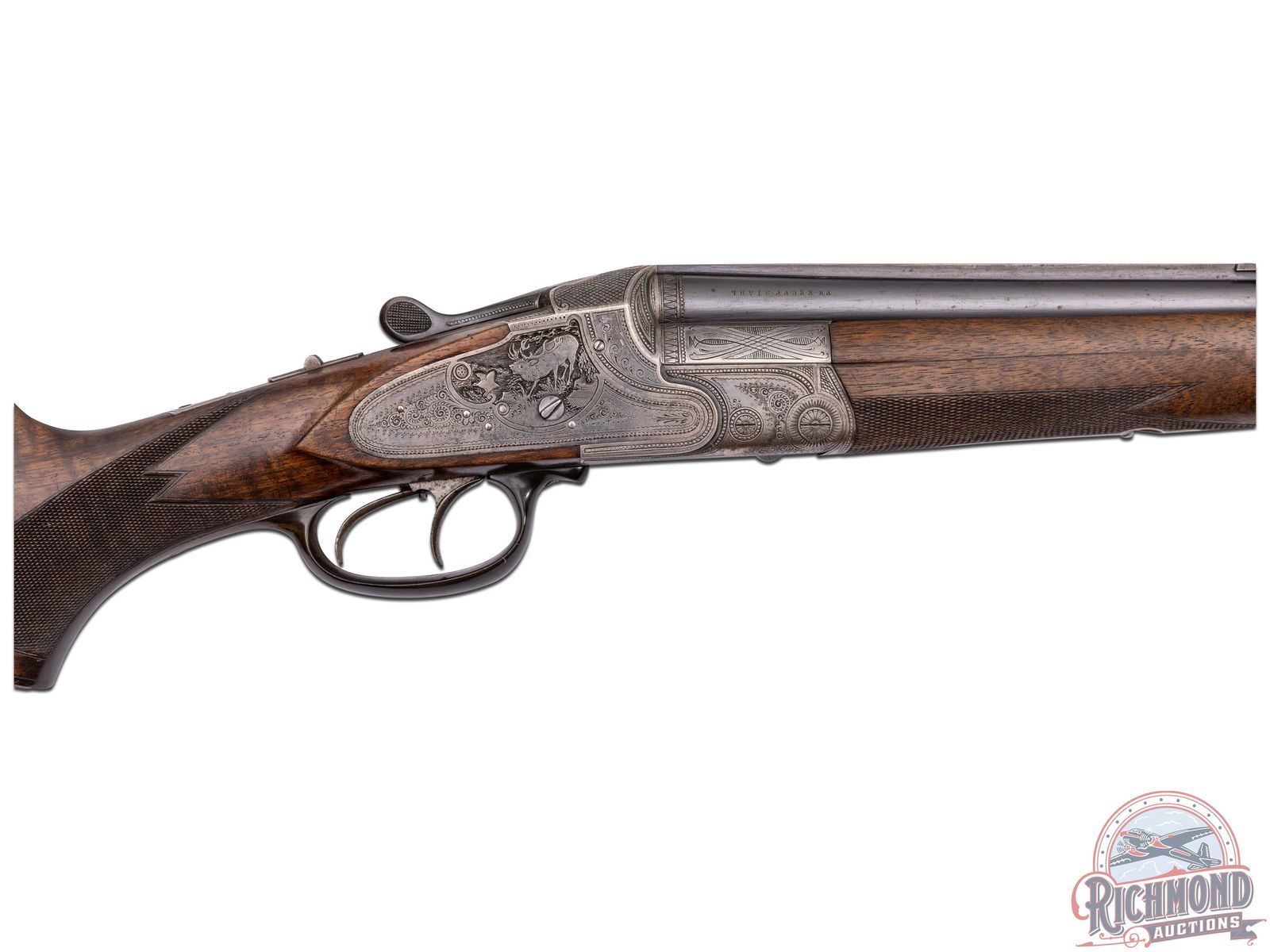 Overall 80% fading original barrel blue with edges worn silver and some light freckling. 10% fading action colors with sharp engraving. Wood has traces of original hand-rubbed finish with ding in checkering and some light scratches. Excellent bores and mechanics. Should have rifle caliber confirmed by qualified gunsmith.