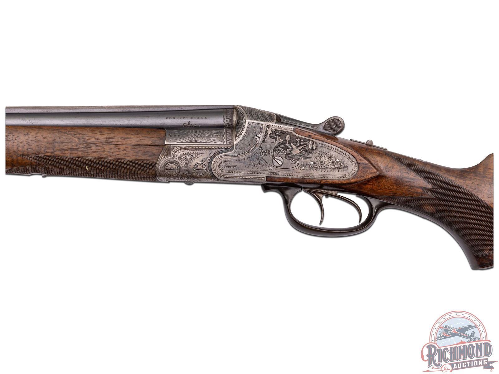 Made in Germany by J.P. Sauer in 1912. Blued 27" Krupp steel Nitro marked barrels in 16 gauge over 8x58R caliber. Barrels have raised maker marked matted rib, rifle sights, and extractors. Case-hardened full coverage engraved sidelock action with Doll's Head rib, double triggers (front is set), Holland and Holland cocking indicators, and top tang safety. Action has floral and vignette engraving with hirsch on right and deer and duck on left with block and line engraving on bottom of receiver . Rifle has horn trigger guard, butt plate, and grip cap. Walnut checkered pistol grip stock with right handed cheekpiece, and a fully engraved bullet trap with Bird scene. Matching walnut shaped checkered forearm with engraved latch release. LOP: 13-1/4". DAC: 1-1/2". DAH: 2-1/4". CALIBER: 16/8x58R. S/N: 11803. FFL STATUS: Curio & Relic.