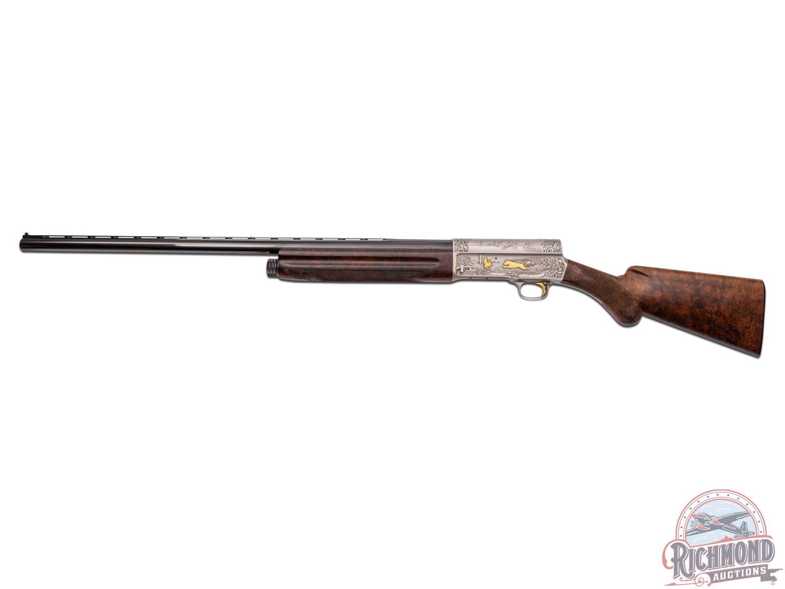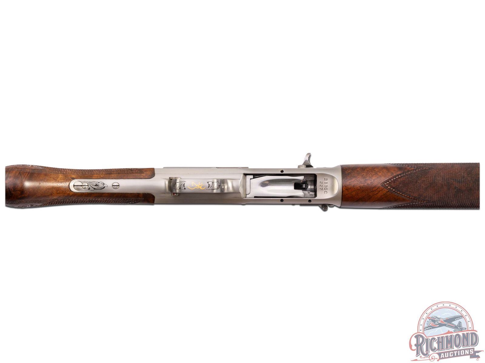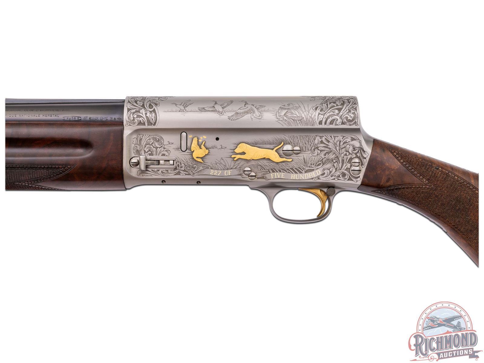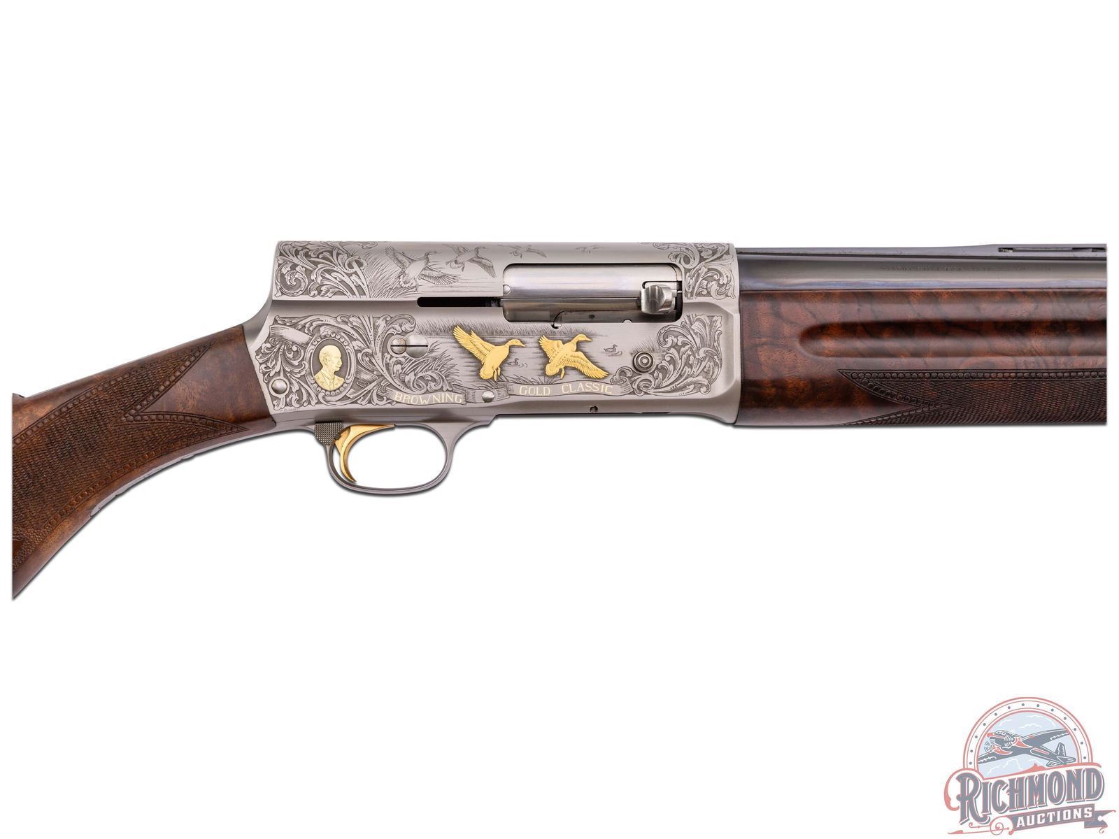 Manufactured in 1984 at FN in Belgium for Browning. Rare, number 227 of only 500 produced. Features a 28" blued ventilated rib barrel with white bead mid and front sight, choked Modified (**) and chambered for 2-3/4" shells. All standard Browning roll marks and proof marks. Beautiful coin finish receiver engraved and signed on the left side by Georges Marchal and the right side by H. Blanvalet. Right side features Gold inlaid landing ducks in a pond scene surrounded by deep-relief floral scroll and a gold inlaid silhouette of John Browning. Scroll banner at the bottom edge reads "BROWNING / GOLD CLASSIC" in gold lettering. Top "hump" has matching deep-relief floral scroll engraving with eight ducks total in flight. Left side features a gold inlaid downed duck and retriever in motion in a pond scene surrounded by deep-relief floral scroll. Scroll banner at the bottom edge reads "227 OF / FIVE HUNDRED" in gold lettering. Floral scroll engraving also along the tang and under the trigger guard. Gold inlaid Browning Buck logo in the bottom of the trigger guard. Gold washed trigger and crossbolt safety. Long tang, round knob highly figured walnut stock with finely checkered pistol grip and forearm. Checkering is surrounded by floral scroll and punch dot borders. Fitted with a factory FN synthetic butt plate. LOP: 14". DAC: 1-3/4". DAH: 2-1/2". CALIBER: 12 GA. S/N: 211GC227. FFL STATUS: Modern.