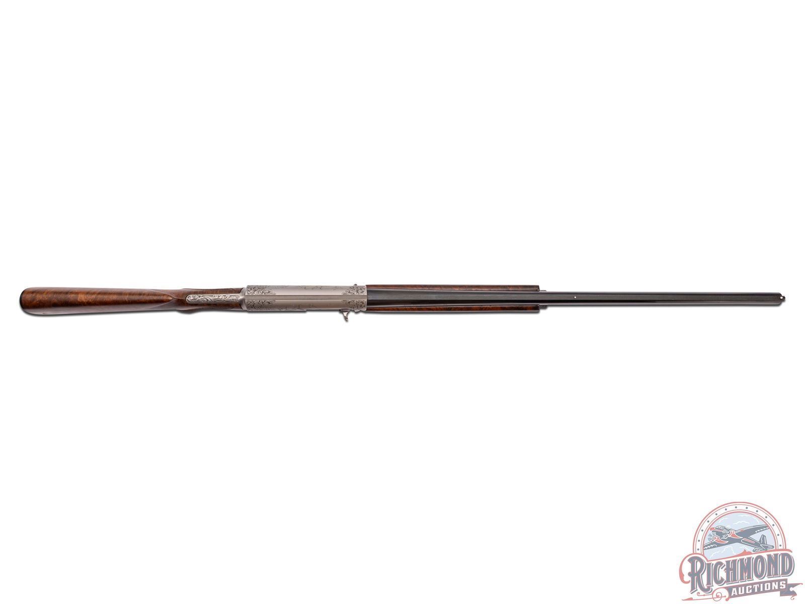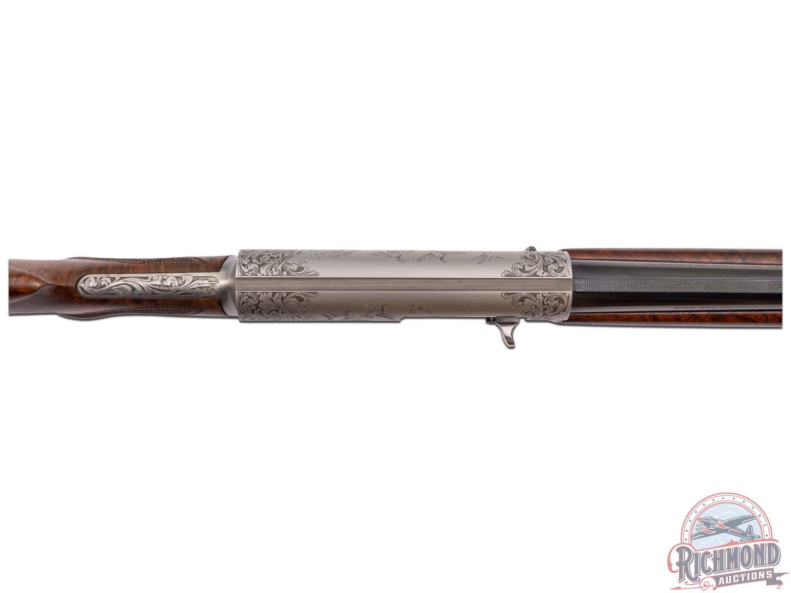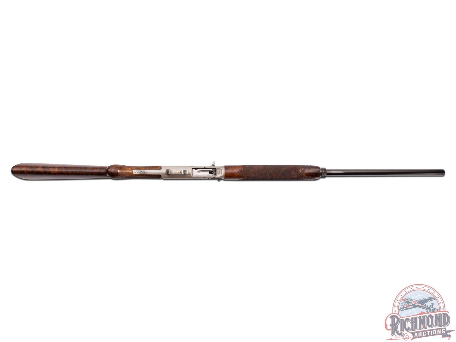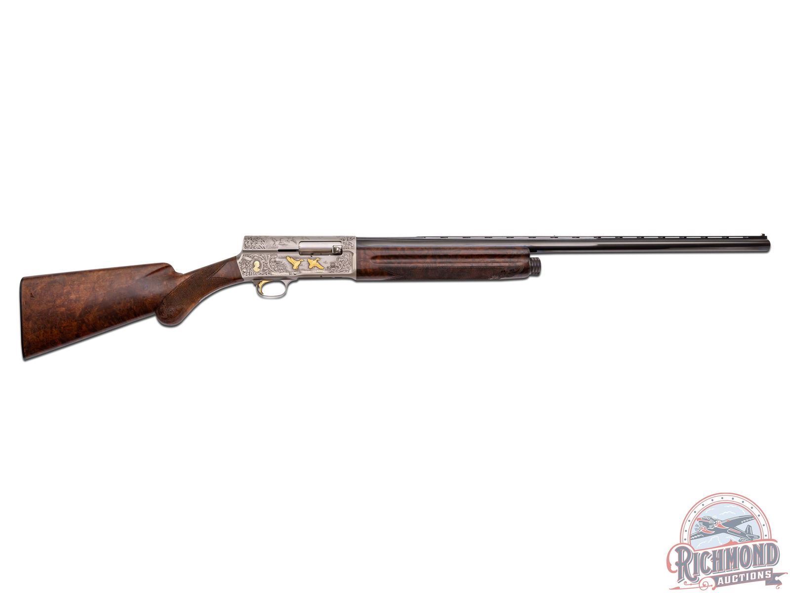 Manufactured in 1984 at FN in Belgium for Browning. Rare, number 227 of only 500 produced. Features a 28" blued ventilated rib barrel with white bead mid and front sight, choked Modified (**) and chambered for 2-3/4" shells. All standard Browning roll marks and proof marks. Beautiful coin finish receiver engraved and signed on the left side by Georges Marchal and the right side by H. Blanvalet. Right side features Gold inlaid landing ducks in a pond scene surrounded by deep-relief floral scroll and a gold inlaid silhouette of John Browning. Scroll banner at the bottom edge reads "BROWNING / GOLD CLASSIC" in gold lettering. Top "hump" has matching deep-relief floral scroll engraving with eight ducks total in flight. Left side features a gold inlaid downed duck and retriever in motion in a pond scene surrounded by deep-relief floral scroll. Scroll banner at the bottom edge reads "227 OF / FIVE HUNDRED" in gold lettering. Floral scroll engraving also along the tang and under the trigger guard. Gold inlaid Browning Buck logo in the bottom of the trigger guard. Gold washed trigger and crossbolt safety. Long tang, round knob highly figured walnut stock with finely checkered pistol grip and forearm. Checkering is surrounded by floral scroll and punch dot borders. Fitted with a factory FN synthetic butt plate. LOP: 14". DAC: 1-3/4". DAH: 2-1/2". CALIBER: 12 GA. S/N: 211GC227. FFL STATUS: Modern.