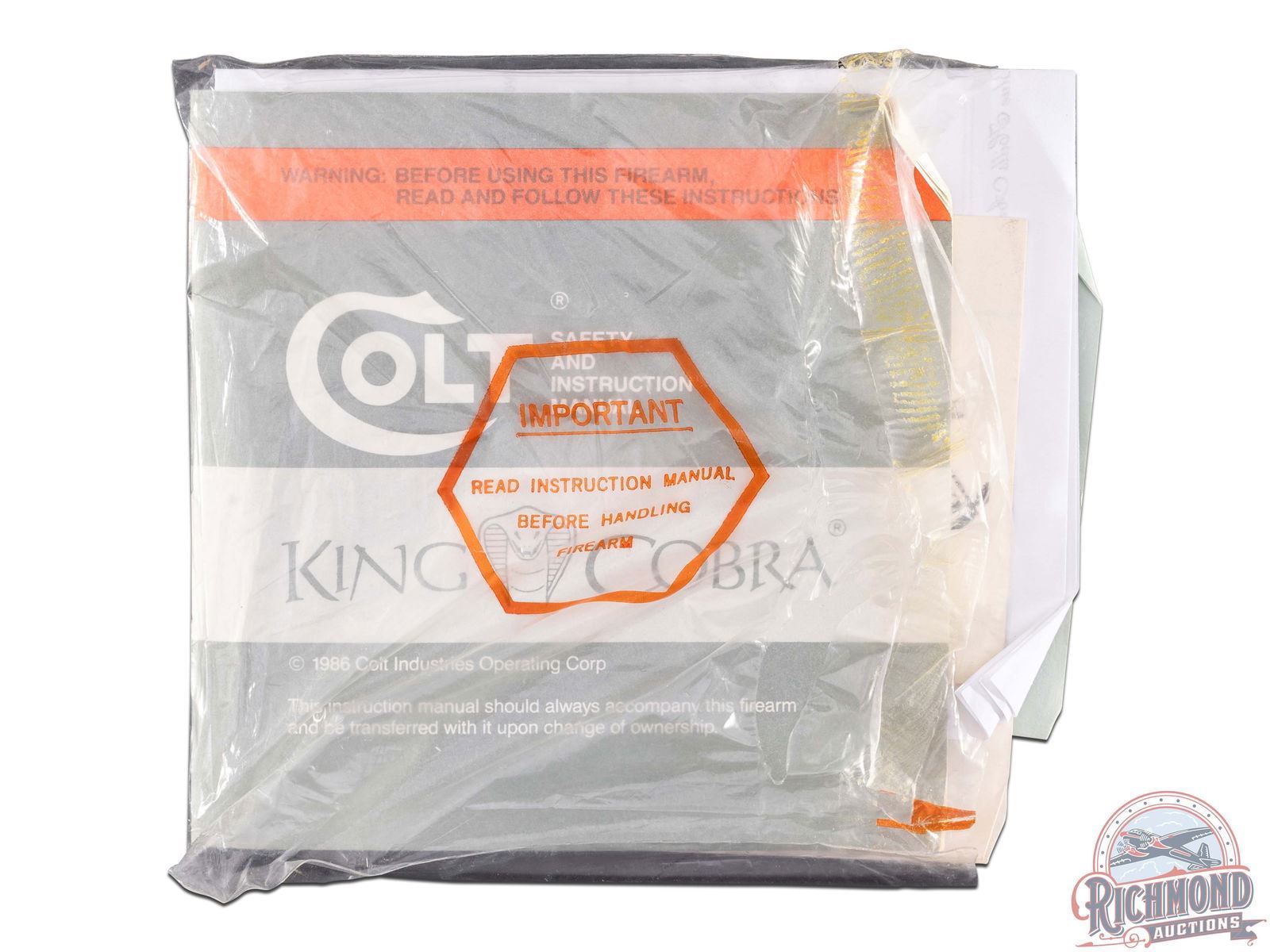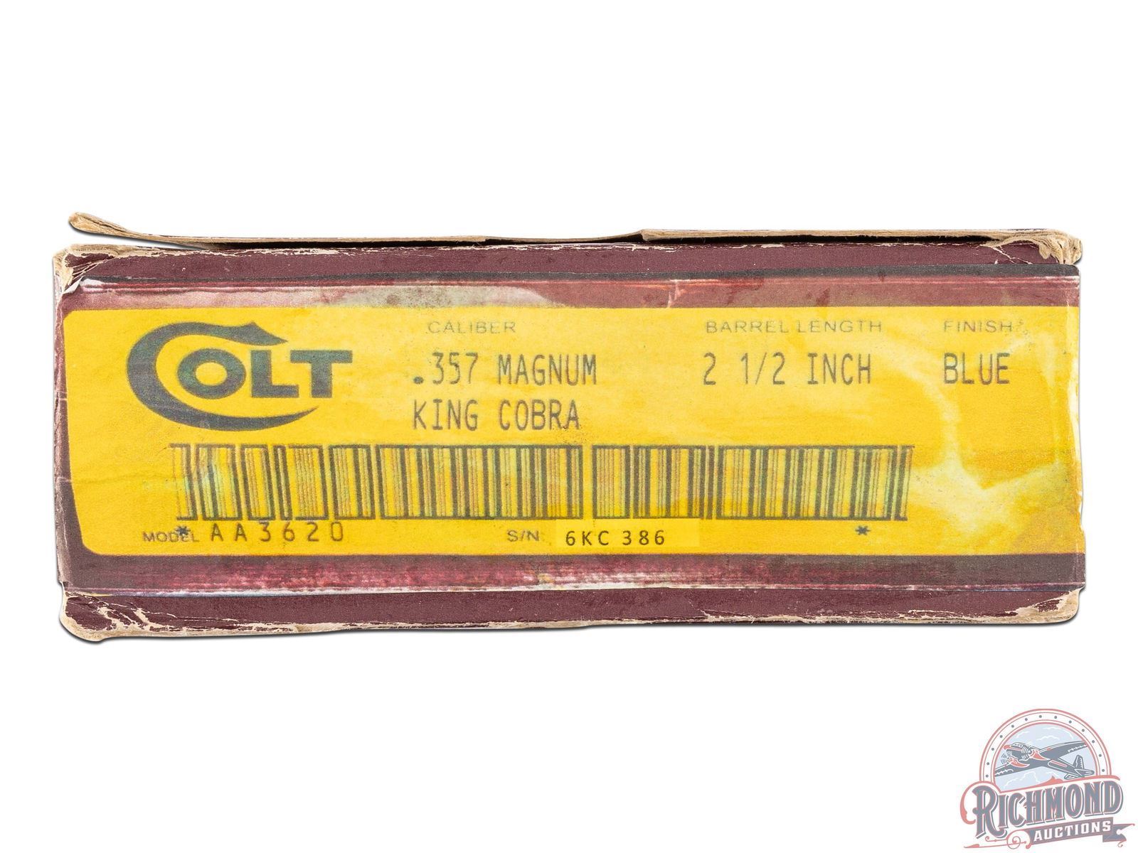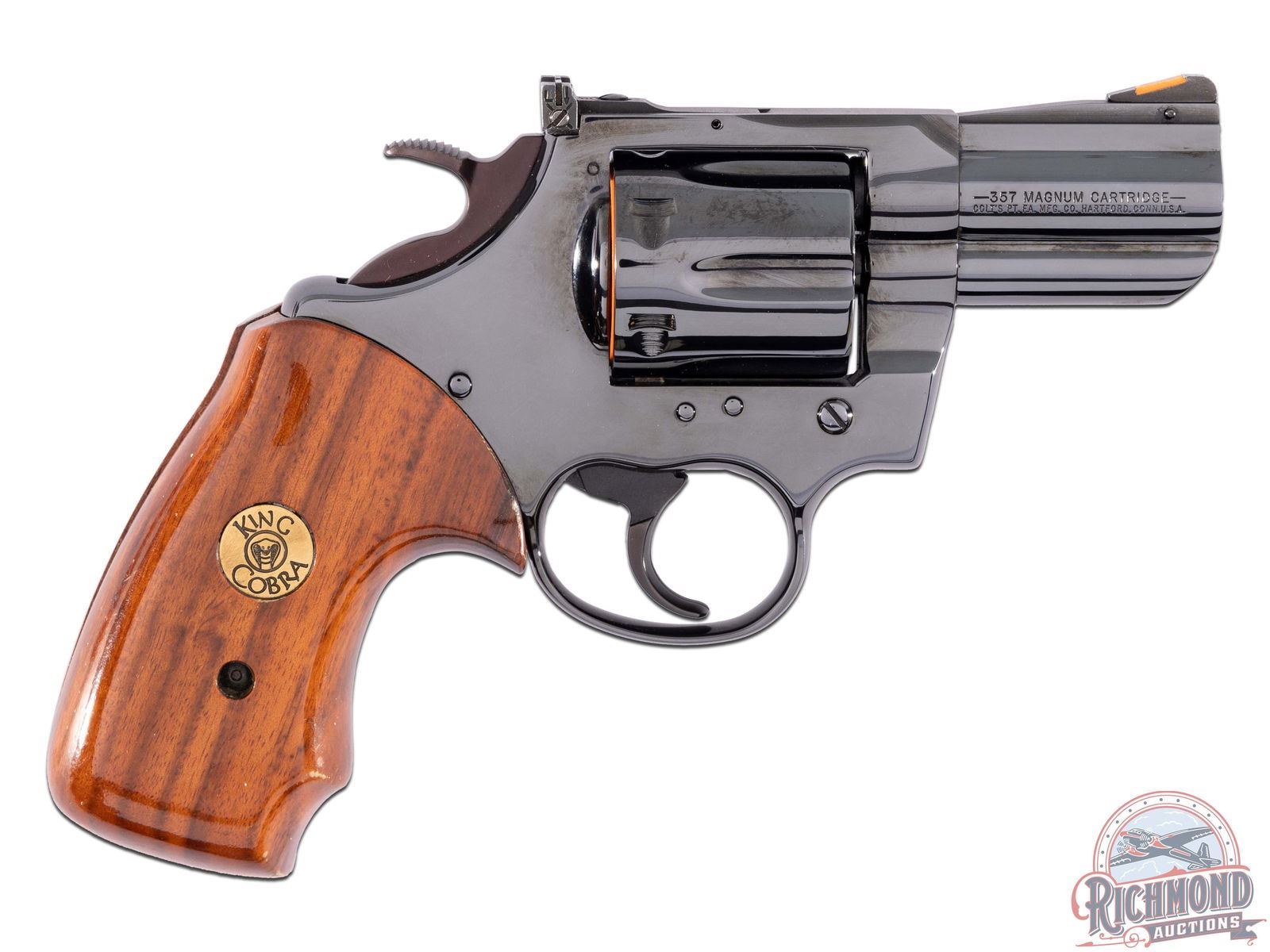 Manufactured in 1989, Colt archive letter reads that it was shipped to Midwest Recreational Shooting Supply on May 18, 1989. It was factory produced with a rare brilliant blue finish and even more rare 2-1/2" barrel. Rear white outlined adjustable notch sight and highlighted front ramp sight. Swing-out 6 round fluted cylinder. Fitted with smooth wood grips with finger grooves and gold tone King Cobra medallions. Comes in the original Colt factory box with yellow Colt custom labels and factory paperwork. CALIBER: 357 MAG. S/N: 6KC386. FFL STATUS: Modern.