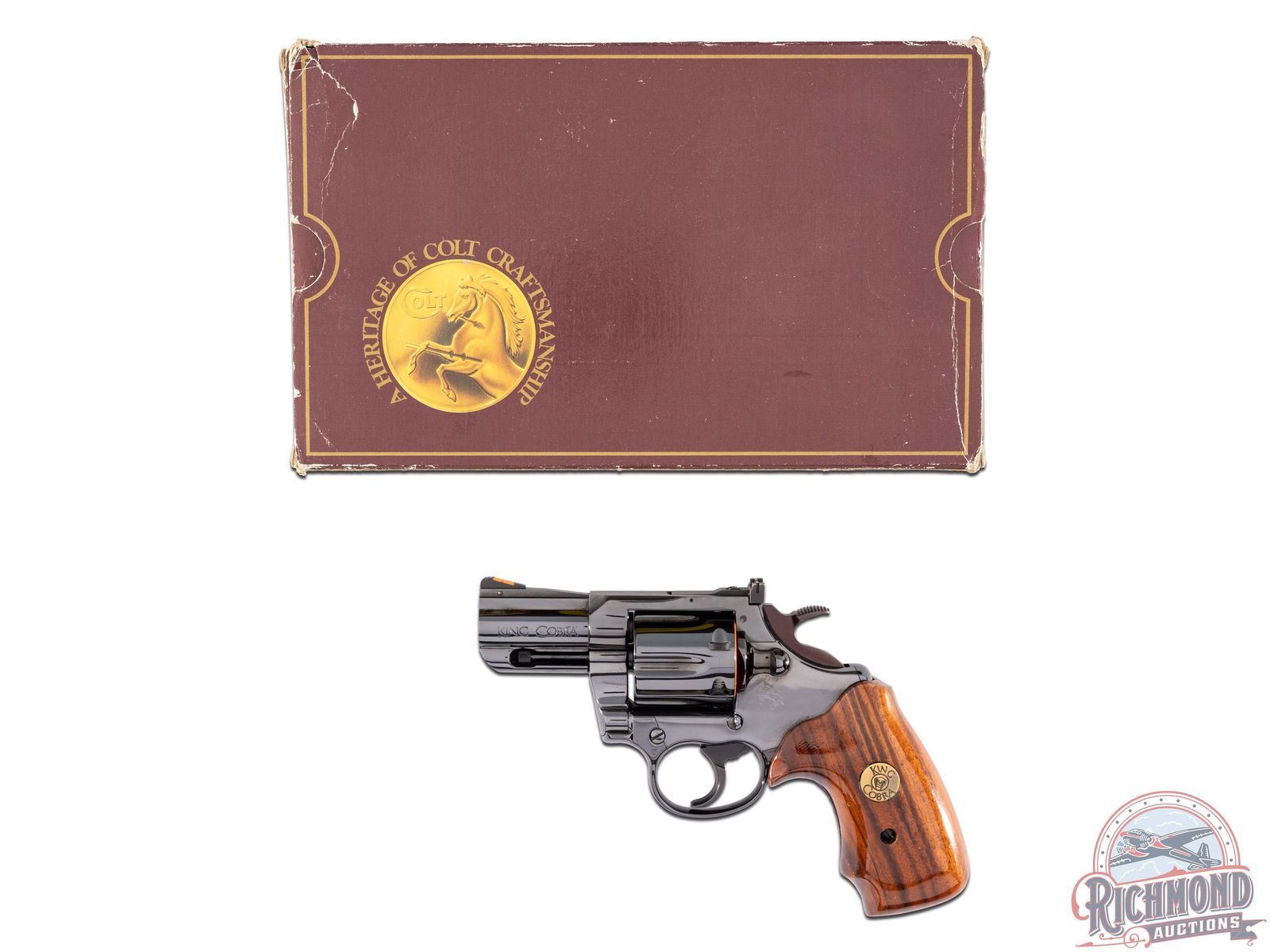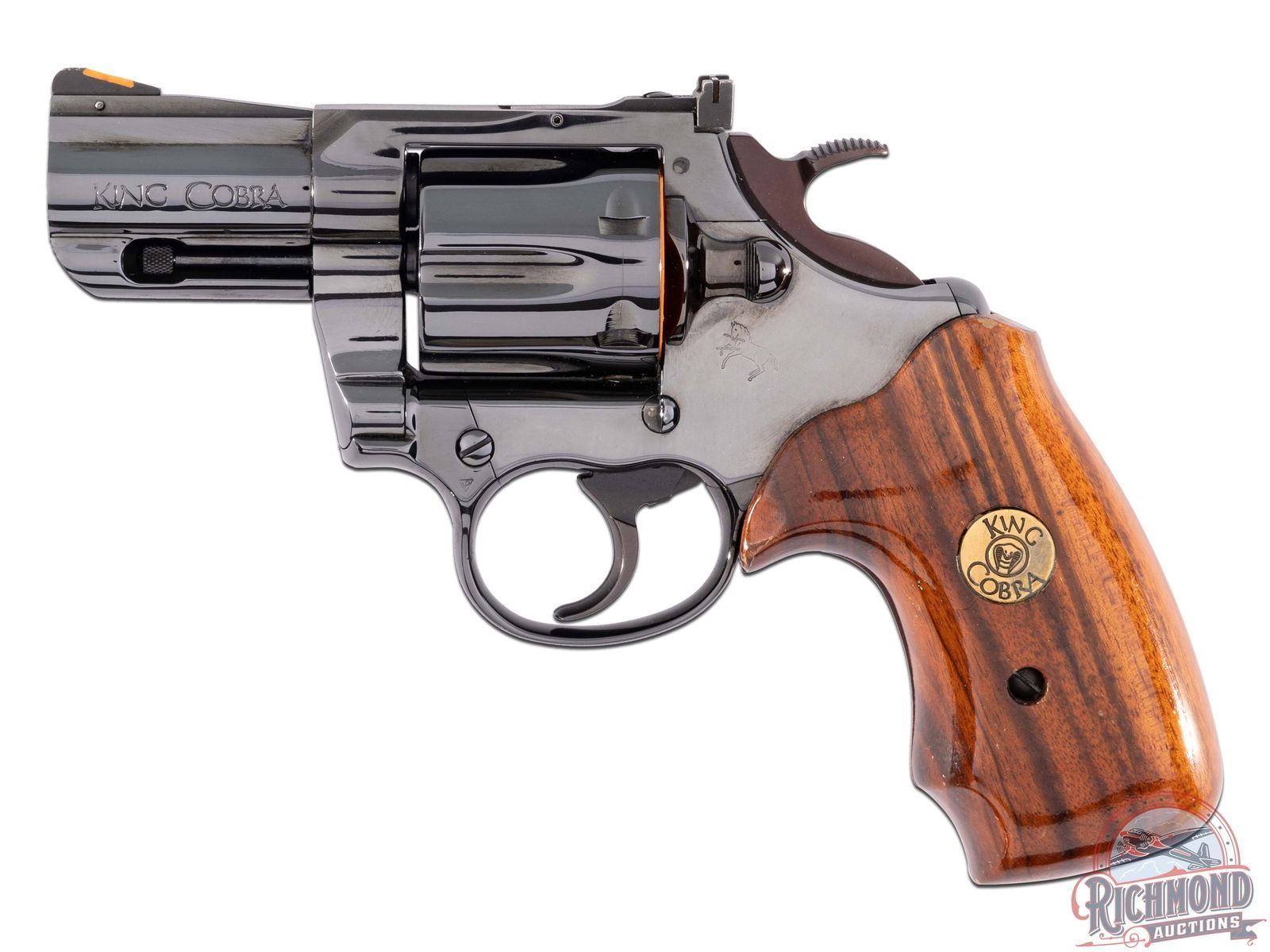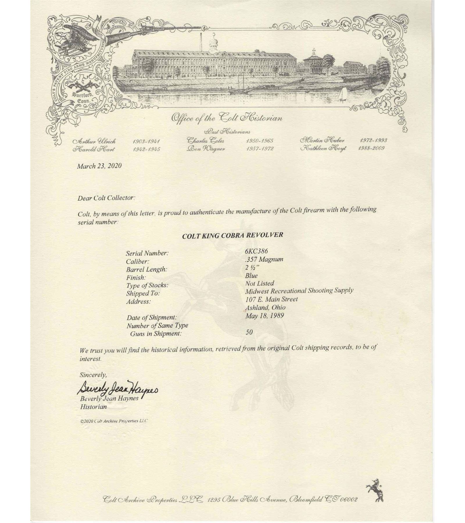 Manufactured in 1989, Colt archive letter reads that it was shipped to Midwest Recreational Shooting Supply on May 18, 1989. It was factory produced with a rare brilliant blue finish and even more rare 2-1/2" barrel. Rear white outlined adjustable notch sight and highlighted front ramp sight. Swing-out 6 round fluted cylinder. Fitted with smooth wood grips with finger grooves and gold tone King Cobra medallions. Comes in the original Colt factory box with yellow Colt custom labels and factory paperwork. CALIBER: 357 MAG. S/N: 6KC386. FFL STATUS: Modern.