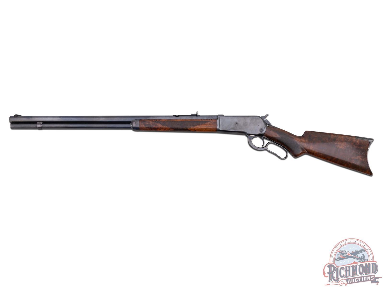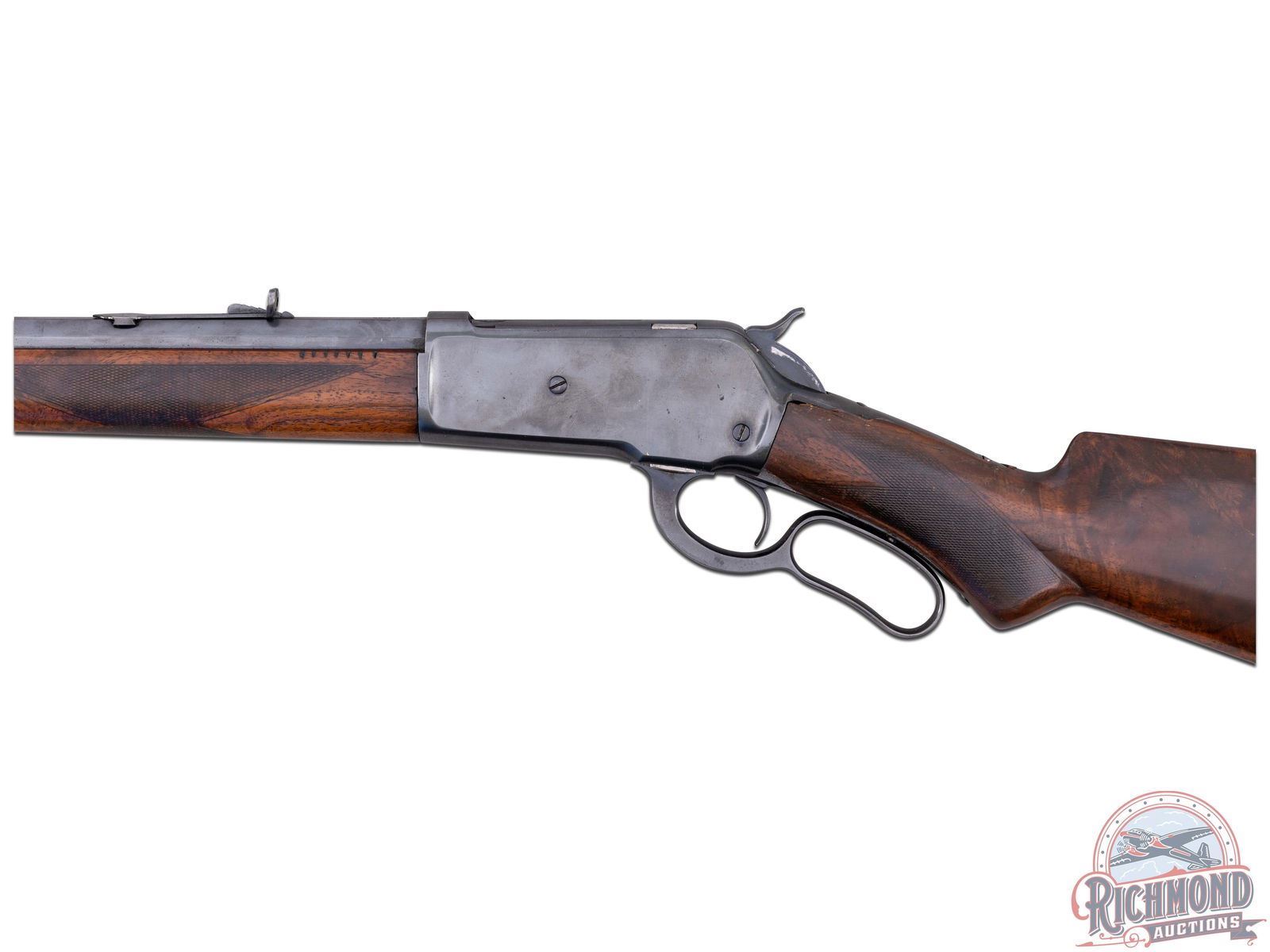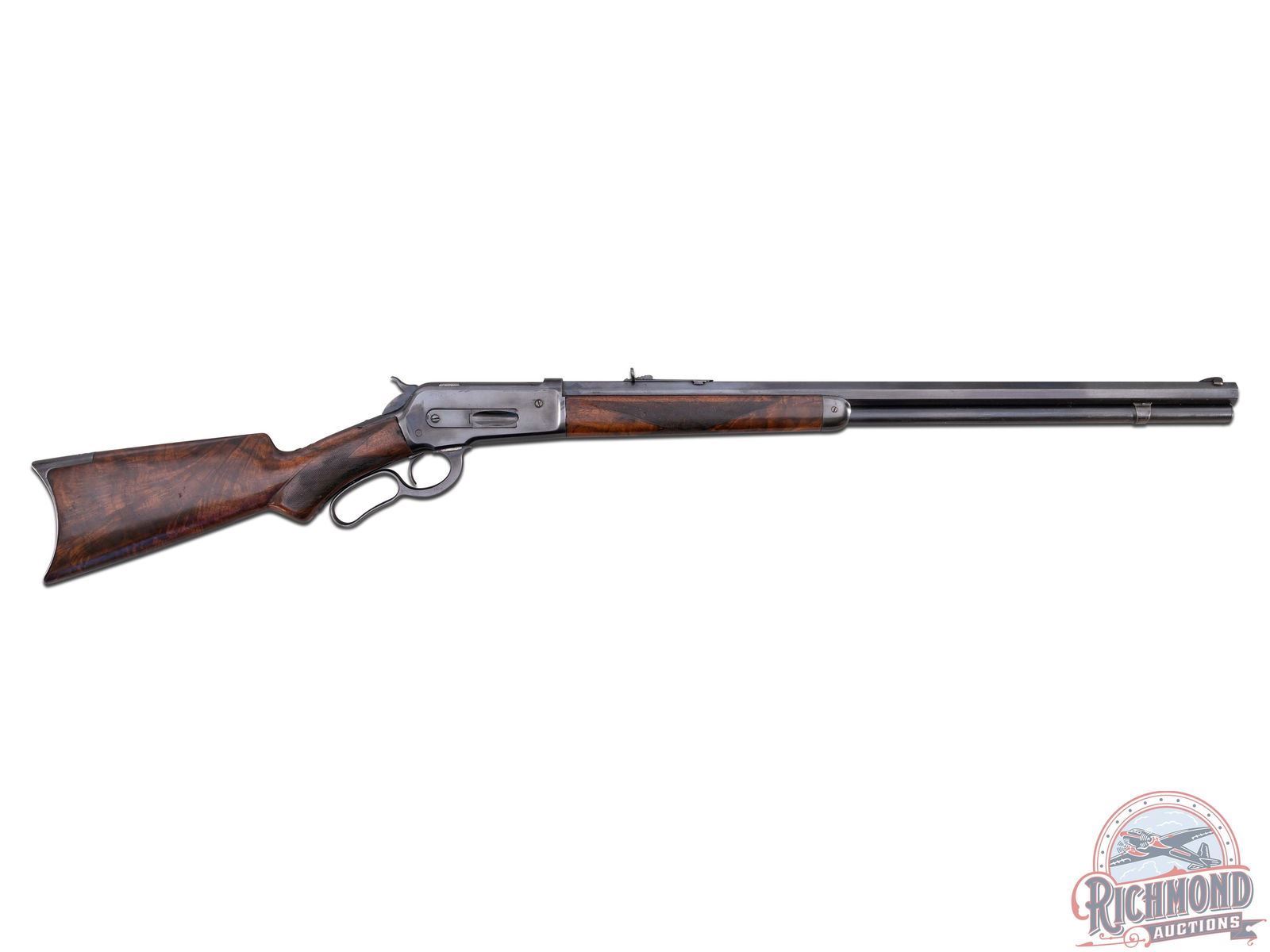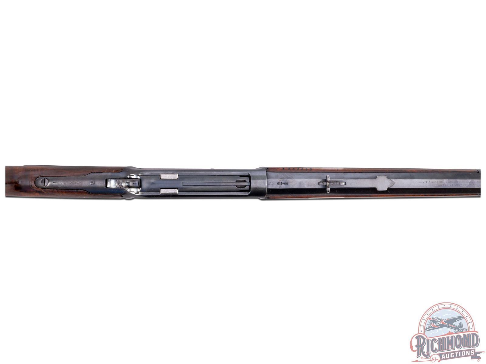 Manufactured in 1894. Features a 26" blued octagon barrel with period correct 22B rear notch sight and blade front sight. Barrel is stamped on top " -MANUFACTURED BY THE- / -WINCHESTER REPEATING ARMS CO NEW HAVEN, CONN. U.S.A.-" and rear of the barrel is restamped "50-110". Blued receiver with side loading gate. Tang is stamped "-MODEL 1886-" and rear of the trigger guard is stamped "PAT. OCT. 4, 1894 / JAN. 20, 1885-" and serial number "92805" in worn script. Beautiful highly figured walnut stock with fancy hand-checkering on pistol grip and forearm. Seven notches adorn the top left side of the forearm. Fitted with period correct steel crescent butt plate. Full length barrel magazine tube. Cody Firearms letter reads as follows; Serial number applied on October 13, 1894. Original caliber 40/82, Octagon barrel, Plain trigger, Checkered Stock with Pistol Grip (Fancy). Shipped from warehouse on October 22, 1894 and returned for repair on June 24, 1895. Return and repair could have been re-barreling the chamber for .50-110 Express, but no further information is available. Includes 67 rounds of cleaned and de-primed 50-110 Express brass for reloading! CALIBER: 50-110 EXPRESS. S/N: 92805. FFL STATUS: Antique.