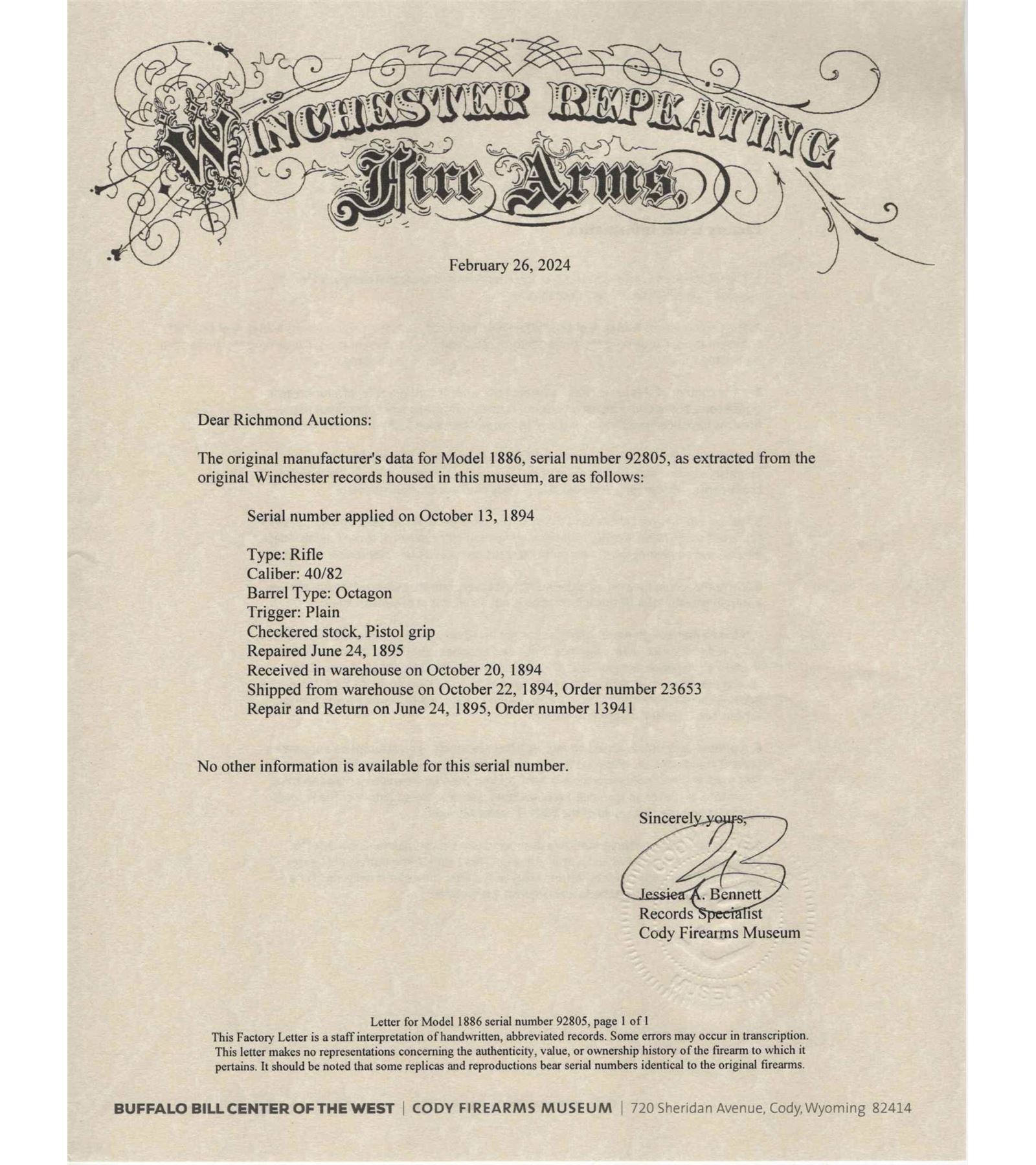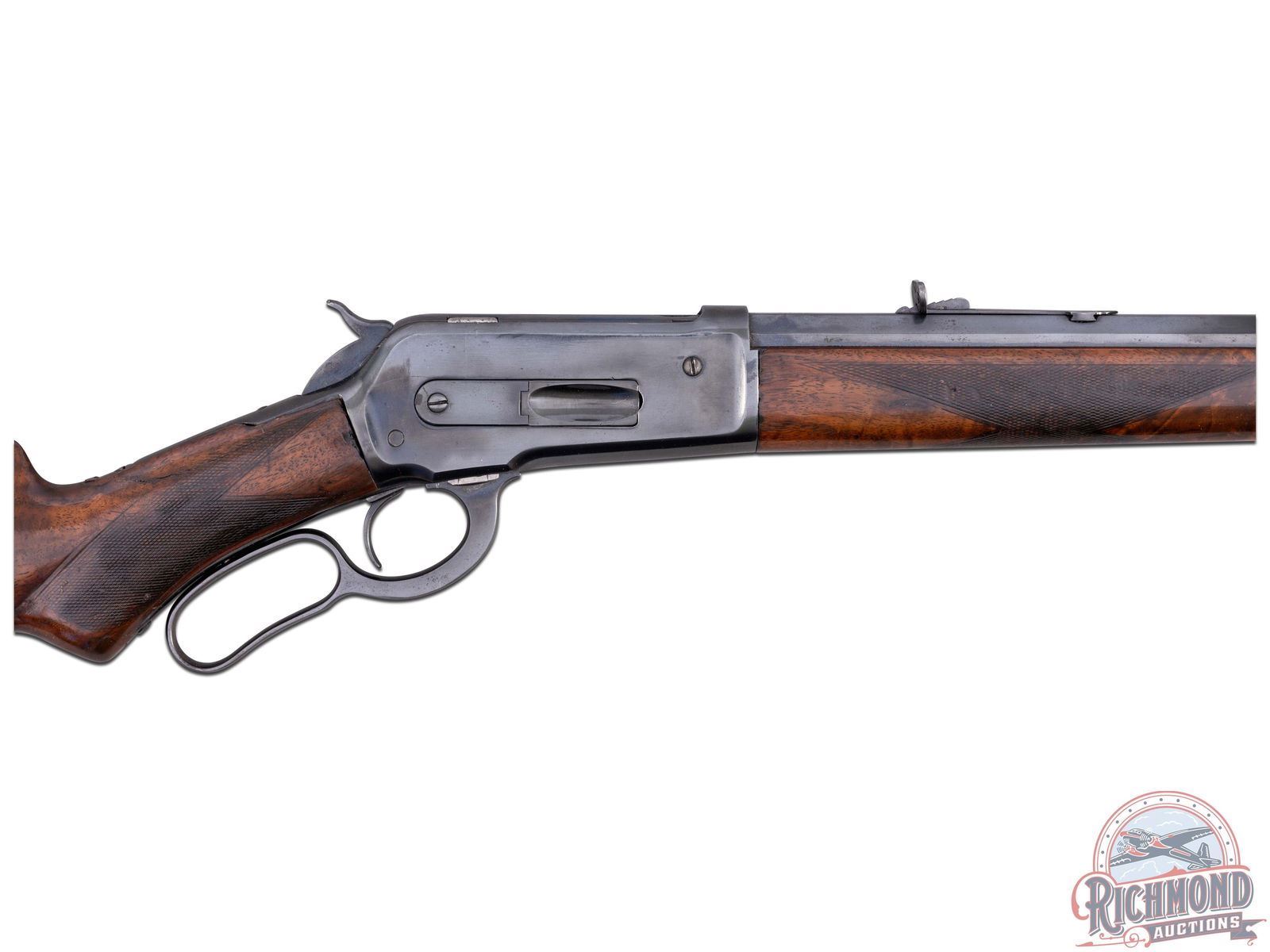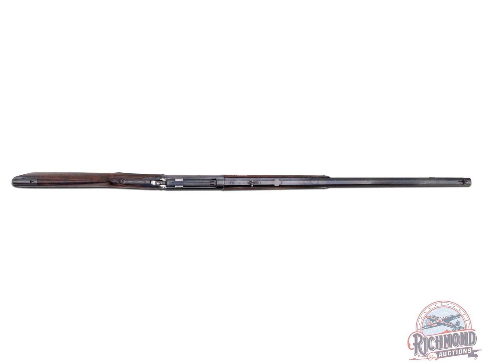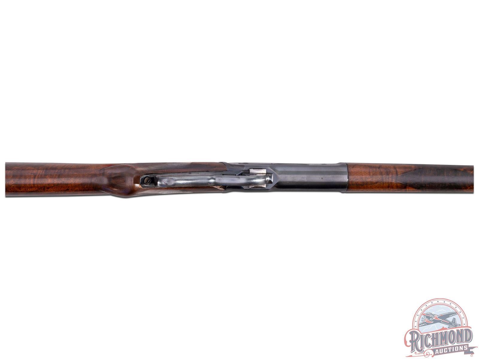 Manufactured in 1894. Features a 26" blued octagon barrel with period correct 22B rear notch sight and blade front sight. Barrel is stamped on top " -MANUFACTURED BY THE- / -WINCHESTER REPEATING ARMS CO NEW HAVEN, CONN. U.S.A.-" and rear of the barrel is restamped "50-110". Blued receiver with side loading gate. Tang is stamped "-MODEL 1886-" and rear of the trigger guard is stamped "PAT. OCT. 4, 1894 / JAN. 20, 1885-" and serial number "92805" in worn script. Beautiful highly figured walnut stock with fancy hand-checkering on pistol grip and forearm. Seven notches adorn the top left side of the forearm. Fitted with period correct steel crescent butt plate. Full length barrel magazine tube. Cody Firearms letter reads as follows; Serial number applied on October 13, 1894. Original caliber 40/82, Octagon barrel, Plain trigger, Checkered Stock with Pistol Grip (Fancy). Shipped from warehouse on October 22, 1894 and returned for repair on June 24, 1895. Return and repair could have been re-barreling the chamber for .50-110 Express, but no further information is available. Includes 67 rounds of cleaned and de-primed 50-110 Express brass for reloading! CALIBER: 50-110 EXPRESS. S/N: 92805. FFL STATUS: Antique.