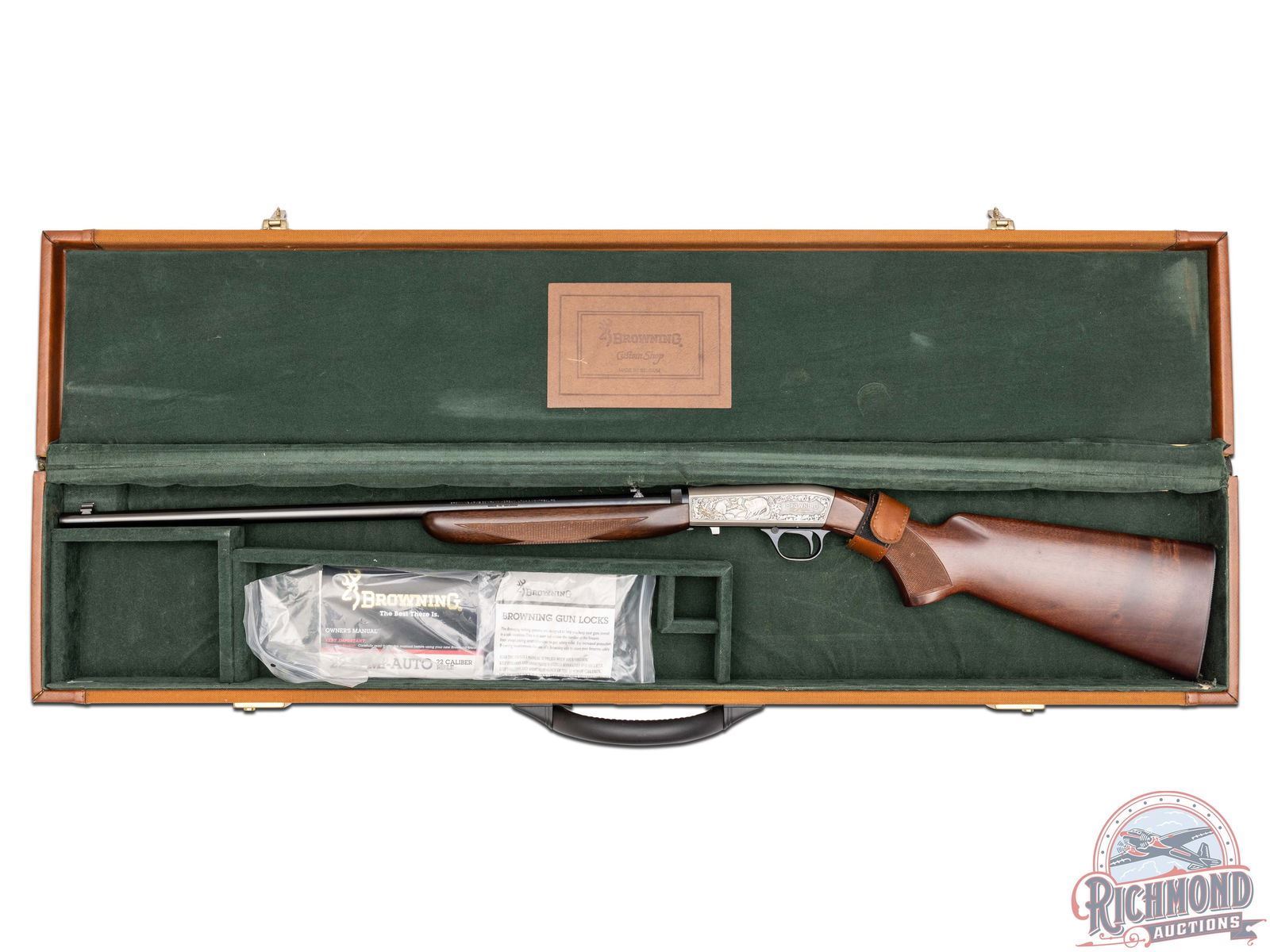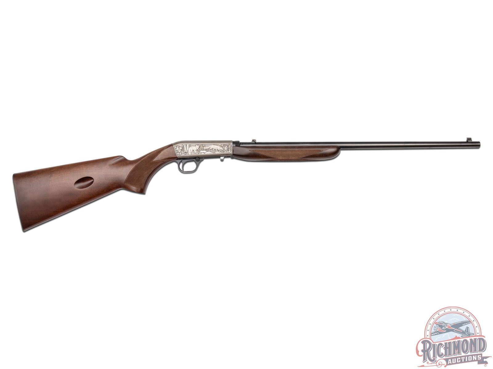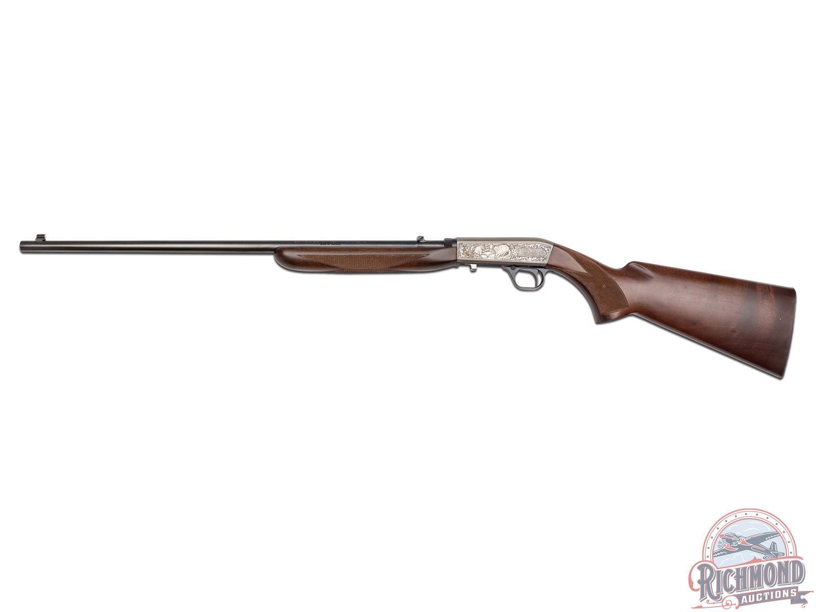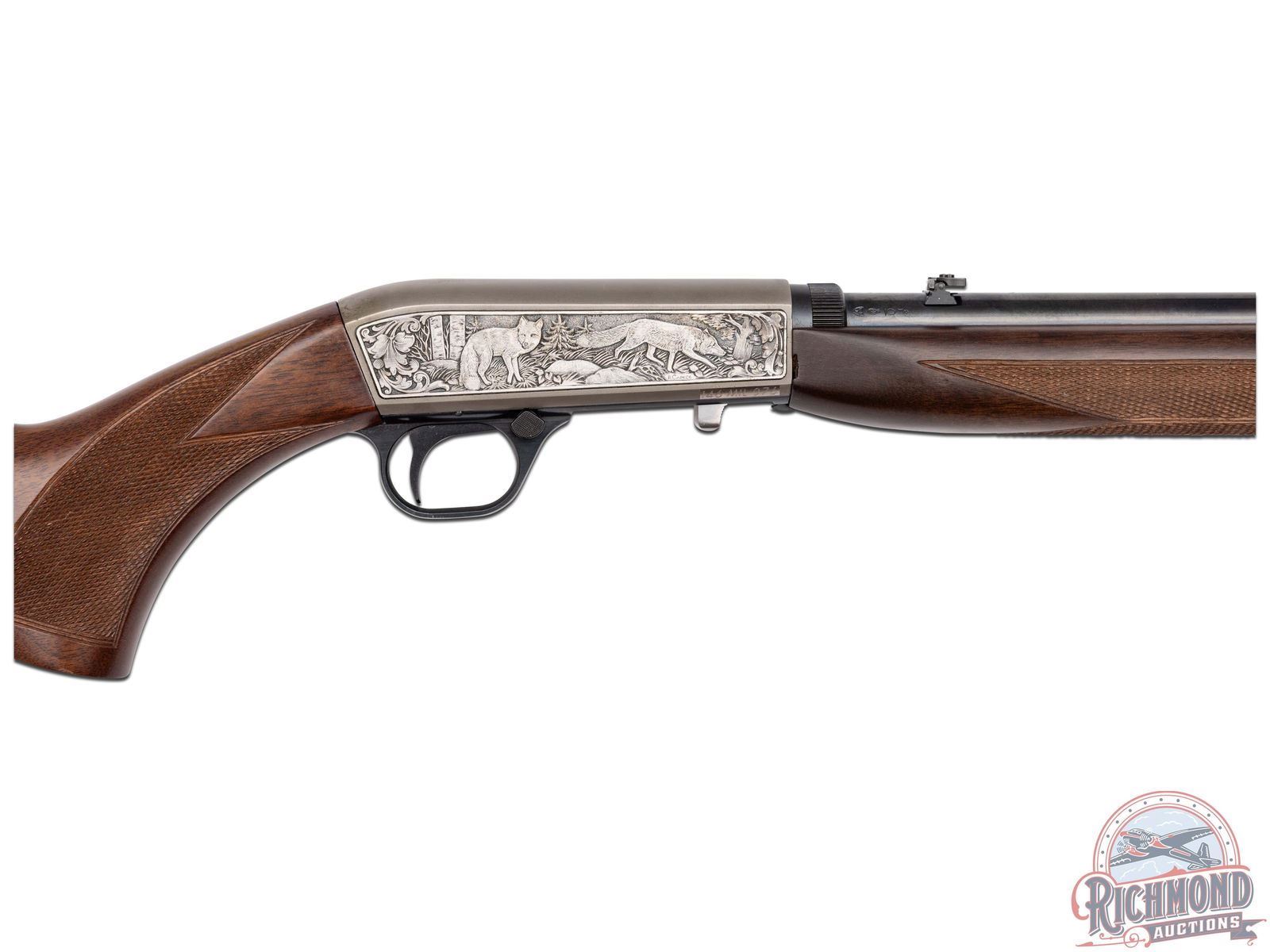 Manufactured in 2000, it is number 76 of only 100 of these Belgium custom shop guns made. Features a 21-1/2" blued barrel with rear flip-up adjustable notch sight and blade with brass bead front sight. Factory drilled and tapped for optics. Beautiful custom shop engraving on the coin finished receiver. Left side features two raccoons in a wooded rocky stream scene and to the right the wording "BROWNING / MILLENNIUM" is surrounded by a floral scroll design. Right side of the receiver features two fox in a woodland scene bordered by floral scroll engraving. Signed "R.CAPECE", for master engraver Rocco Capece below the walking fox. Blued trigger guard with crossbolt safety and gold tone Browning buck logo on the bottom. Satin walnut stock with side loading magazine and steel serrated butt plate. Hand checkered pistol grip and forearm. Comes in a factory Browning Custom Shop velvet lined, canvas and leather case with factory paperwork. CALIBER: 22 LR. S/N: 146MIL076. FFL STATUS: Modern.