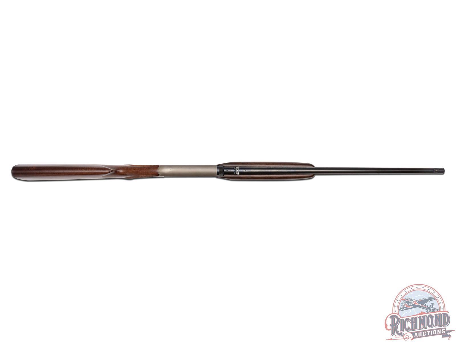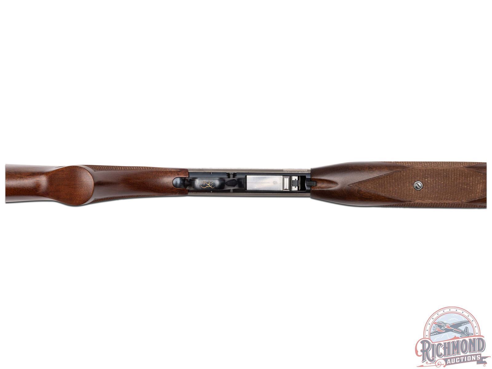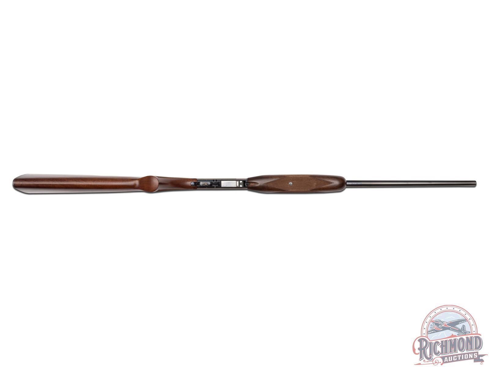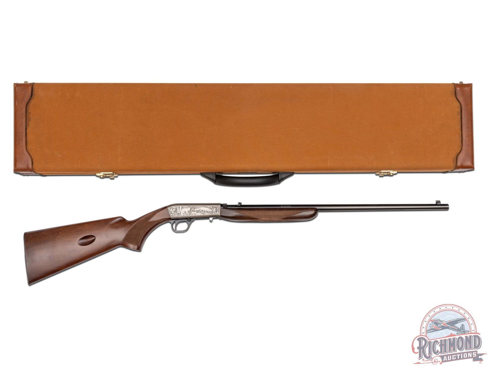 Manufactured in 2000, it is number 76 of only 100 of these Belgium custom shop guns made. Features a 21-1/2" blued barrel with rear flip-up adjustable notch sight and blade with brass bead front sight. Factory drilled and tapped for optics. Beautiful custom shop engraving on the coin finished receiver. Left side features two raccoons in a wooded rocky stream scene and to the right the wording "BROWNING / MILLENNIUM" is surrounded by a floral scroll design. Right side of the receiver features two fox in a woodland scene bordered by floral scroll engraving. Signed "R.CAPECE", for master engraver Rocco Capece below the walking fox. Blued trigger guard with crossbolt safety and gold tone Browning buck logo on the bottom. Satin walnut stock with side loading magazine and steel serrated butt plate. Hand checkered pistol grip and forearm. Comes in a factory Browning Custom Shop velvet lined, canvas and leather case with factory paperwork. CALIBER: 22 LR. S/N: 146MIL076. FFL STATUS: Modern.