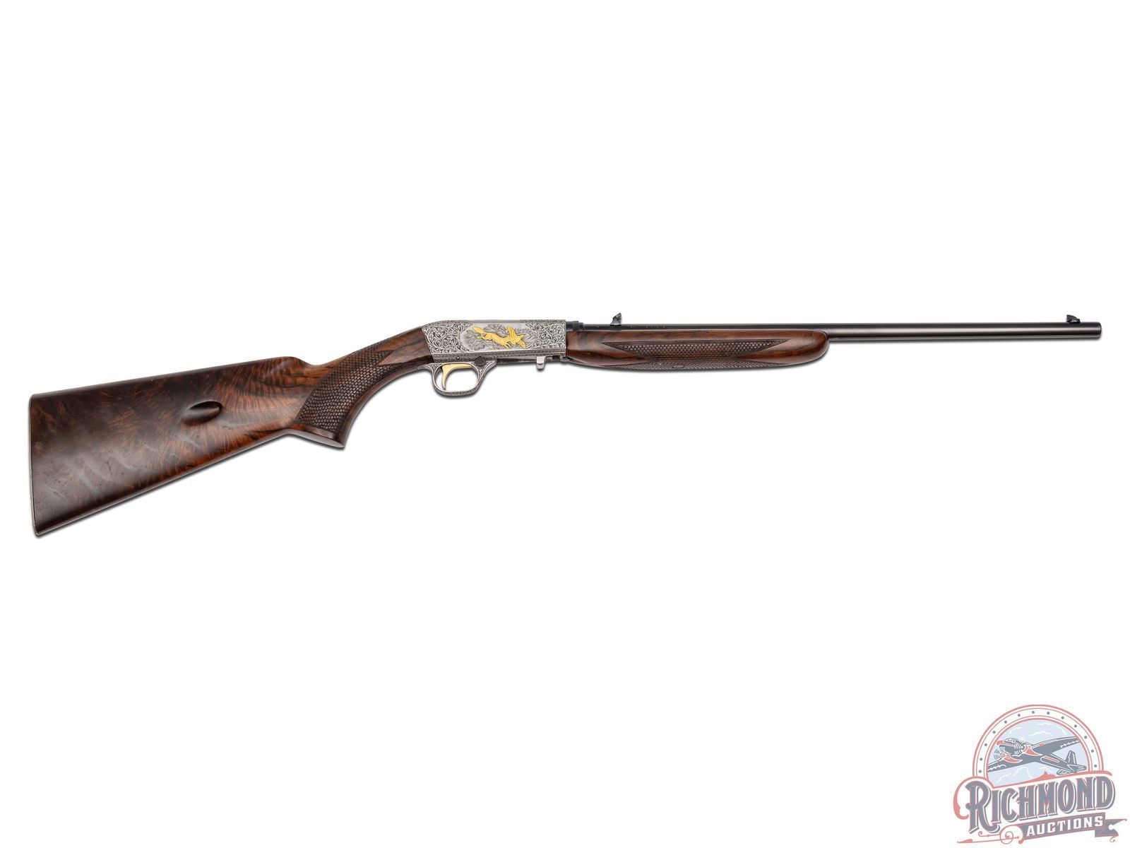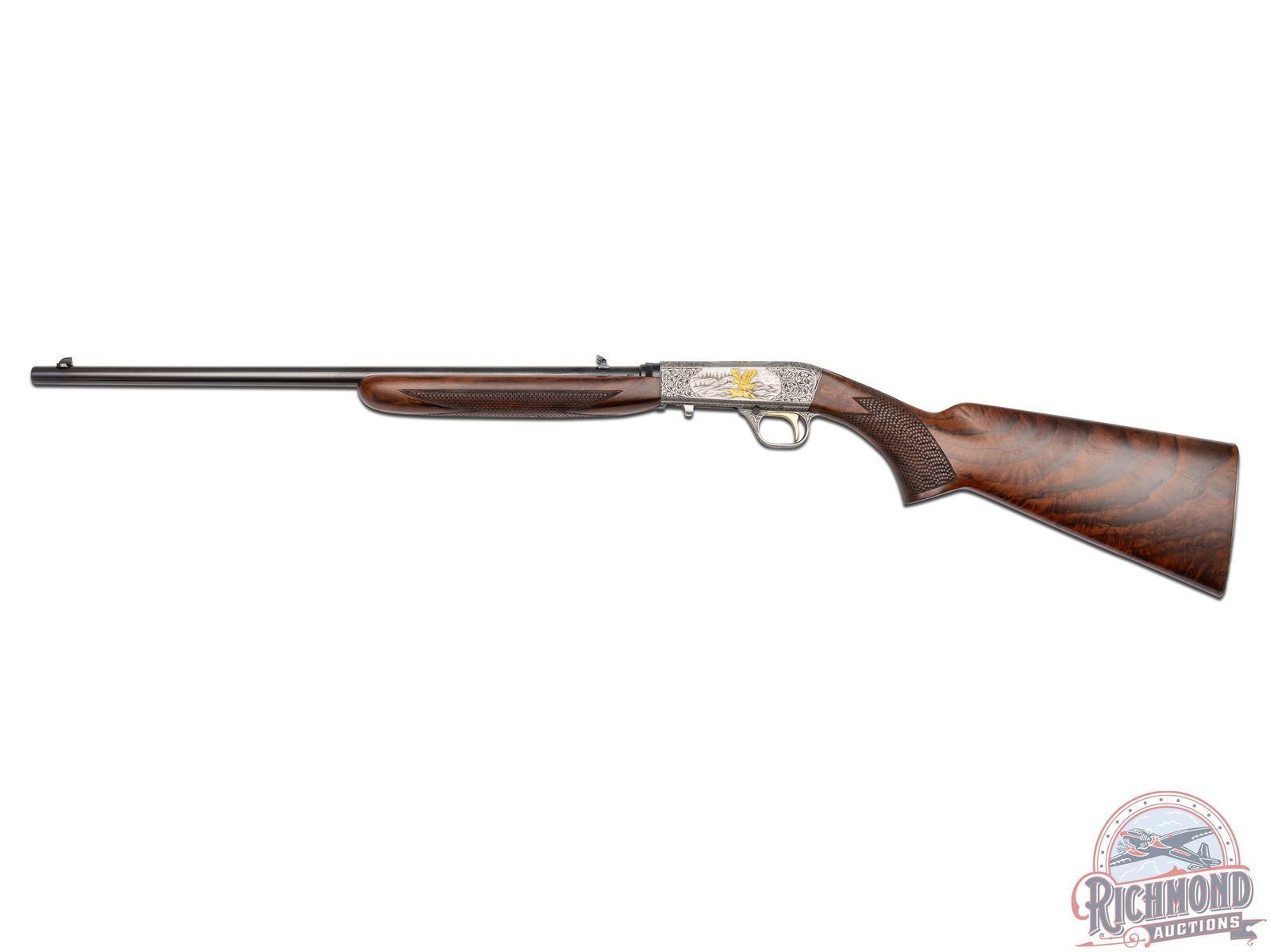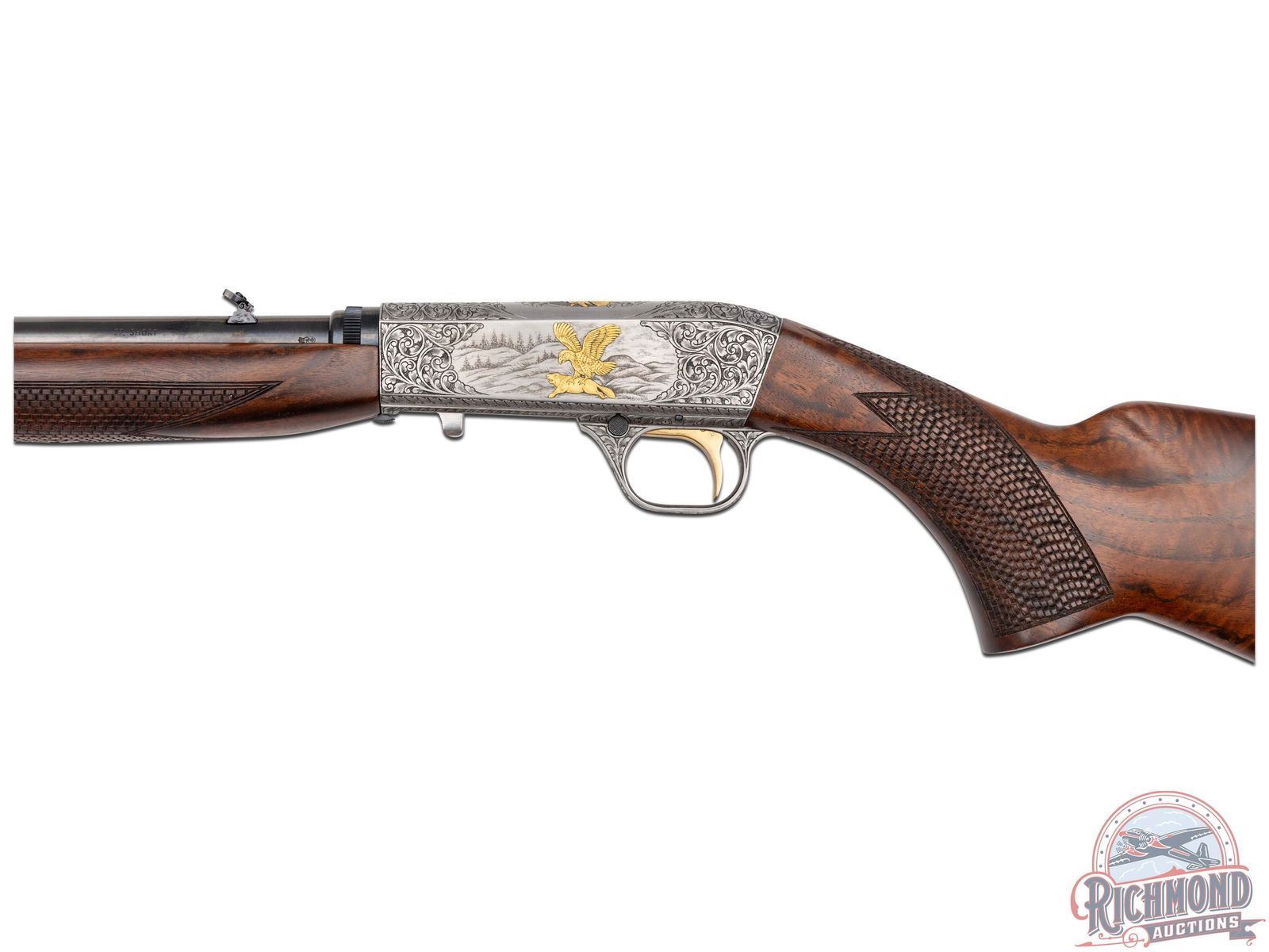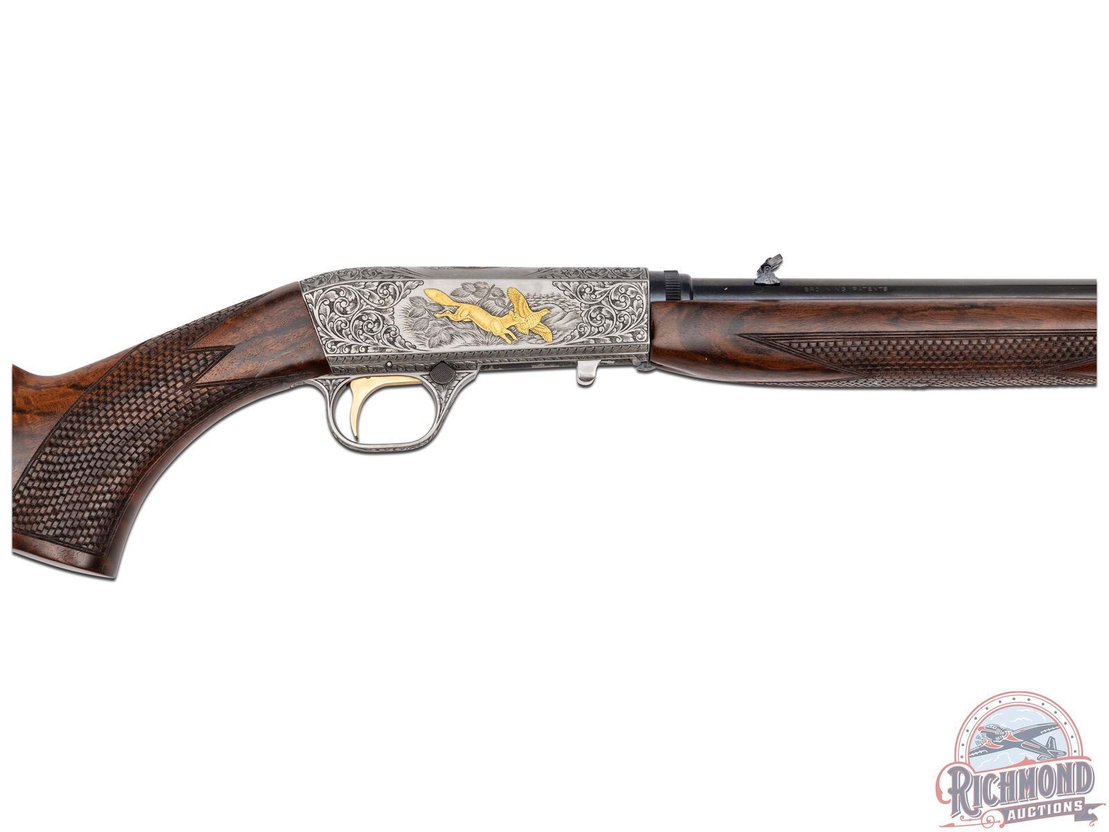 This beautiful SA-22 is a first year manufacture in 1956, in Belgium for Browning. Chambered in the RARE 22 Short caliber, Grade III and custom engraved checks all the boxes for any Browning collector! Features a 19-1/4" blued barrel with rear flip-up adjustable notch sight and blade front sight. Coin finished receiver features 95% engraved coverage. Left side features a gold embossed eagle capturing a groundhog on a hillside scene surrounded by a floral scroll design. Bottom right corner is signed "M.BODSON" by master engraver Mario Bodson. Top of the receiver features a gold embossed retriever with a duck in its mouth in an oval surrounded by floral scroll engraving. Right side features a gold embossed fox and dove in a woodland scene, surrounded with floral scroll engraving. Trigger guard is also engraved with a floral scroll design. Gold washed trigger and crossbolt safety. Grade III nicely figured feather crotch walnut stock and forearm, with basketweave checkered pistol grip and forearm. Fitted with a factory steel butt plate. Comes in a Browning take-down case with factory manual. CALIBER: 22 SHORT. S/N: 1306. FFL STATUS: Curio & Relic.