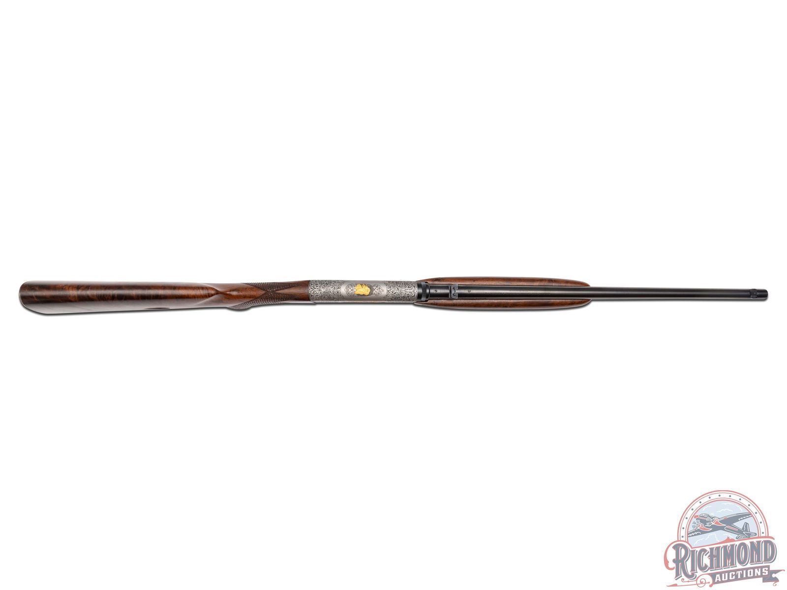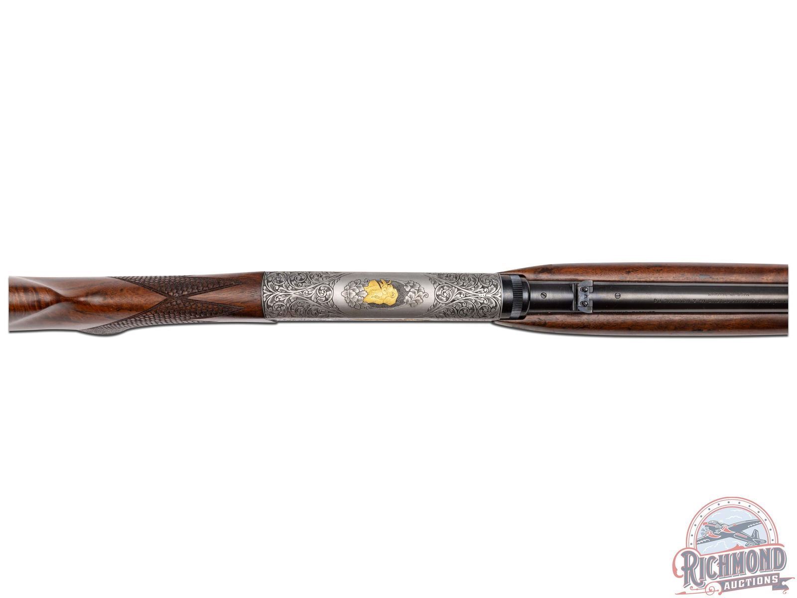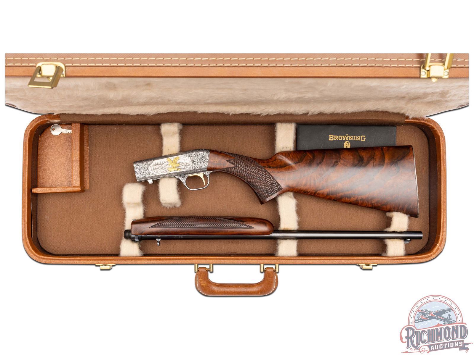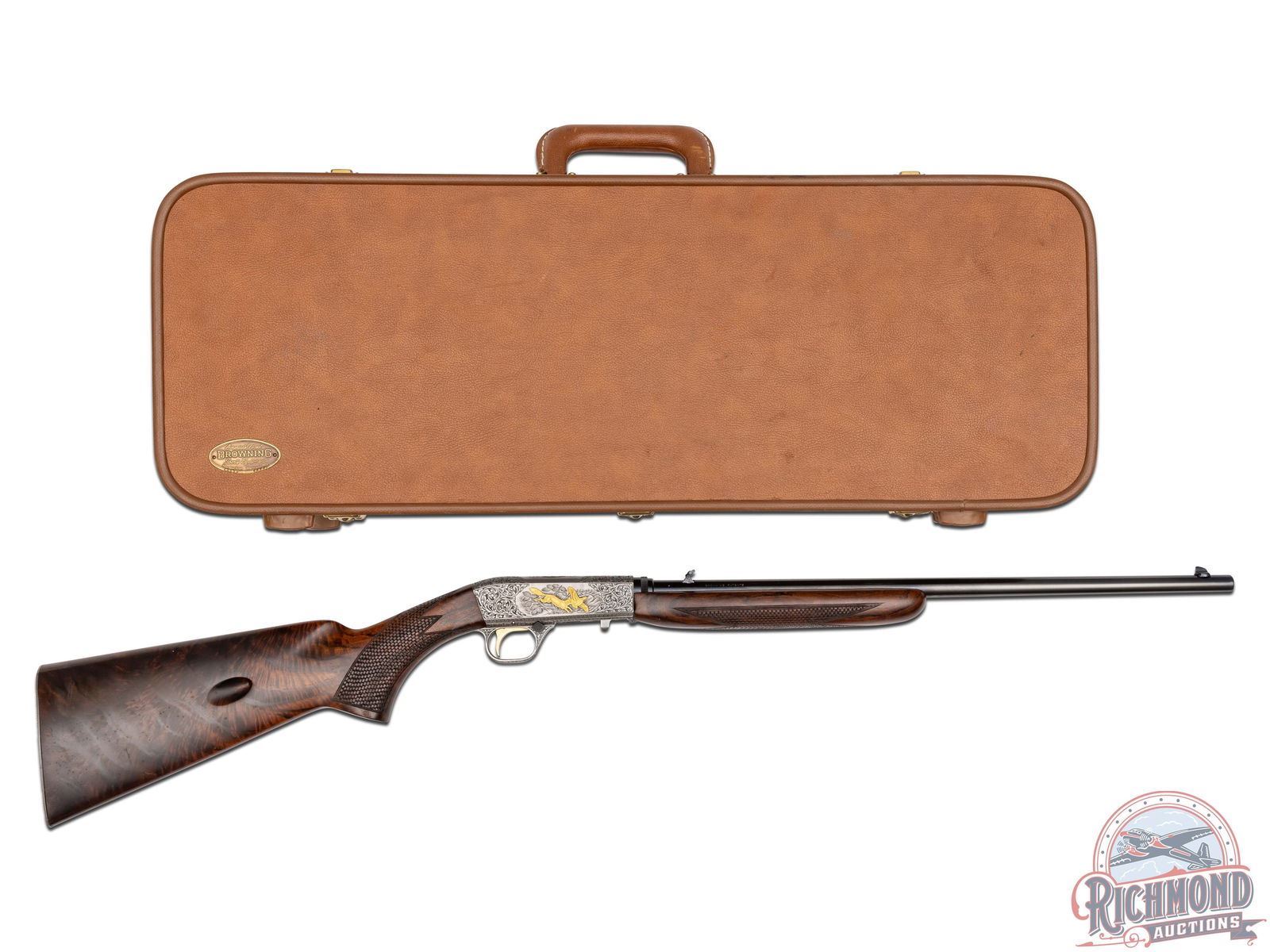 This beautiful SA-22 is a first year manufacture in 1956, in Belgium for Browning. Chambered in the RARE 22 Short caliber, Grade III and custom engraved checks all the boxes for any Browning collector! Features a 19-1/4" blued barrel with rear flip-up adjustable notch sight and blade front sight. Coin finished receiver features 95% engraved coverage. Left side features a gold embossed eagle capturing a groundhog on a hillside scene surrounded by a floral scroll design. Bottom right corner is signed "M.BODSON" by master engraver Mario Bodson. Top of the receiver features a gold embossed retriever with a duck in its mouth in an oval surrounded by floral scroll engraving. Right side features a gold embossed fox and dove in a woodland scene, surrounded with floral scroll engraving. Trigger guard is also engraved with a floral scroll design. Gold washed trigger and crossbolt safety. Grade III nicely figured feather crotch walnut stock and forearm, with basketweave checkered pistol grip and forearm. Fitted with a factory steel butt plate. Comes in a Browning take-down case with factory manual. CALIBER: 22 SHORT. S/N: 1306. FFL STATUS: Curio & Relic.