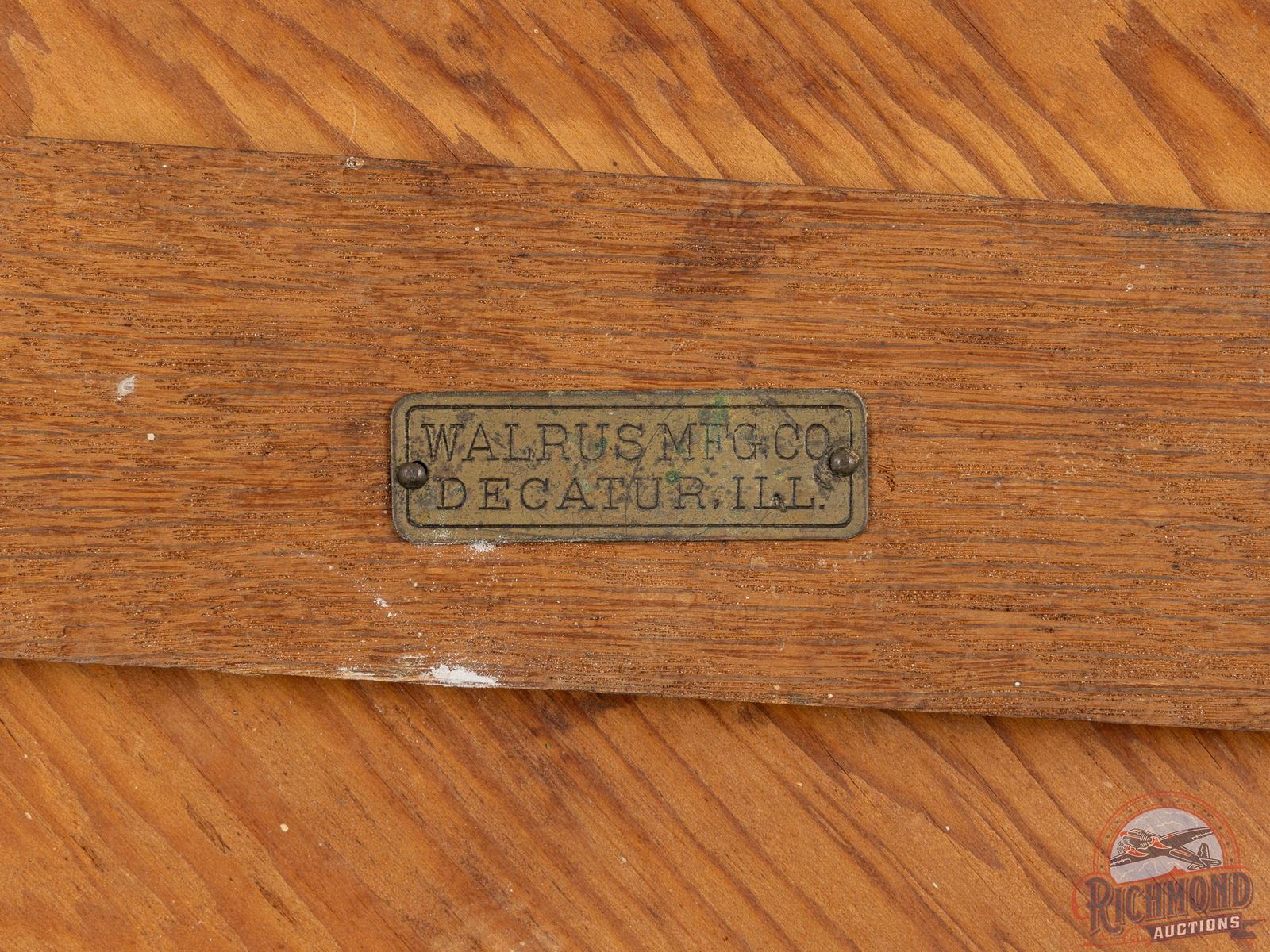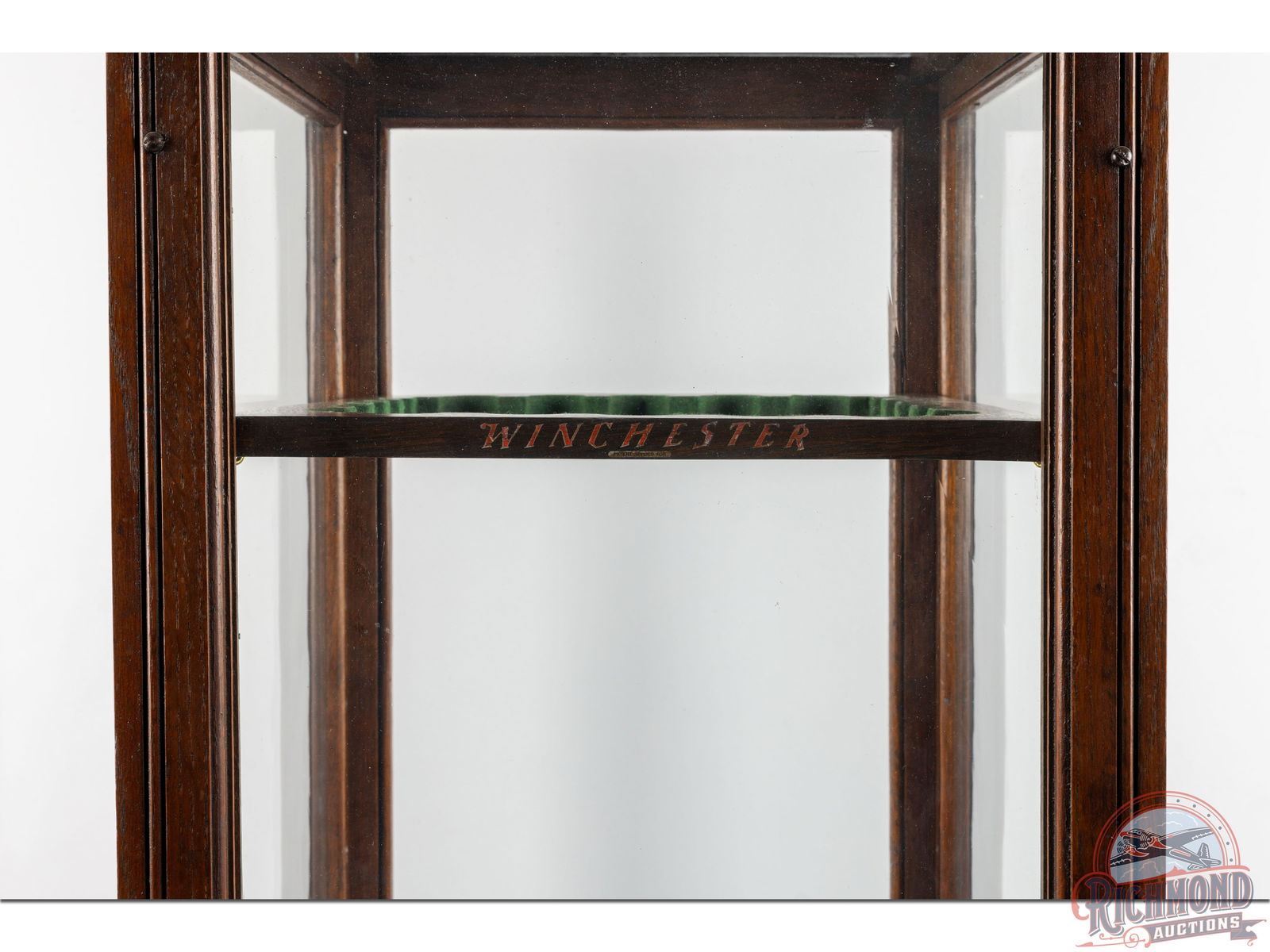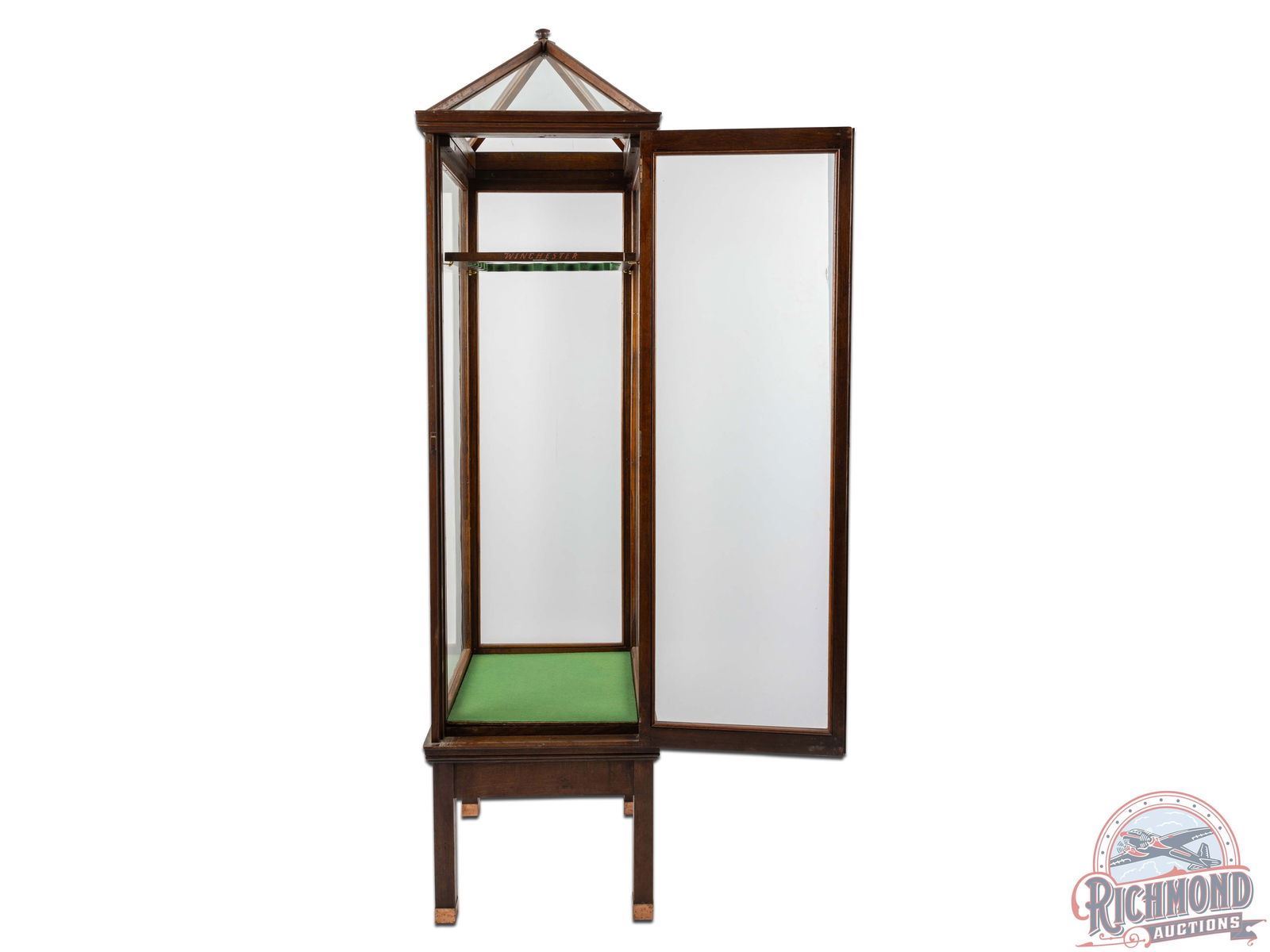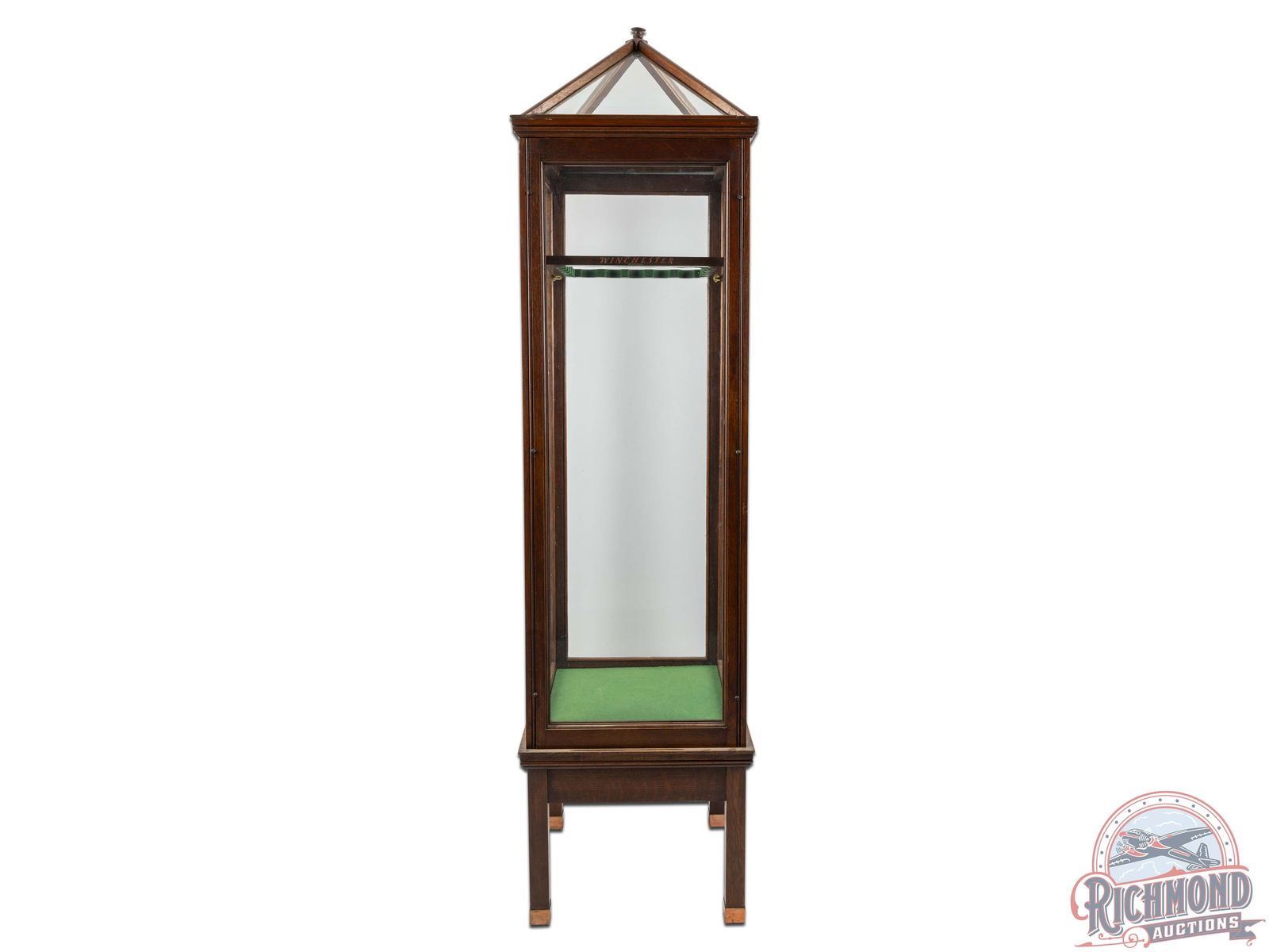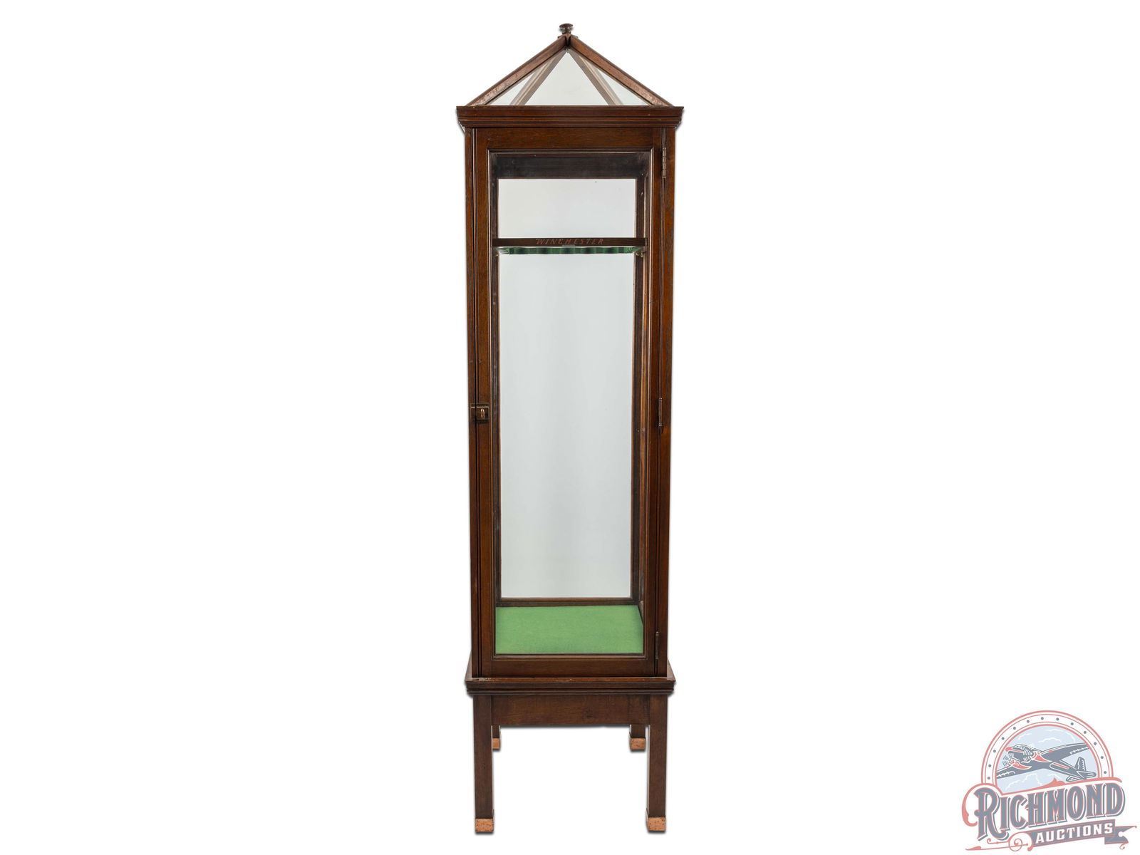 This stunning factory retail display cabinet was manufactured by the Walrus Manufacturing Co in the early 1900s to aid Winchester dealers in displaying their Winchester long guns. Walrus Manufacturing Co's brass plaque is present on the bottom of floor plate. It is constructed of tiger oak and walnut with full length crude glass panels that dates this previous to 1920. A detachable cathedral top with glass panels and wood finial sets firmly on top. Height is approximately 73" on its four legs with brass sheathed feet, and each side is approximately 18" wide. The inside display height is approximately 45". Interior four sided racks will accommodate up to 20 long guns. All four sides are 5/8 inch thick and are marked "WINCHESTER" in black outlined red letters with black lettered "PATENT APPLIED FOR" on a white background below. The bottom of the case and the inner edge of the rack is lined with green felt. An absolute must have for display of any fine Winchester collection!