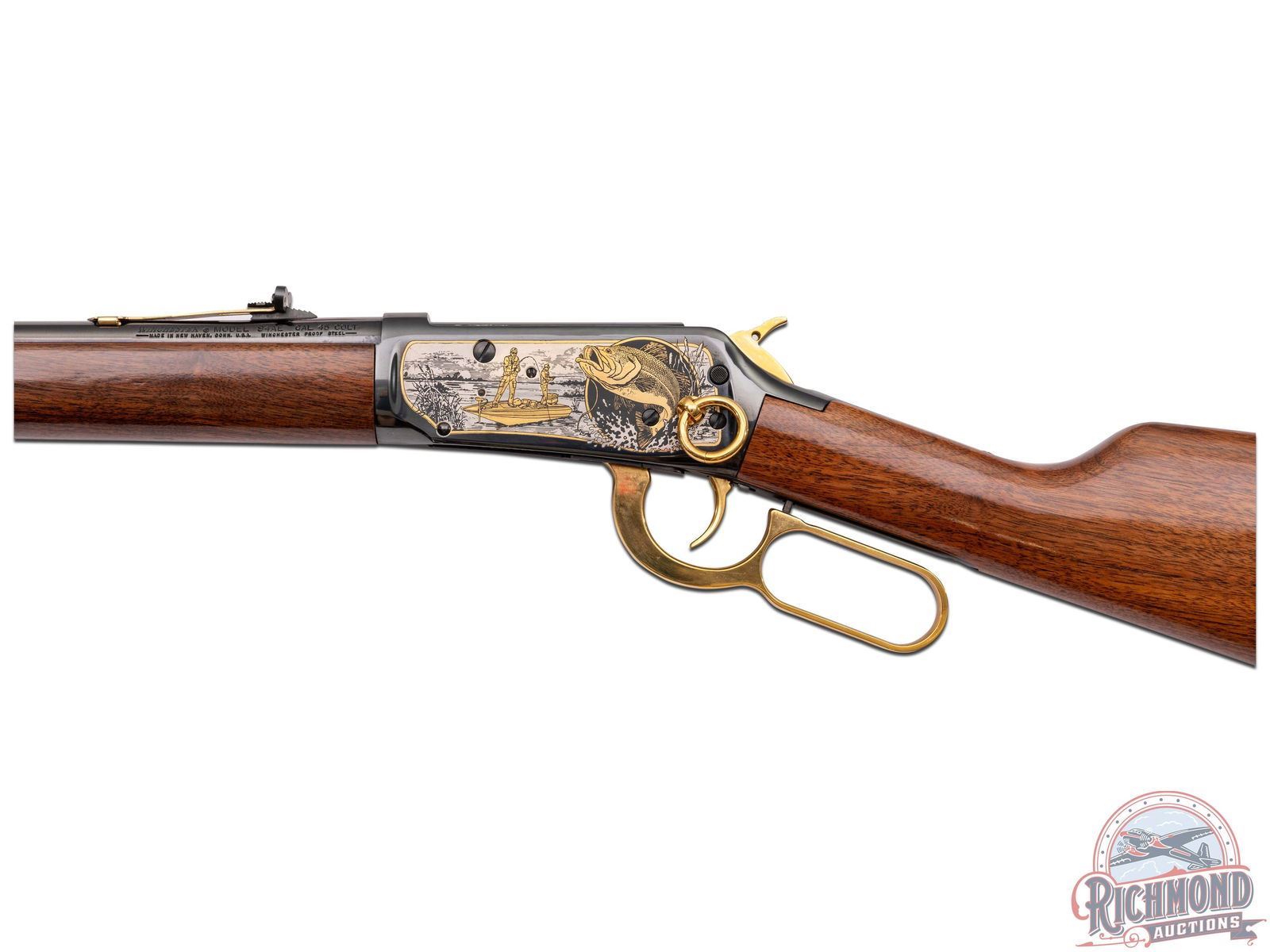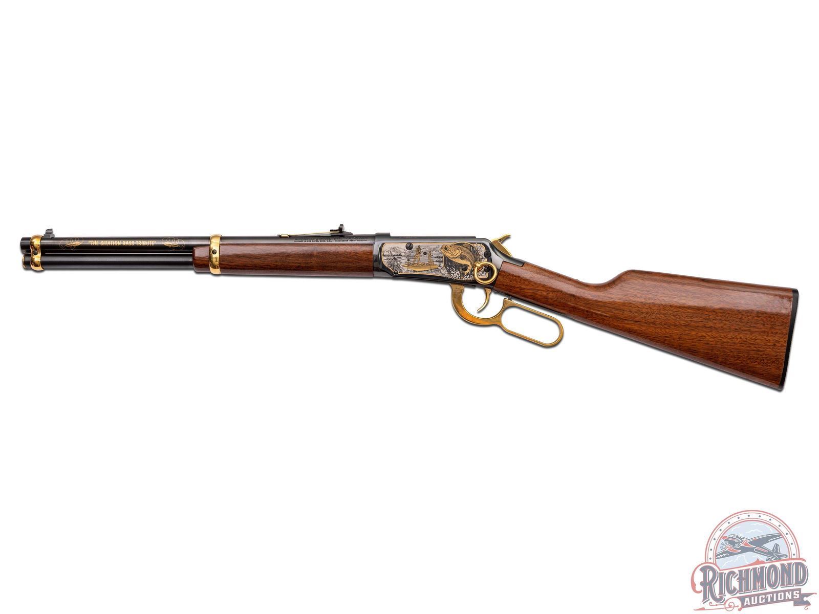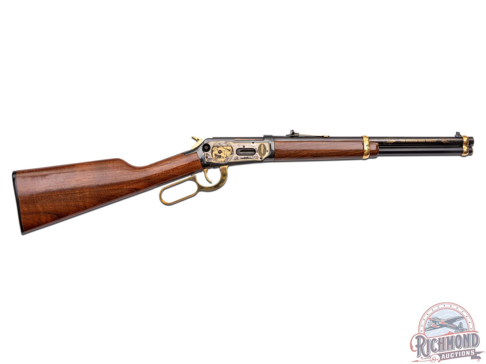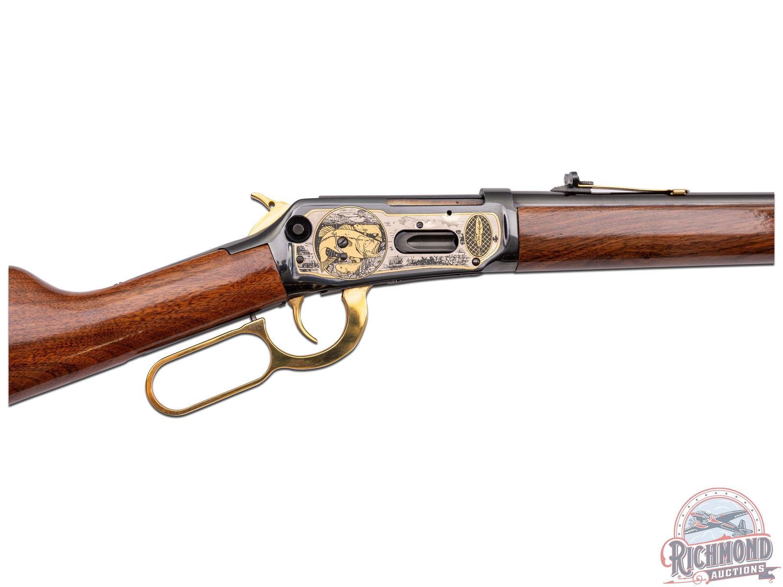 This limited edition 94AE Trapper pays tribute to two outdoor passions - hunting & fishing. This rifle features a 16" round blued barrel with rear notch sight with white diamond insert and blade front sight. Rear sight plate is gold washed as well as the barrel rings. Full length barrel magazine tube with gold washed end cap. On both sides of the barrel is stamped in gold "THE CITATION BASS TRIBUTE" between two multi-jointed fishing lures. Top of the barrel is stamped "AMERICA REMEMBERS AHL, MECHANICSVILLE VA". Two line Winchester address, model, and 45 Colt caliber stamped on the left side of the barrel near the receiver. Blued receiver with nickel and gold scenes on each side. Left side of receiver features a giant largemouth bass and two fishermen on their bass boat awaiting a strike. Topping off the images is a gold-clad saddle ring. Right side of receiver portrays the underwater perspective of the bass ready to strike a lure with a Steelhead trout and Catfish in the background. In front of the loading gate an image of an antique fishing plug against a backdrop of a fisherman's net. Push bolt safety. Gold washed lever, trigger and hammer. Tang is stamped with number "003 of 300" in gold. Nice straight walnut wood stock and matching forearm. Fitted with a factory Winchester checkered synthetic butt plate. LOP: 13-1/2". CALIBER: 45 COLT. S/N: 6244903. FFL STATUS: Modern.