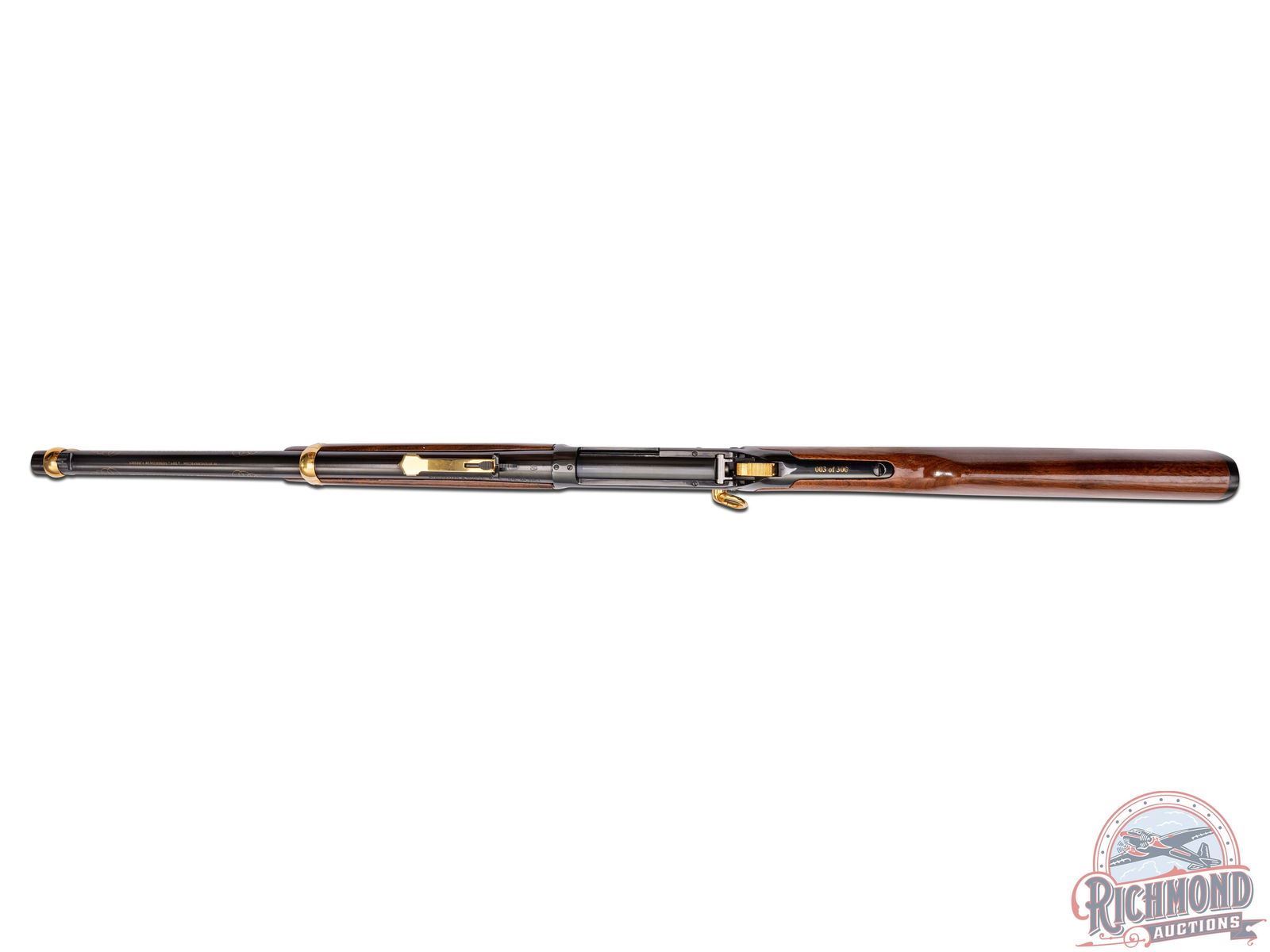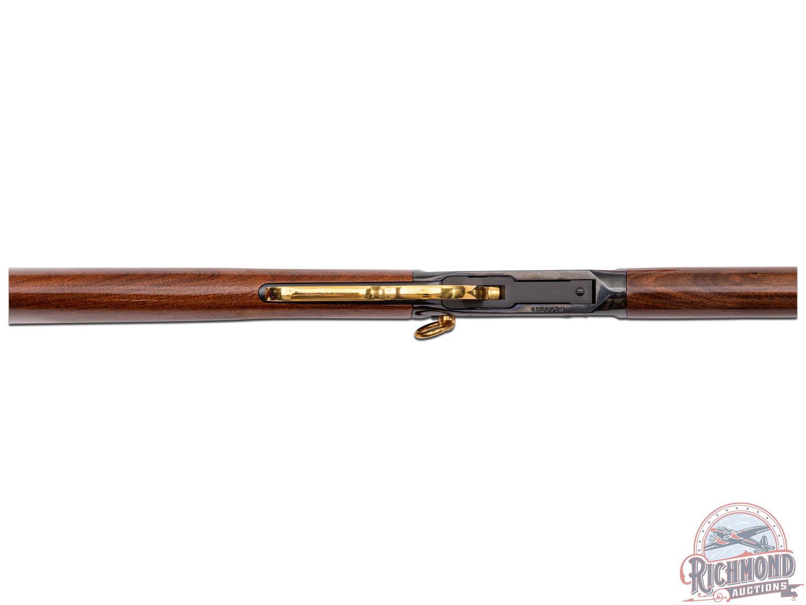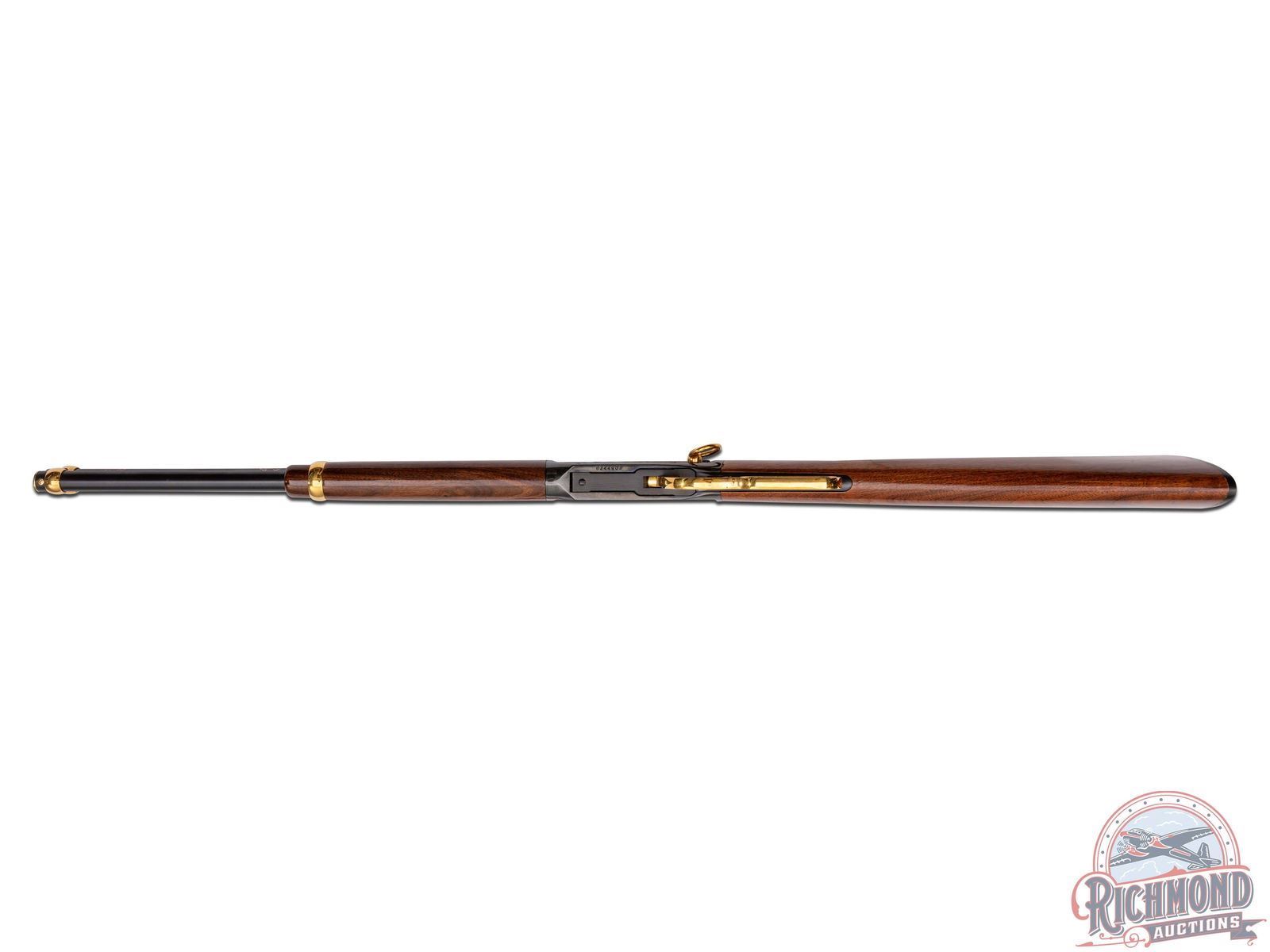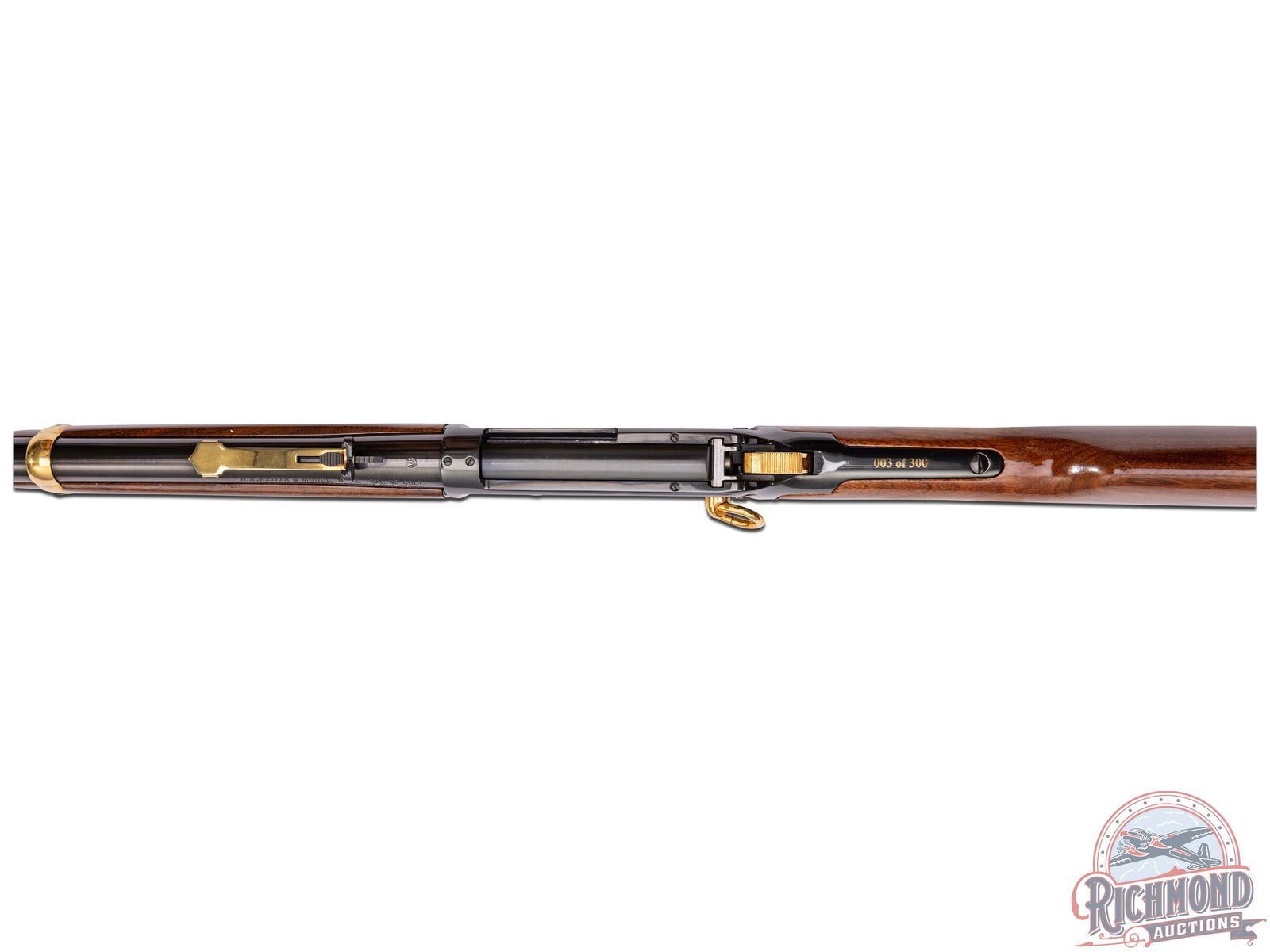 This limited edition 94AE Trapper pays tribute to two outdoor passions - hunting & fishing. This rifle features a 16" round blued barrel with rear notch sight with white diamond insert and blade front sight. Rear sight plate is gold washed as well as the barrel rings. Full length barrel magazine tube with gold washed end cap. On both sides of the barrel is stamped in gold "THE CITATION BASS TRIBUTE" between two multi-jointed fishing lures. Top of the barrel is stamped "AMERICA REMEMBERS AHL, MECHANICSVILLE VA". Two line Winchester address, model, and 45 Colt caliber stamped on the left side of the barrel near the receiver. Blued receiver with nickel and gold scenes on each side. Left side of receiver features a giant largemouth bass and two fishermen on their bass boat awaiting a strike. Topping off the images is a gold-clad saddle ring. Right side of receiver portrays the underwater perspective of the bass ready to strike a lure with a Steelhead trout and Catfish in the background. In front of the loading gate an image of an antique fishing plug against a backdrop of a fisherman's net. Push bolt safety. Gold washed lever, trigger and hammer. Tang is stamped with number "003 of 300" in gold. Nice straight walnut wood stock and matching forearm. Fitted with a factory Winchester checkered synthetic butt plate. LOP: 13-1/2". CALIBER: 45 COLT. S/N: 6244903. FFL STATUS: Modern.