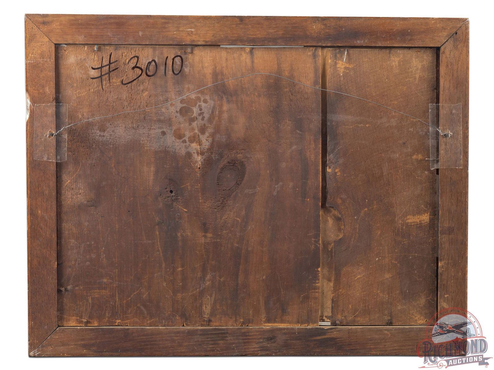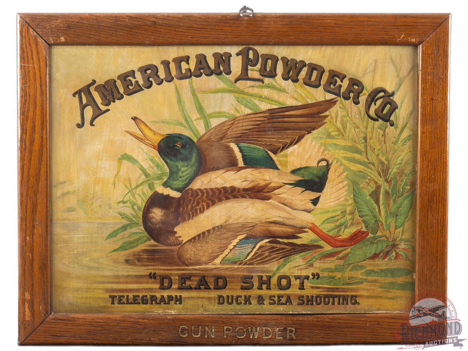 Incredibly rare cardboard poster by American Powder with striking color and mallard graphic. Exhibits general age wear including some discoloration and surface wear, predominately along the right and bottom edges. The piece has a few tiny spots of surface residue and loss with a thin area of surface loss near four o'clock. Exhibits some areas of professional touch up and restoration. Mounted in a wood frame, without glass, and "Gun Powder" etched and gold painted along the bottom edge. Overall, a stunning piece of early sportsman advertising. 20.25" H x 26.25" W.