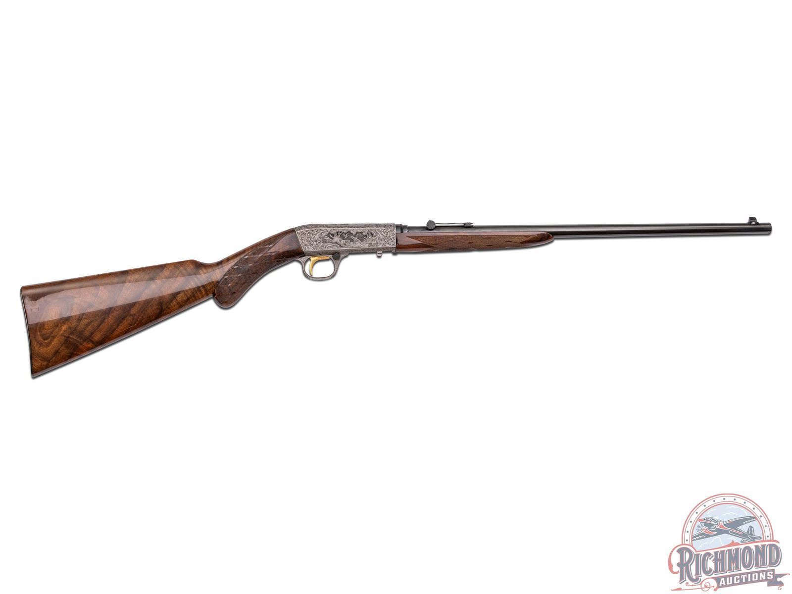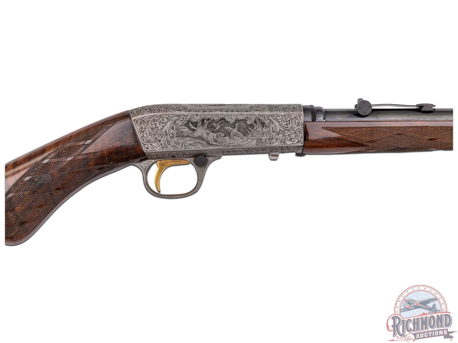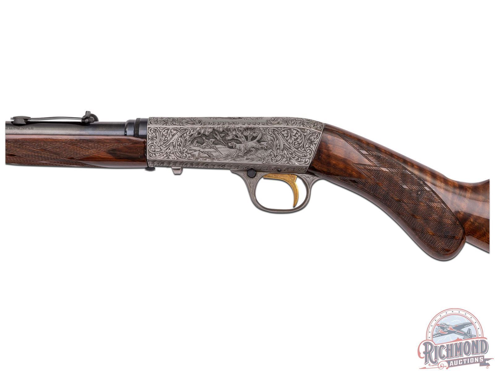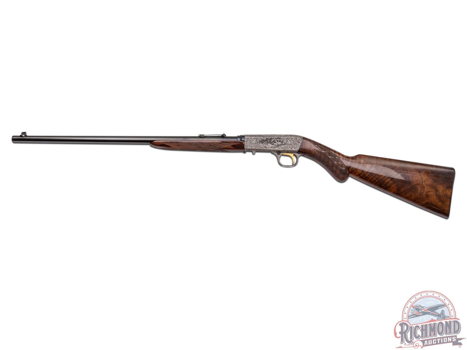 Made in Herstal, Belgium by Browning, circa 1958. These top loader 1914 Model "A" semi-automatics are some of the scarcest Browning's in the U.S. due to the fact that they were not imported in great quantities. This fine rifle also has the feature of being engraved and signed by master engraver Angelo Bee and will be featured in the up and coming book on said engraver. Rifle has round fluid steel blued scarce 19-1/4" barrel in 22 Long Rifle caliber with bead front pedestal front sight and "wheel" rear notch sight with Browning Arms St. Louis, Missouri address and caliber marking, which dates this rifle to circa 1958. Satin finished takedown Grade III chisel engraved frame with setter flushing ducks on right side and setter flushing pheasants on left with top having a dog holding a bird in its mouth. Right side of action is signed "A. Bee" above safety button. Action has gold washed trigger and push button safety. Highly figured walnut round knob pistol grip stock with skip-line checkering, blued steel butt plate, and rare top loading port at comb with detachable magazine tube. Matching walnut skip-line checkered forearm with single bolt attachment. LOP: 13-3/4". DAC: 1-3/16". DAH: 2-5/8". CALIBER: 22LR. S/N: T55195. FFL STATUS: Curio & Relic.