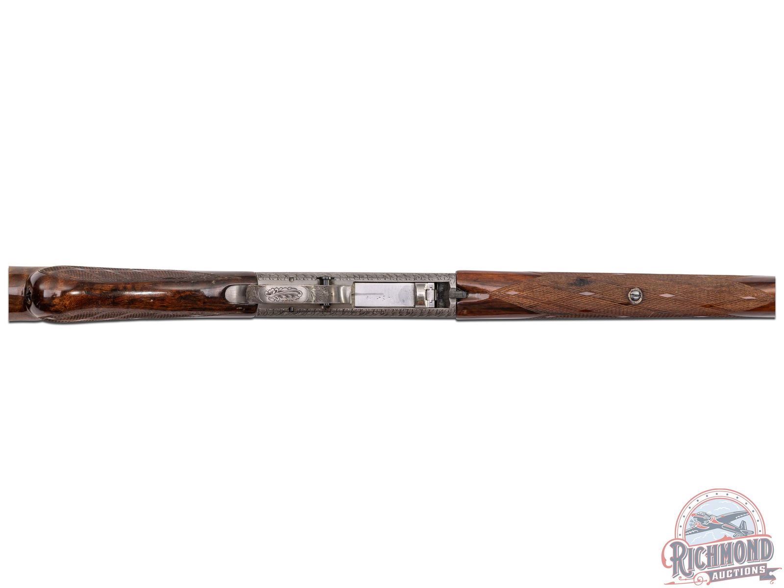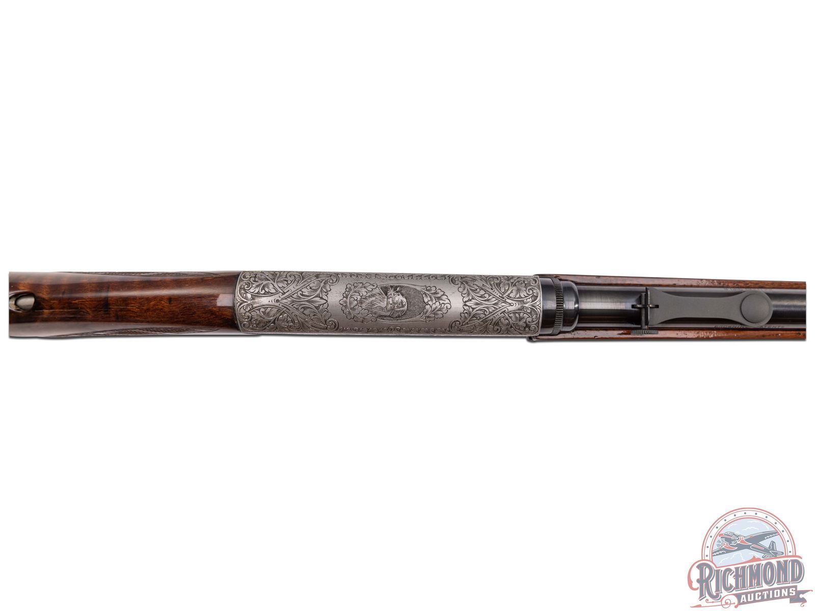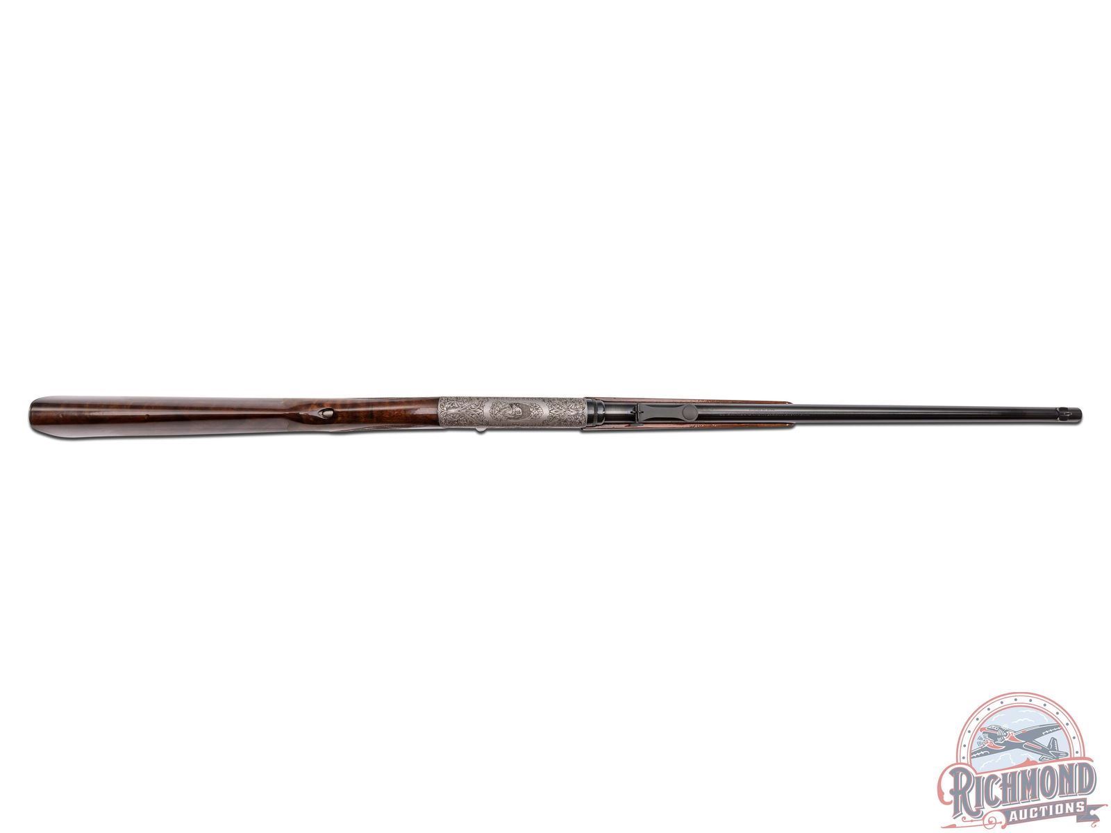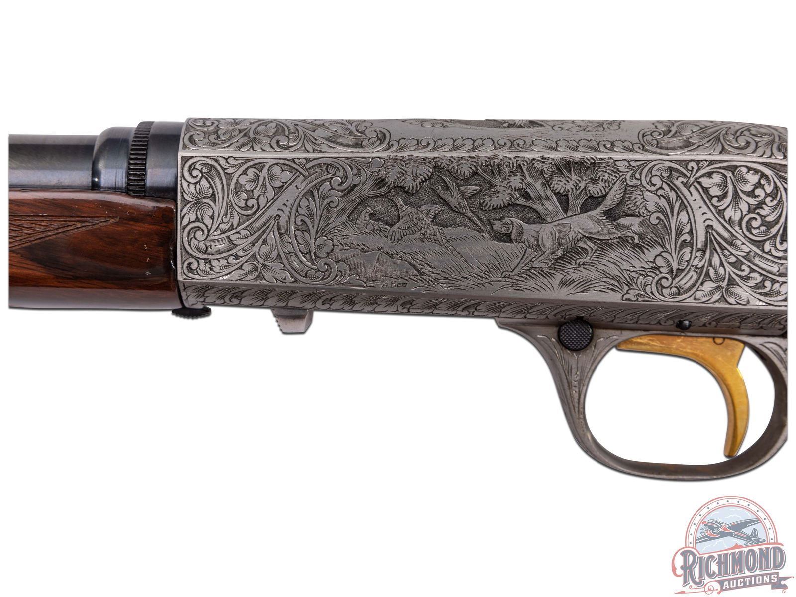 Made in Herstal, Belgium by Browning, circa 1958. These top loader 1914 Model "A" semi-automatics are some of the scarcest Browning's in the U.S. due to the fact that they were not imported in great quantities. This fine rifle also has the feature of being engraved and signed by master engraver Angelo Bee and will be featured in the up and coming book on said engraver. Rifle has round fluid steel blued scarce 19-1/4" barrel in 22 Long Rifle caliber with bead front pedestal front sight and "wheel" rear notch sight with Browning Arms St. Louis, Missouri address and caliber marking, which dates this rifle to circa 1958. Satin finished takedown Grade III chisel engraved frame with setter flushing ducks on right side and setter flushing pheasants on left with top having a dog holding a bird in its mouth. Right side of action is signed "A. Bee" above safety button. Action has gold washed trigger and push button safety. Highly figured walnut round knob pistol grip stock with skip-line checkering, blued steel butt plate, and rare top loading port at comb with detachable magazine tube. Matching walnut skip-line checkered forearm with single bolt attachment. LOP: 13-3/4". DAC: 1-3/16". DAH: 2-5/8". CALIBER: 22LR. S/N: T55195. FFL STATUS: Curio & Relic.