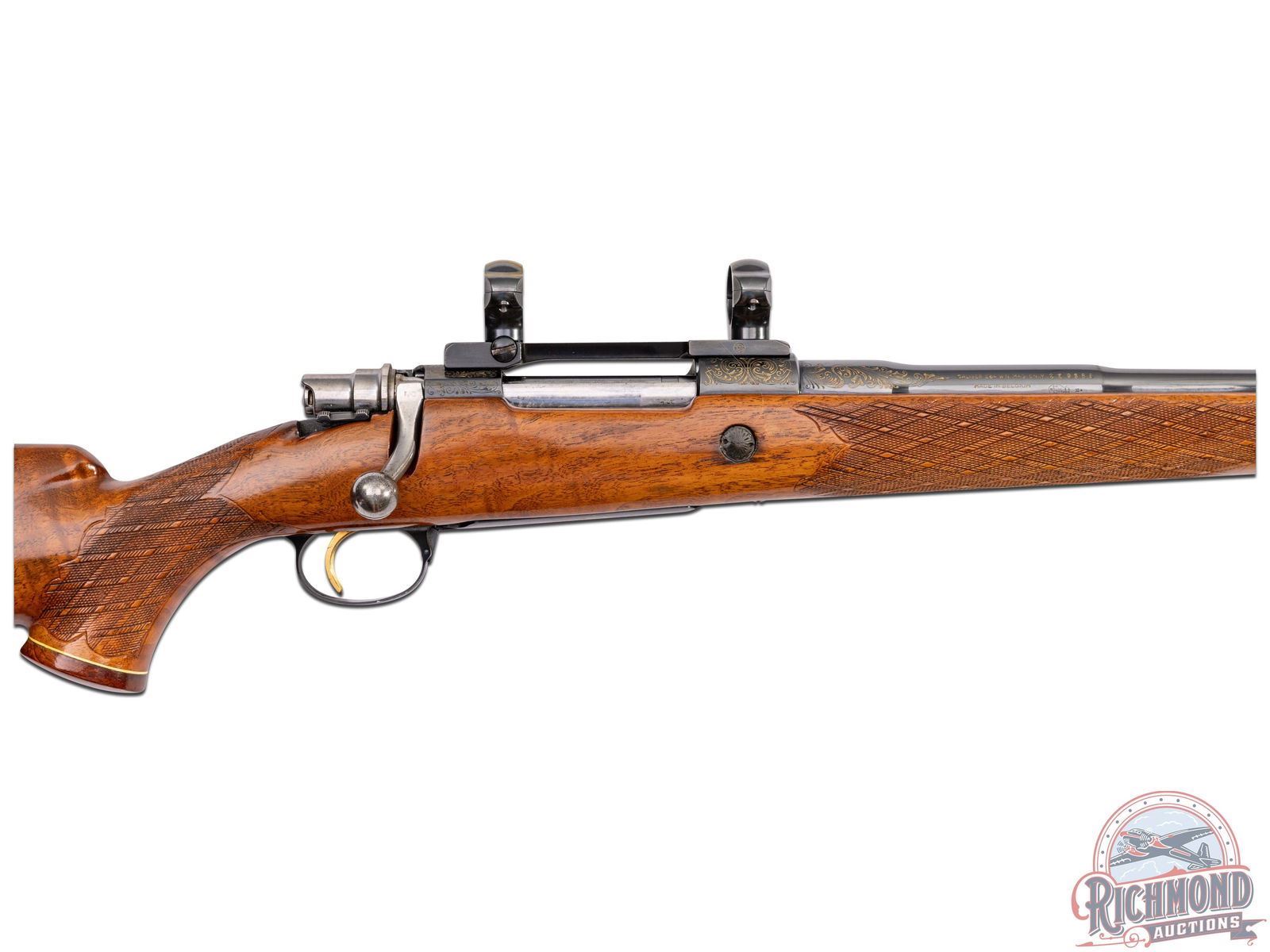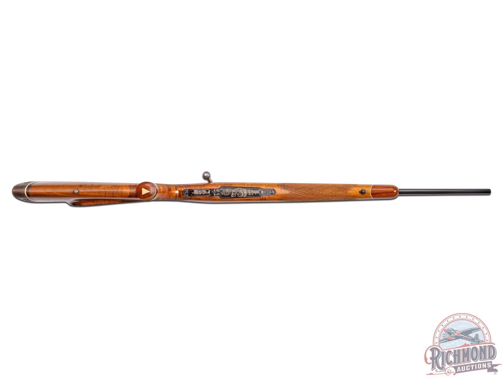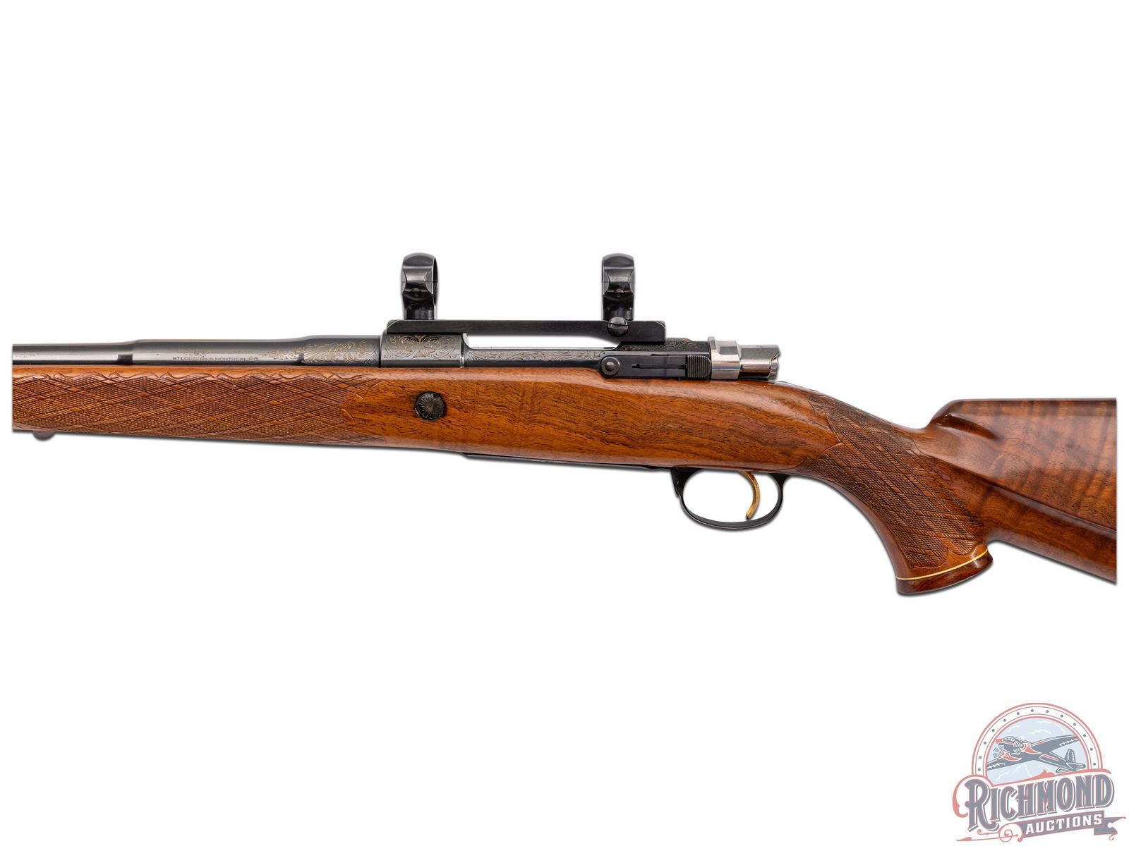 Made in Herstal, Belgium by Browning in 1962, which was the 2nd year of production of this model. 22" blued medium weight, floral breech engraved, sightless, tapered round barrel in rare 264 Winchester Magnum caliber. Blued floral engraved F.N. action with polished bolt, long extractor, two position side safety, and controlled with gold washed serrated trigger. Blued detachable floorplate with gold washed Medallion Grade Ram's Head engraving. Action is fitted with one piece Redfield base and rings. All markings and engraving is gold washed. Light tone walnut single stock bolt Monte Carlo pistol grip stock with right hand cheekpiece, skip-line checkering, and contrasting Rosewood forend and grip cap, and added Pachmayr recoil pad. LOP: 14". DAC: 1-1/4". DAH: 2". CALIBER: 264 Win Mag. S/N: 2X9385. FFL STATUS: Curio & Relic.