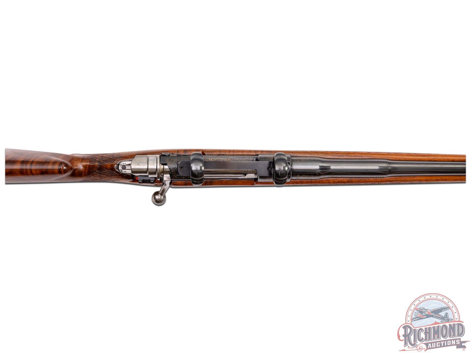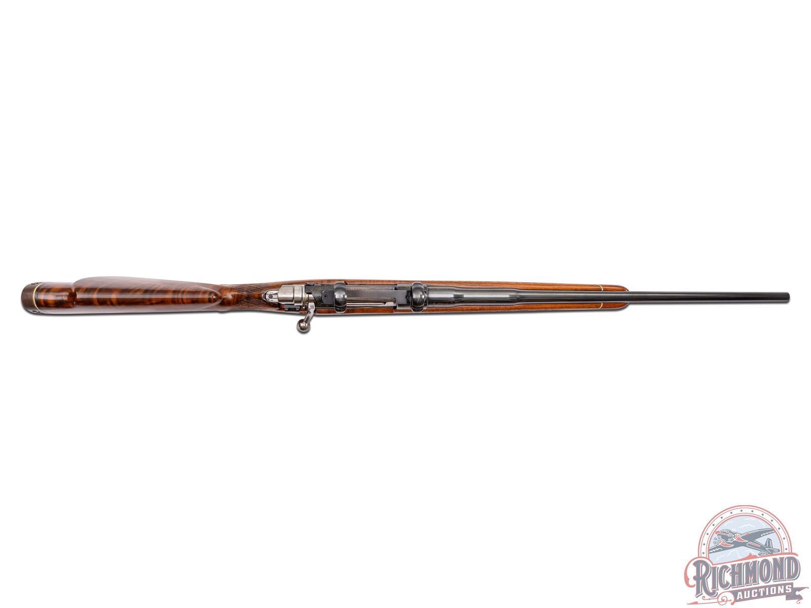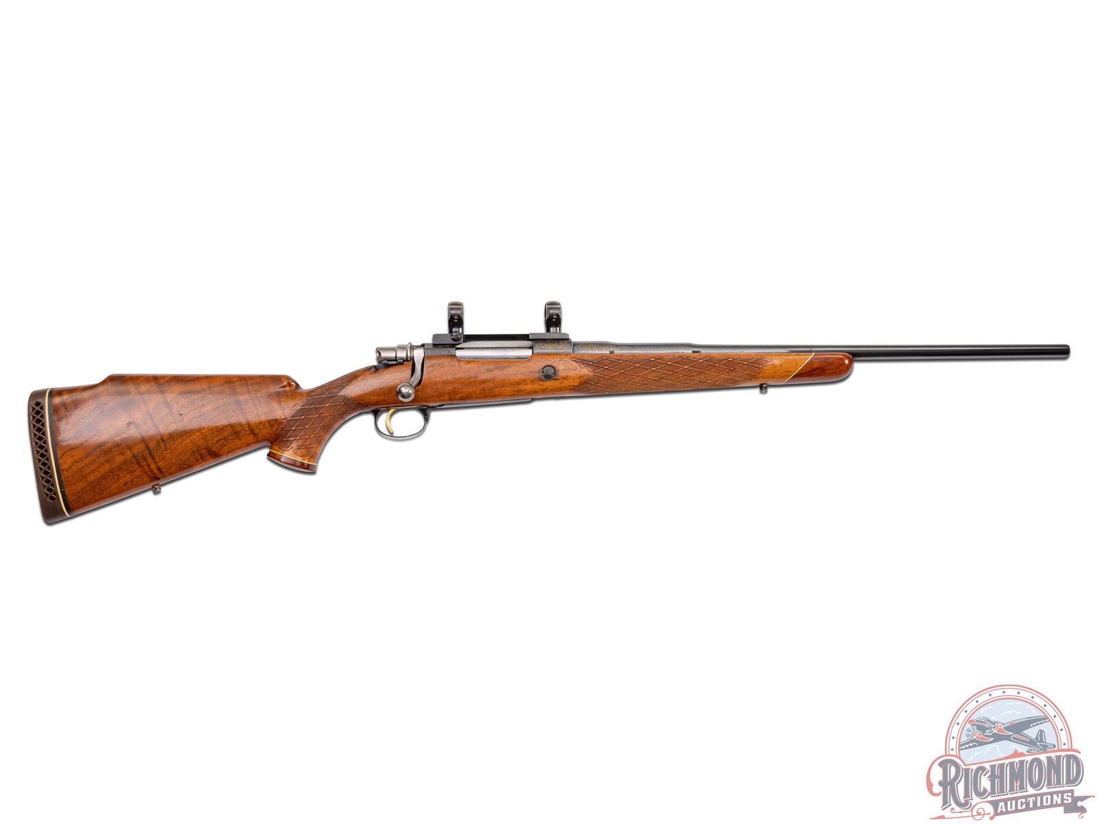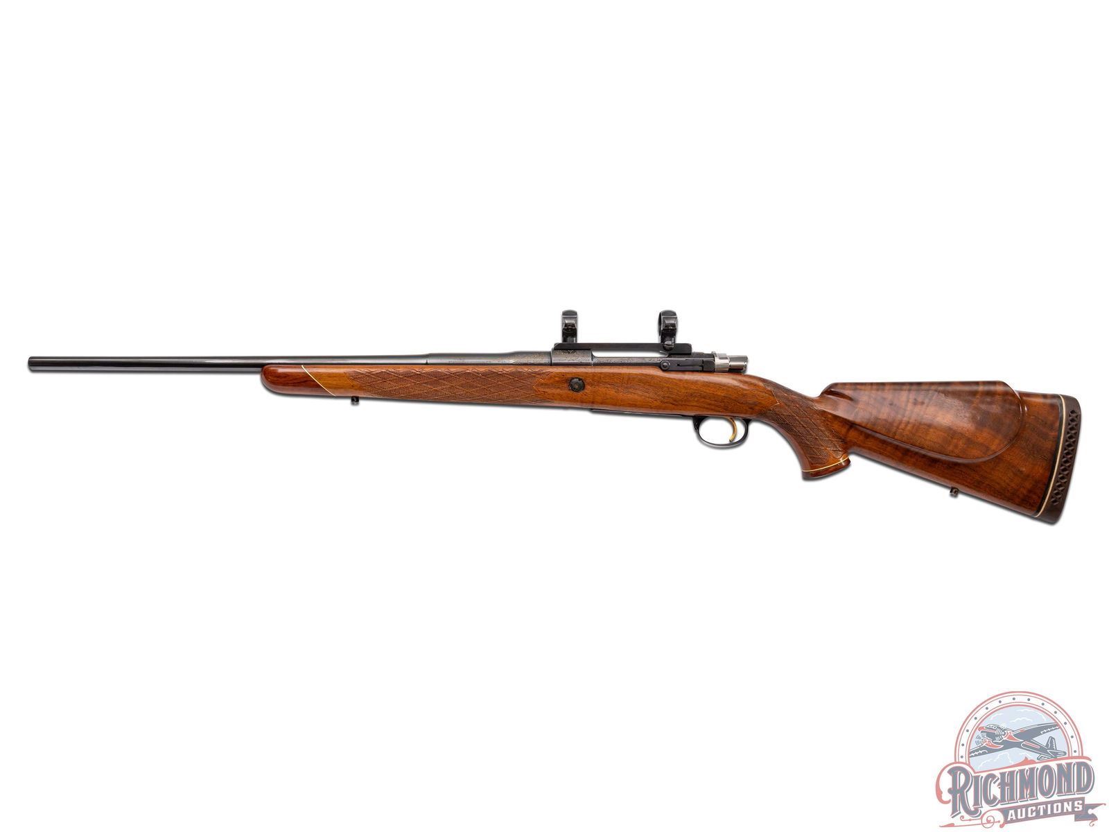 Made in Herstal, Belgium by Browning in 1962, which was the 2nd year of production of this model. 22" blued medium weight, floral breech engraved, sightless, tapered round barrel in rare 264 Winchester Magnum caliber. Blued floral engraved F.N. action with polished bolt, long extractor, two position side safety, and controlled with gold washed serrated trigger. Blued detachable floorplate with gold washed Medallion Grade Ram's Head engraving. Action is fitted with one piece Redfield base and rings. All markings and engraving is gold washed. Light tone walnut single stock bolt Monte Carlo pistol grip stock with right hand cheekpiece, skip-line checkering, and contrasting Rosewood forend and grip cap, and added Pachmayr recoil pad. LOP: 14". DAC: 1-1/4". DAH: 2". CALIBER: 264 Win Mag. S/N: 2X9385. FFL STATUS: Curio & Relic.