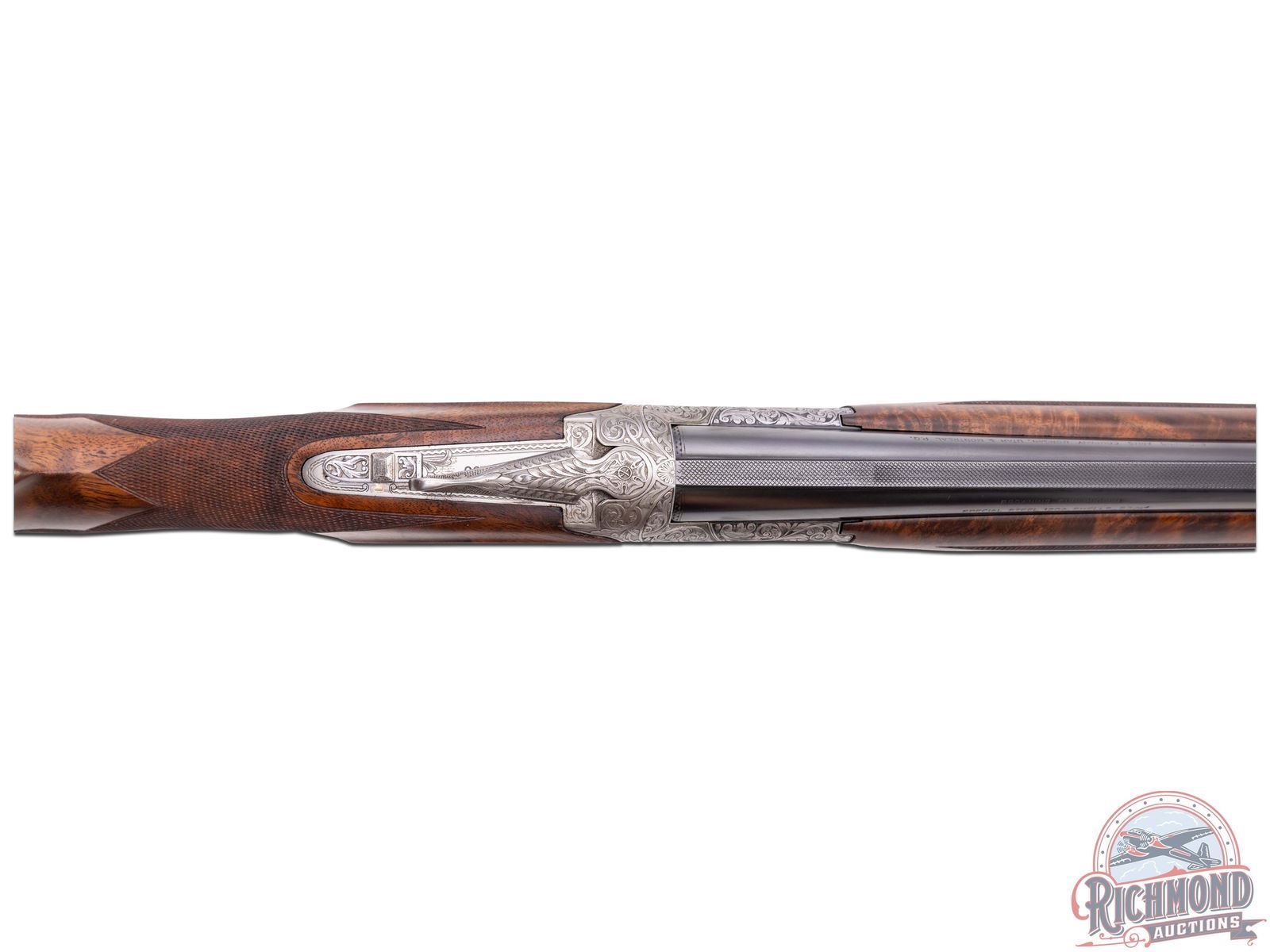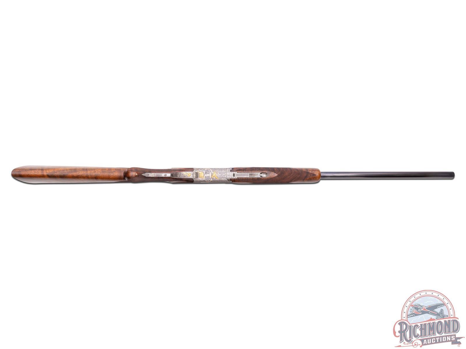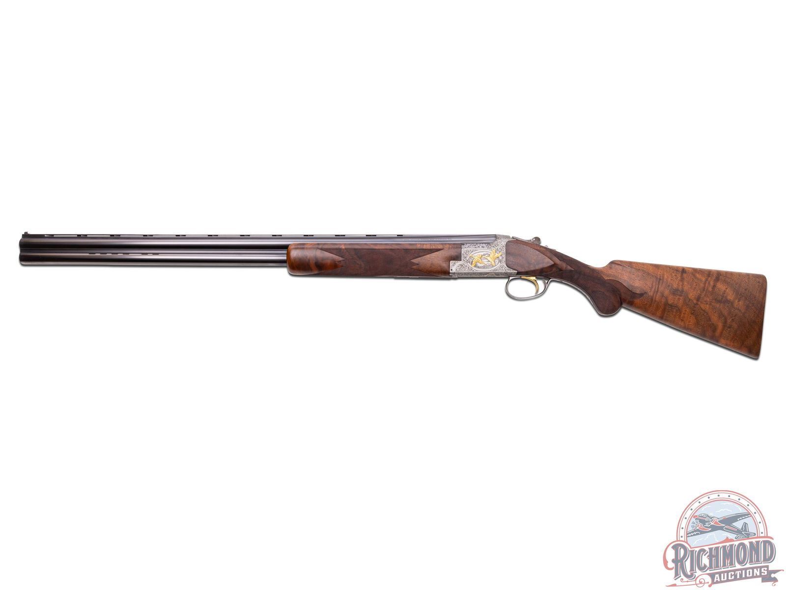 Made in Herstal, Belgium by Browning in 1981 and marketed only in 1982 until supplies were gone in 1982. This gun is number 100 of 500 made of this edition. 28" blued Ported Special Steel barrels with ventilated rib, twin bead Hi-Viz sights, ejectors, and Invector chokes. Barrel has Browning Utah and Montreal address markings, along with steel and patents in 12 gauge caliber with 2-3/4" chambers. Satin gray finished receiver with floral engraving done by Jose Baerten with right side having a floral background with two gold ducks in flight with oval scene having a gold line border. Left side features two gold ducks in flight in oval gold border with panel signed "J. Baerten". Bottom has two gold ducks with floral background with "Pintail Anas Acuta" phrase in gold with "100 of 500" in gold. Action has gold washed single selective trigger with top tang safety and selector. Trigger is protected by satin finished floral trigger guard with gold "Duck Head" on bow. Walnut figured fine checkered round knob long tang pistol grip stock in floral pattern with skip-line checkered wood butt. Matching sporting style attached checkered forearm with latch release. Comes in fitted black walnut case with brass hardware and extra Invector choke tube and wrench. LOP: 14-1/4". DAC: 1-1/2". DAH: 2". CALIBER: 12 GA. S/N: 8H4PZ00100. FFL STATUS: Modern.