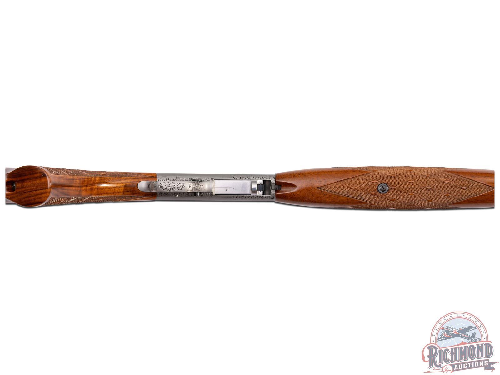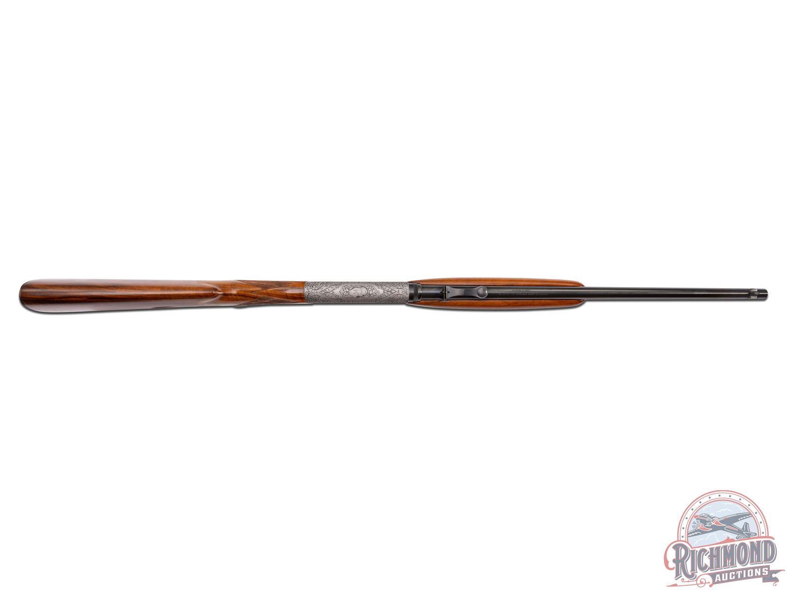 Made in Herstal, Belgium by Browning in 1957. This is the 2nd year of importation of this model. 19-1/4" blued fluid steel round barrel with bead pedestal front sight and desirable early "Wheel" rear sight with Browning St. Louis, Missouri address in 22 Long Rifle caliber. Satin finished takedown action with early Grade III engraving featuring setter flushing ducks on right side and setter chasing pheasants on left with floral and dog holding bird scene on top with gold-plated trigger and push button safety. Unfortunately not engraver signed but some of the best early guns were Felix Funken engraved. Blonde walnut pistol grip stock with side loading port, skip-line checkering, and blued serrated serial numbered butt plate. Matching walnut swelled skip-line checkered forearm. LOP: 13-3/4". DAC: 1-3/16". DAH: 2-5/8". CALIBER: 22LR. S/N: 15017. FFL STATUS: Curio & Relic.