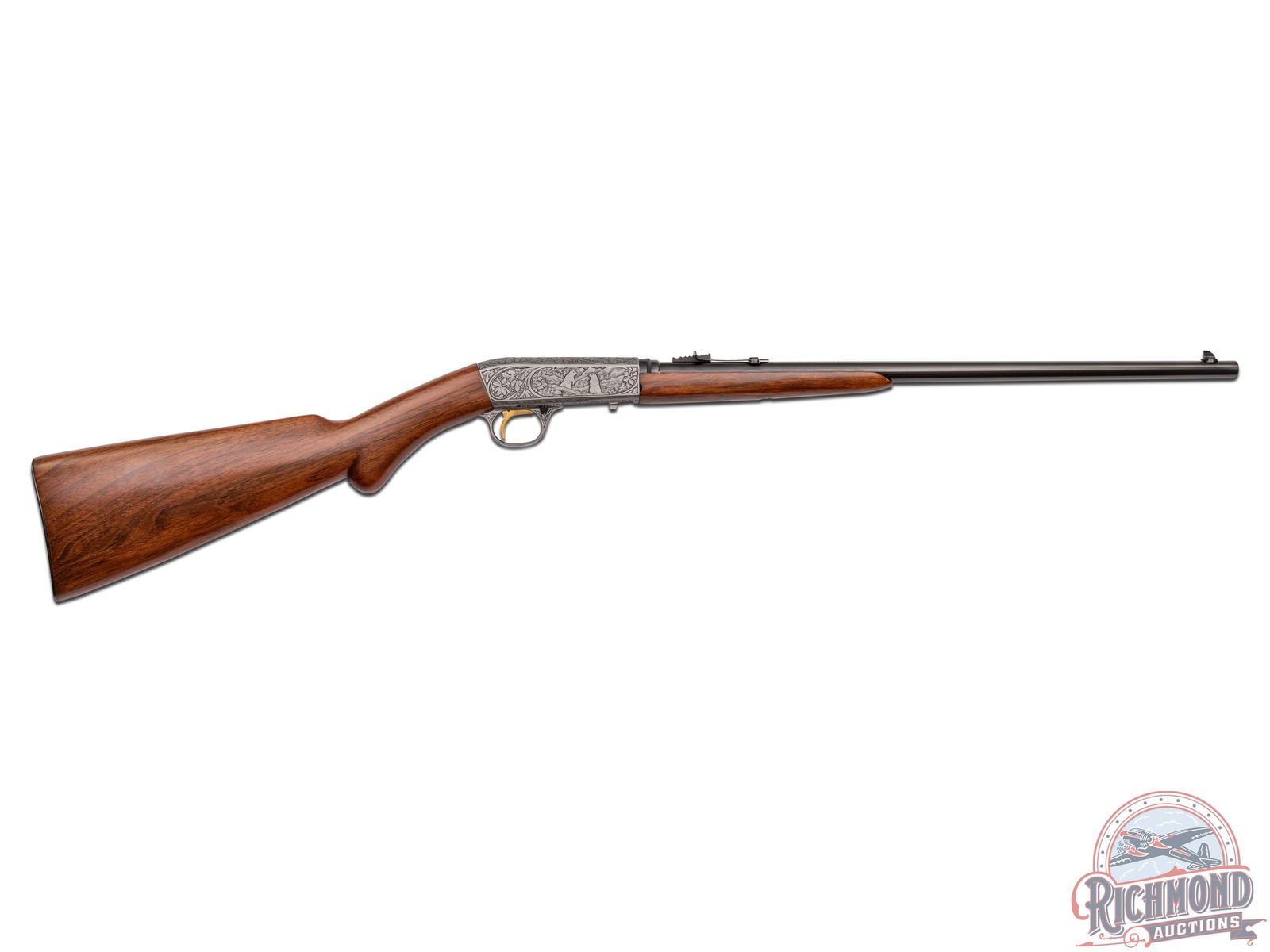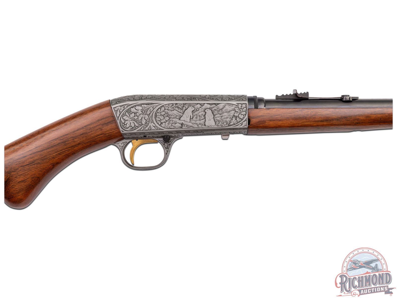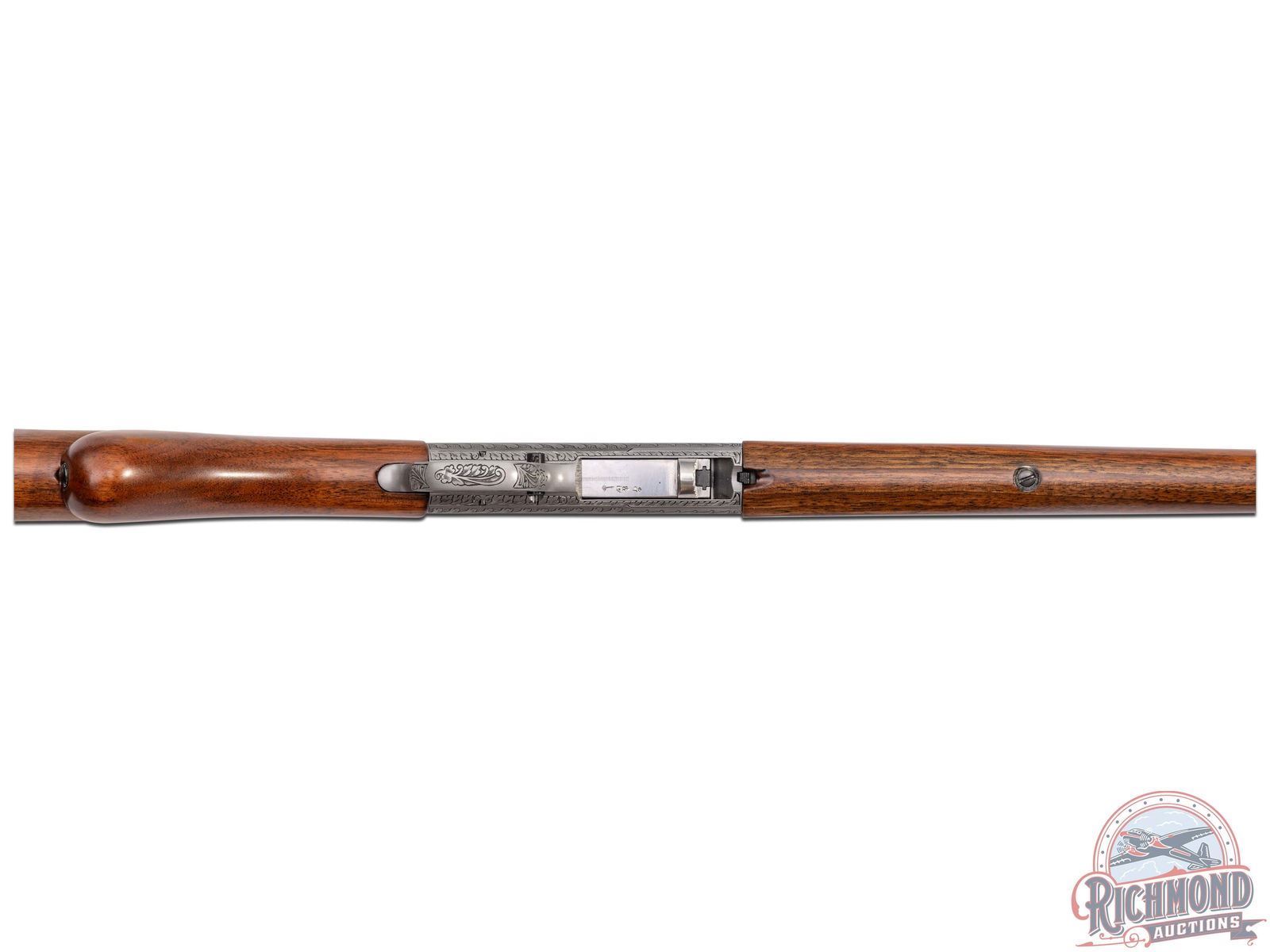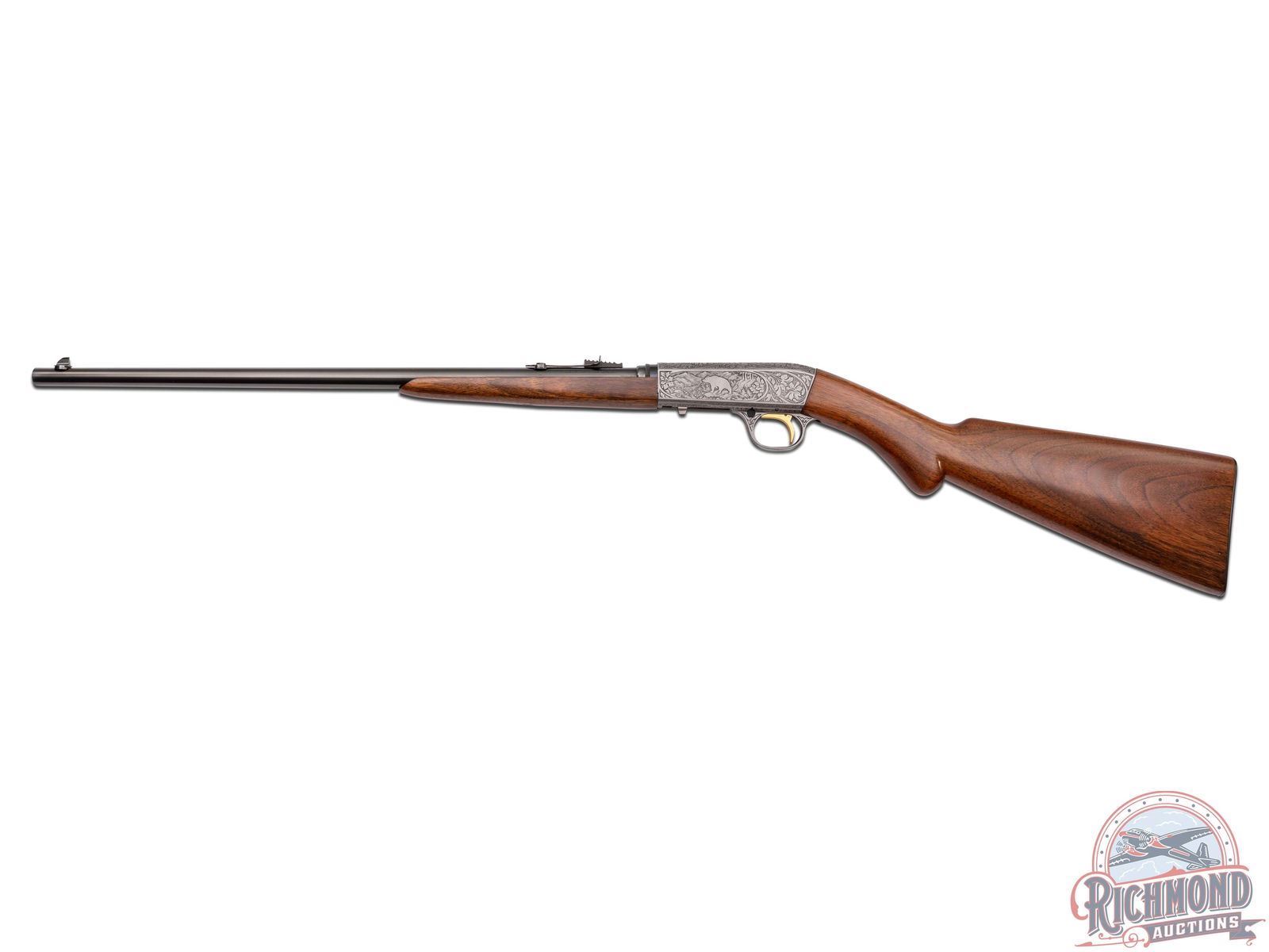 Made in Herstal, Belgium by Browning, Circa 1950, and known as the 1914 Model A. This rifle is the predecessor to the SA semi-automatic introduced in 1956 in the U.S. by Browning and previously made by Remington under Browning Patents as the Model 24. Although not rare outside of the U.S. examples seen in the U.S. are generally G.I. "PX' purchases or war trophies. This particular gun features a 19-1/4" blued round fluid steel barrel with bead pedestal front sight and stamped notch rear sight with Browning F.N. address and "172137" serial number stamped on underside of barrel. Barrel is in a takedown configuration in 22 Long Rifle caliber. Satin finish frame with deep chisel engraving, most likely done by Felix Funken. Engraving features pattern similar to Grade III post war gun with floral and prairie dog scene on right and floral and bear scene on left with top having floral scene with an unknown mark, possibly Felix Funken. Action has a blued finish, button safety, and gold washed trigger. Plain walnut round knob pistol grip stock with Model "A" loading port in front of comb and a blued steel butt plate and loading tube. Matching walnut splinter forearm with single screw attachment. A hard to find rifle. LOP: 13-3/4". DAC: 1-3/16". DAH: 2-5/8". CALIBER: 22LR. S/N: 172137. FFL STATUS: Curio & Relic.