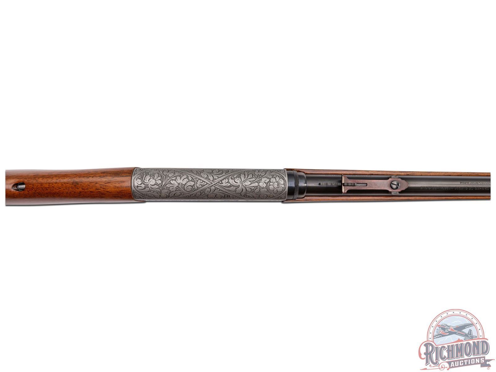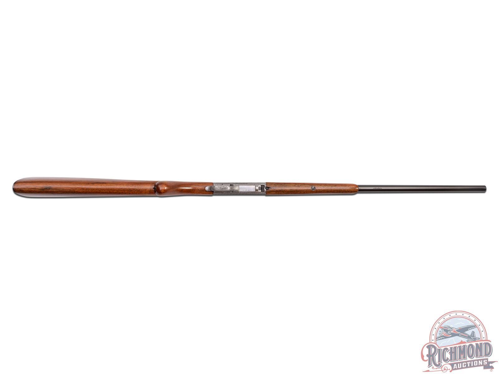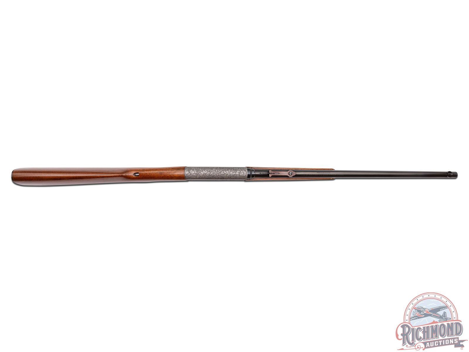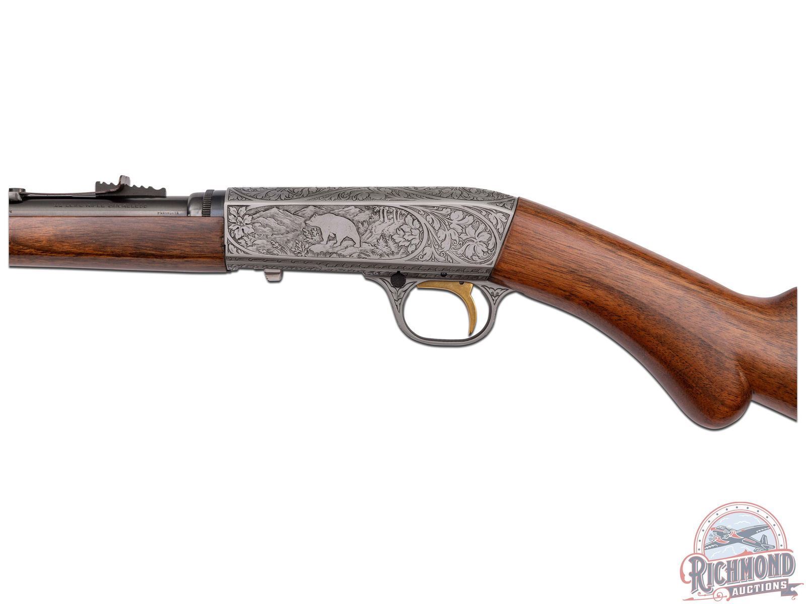 Made in Herstal, Belgium by Browning, Circa 1950, and known as the 1914 Model A. This rifle is the predecessor to the SA semi-automatic introduced in 1956 in the U.S. by Browning and previously made by Remington under Browning Patents as the Model 24. Although not rare outside of the U.S. examples seen in the U.S. are generally G.I. "PX' purchases or war trophies. This particular gun features a 19-1/4" blued round fluid steel barrel with bead pedestal front sight and stamped notch rear sight with Browning F.N. address and "172137" serial number stamped on underside of barrel. Barrel is in a takedown configuration in 22 Long Rifle caliber. Satin finish frame with deep chisel engraving, most likely done by Felix Funken. Engraving features pattern similar to Grade III post war gun with floral and prairie dog scene on right and floral and bear scene on left with top having floral scene with an unknown mark, possibly Felix Funken. Action has a blued finish, button safety, and gold washed trigger. Plain walnut round knob pistol grip stock with Model "A" loading port in front of comb and a blued steel butt plate and loading tube. Matching walnut splinter forearm with single screw attachment. A hard to find rifle. LOP: 13-3/4". DAC: 1-3/16". DAH: 2-5/8". CALIBER: 22LR. S/N: 172137. FFL STATUS: Curio & Relic.