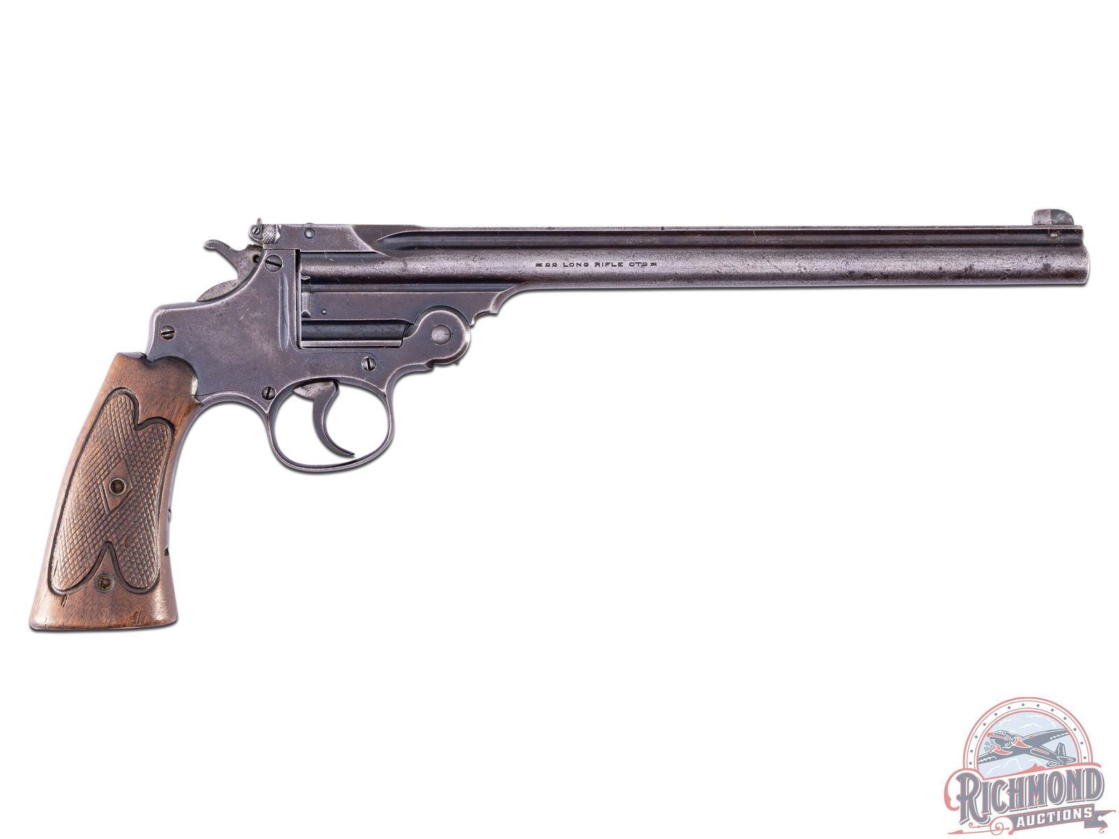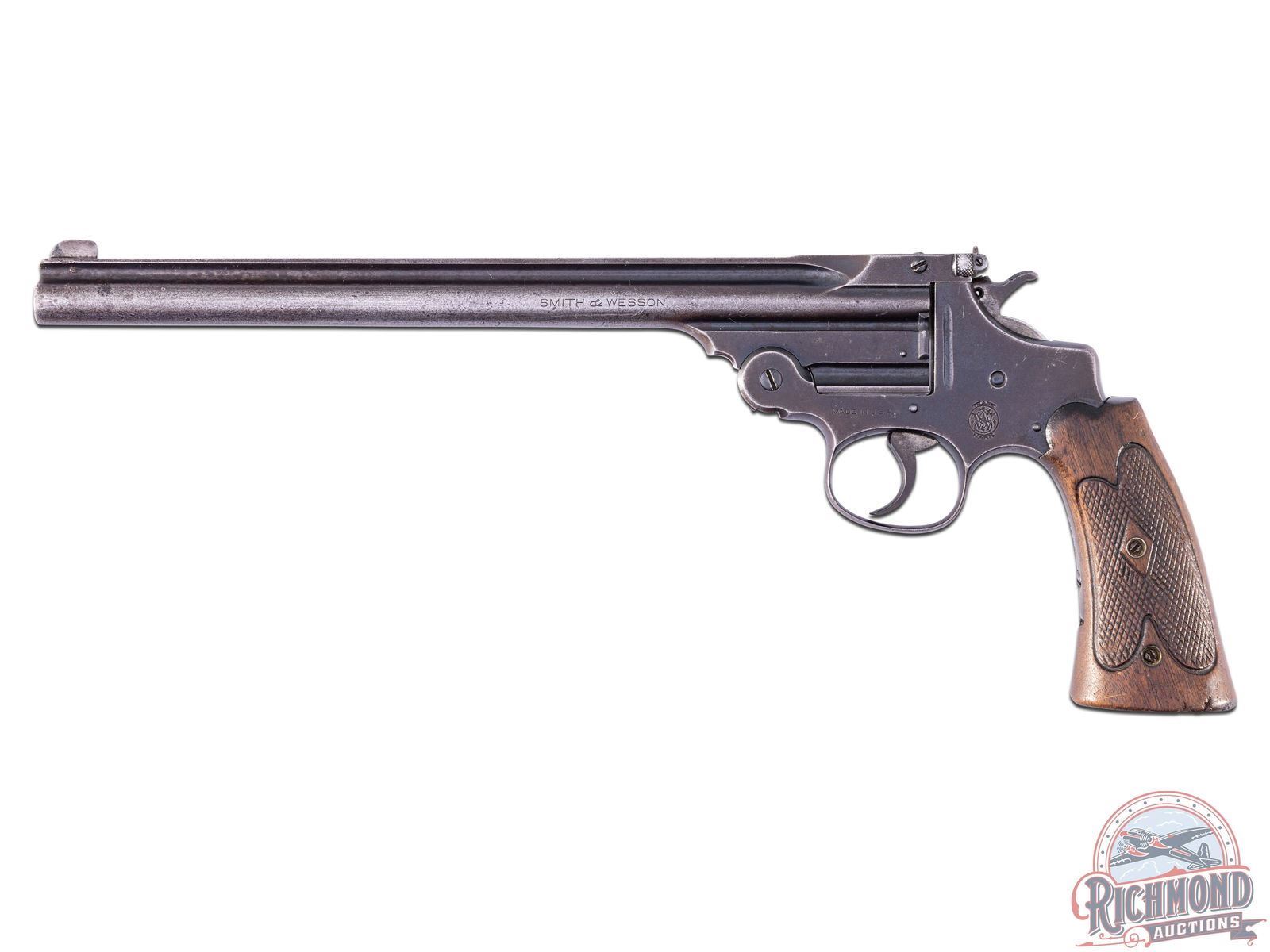 Manufactured by Smith & Wesson circa 1915. Features a 10" barrel with a solid ribbed barrel and stamped on top with the two line Smith and Wesson address. Pinned front blade sight and rear notch sight. Top latch breach opening. Works in single or double action. Fitted with factory hand-checkered walnut grips without the S&W logo. CALIBER: 22LR. S/N: 10625. FFL STATUS: Curio & Relic.