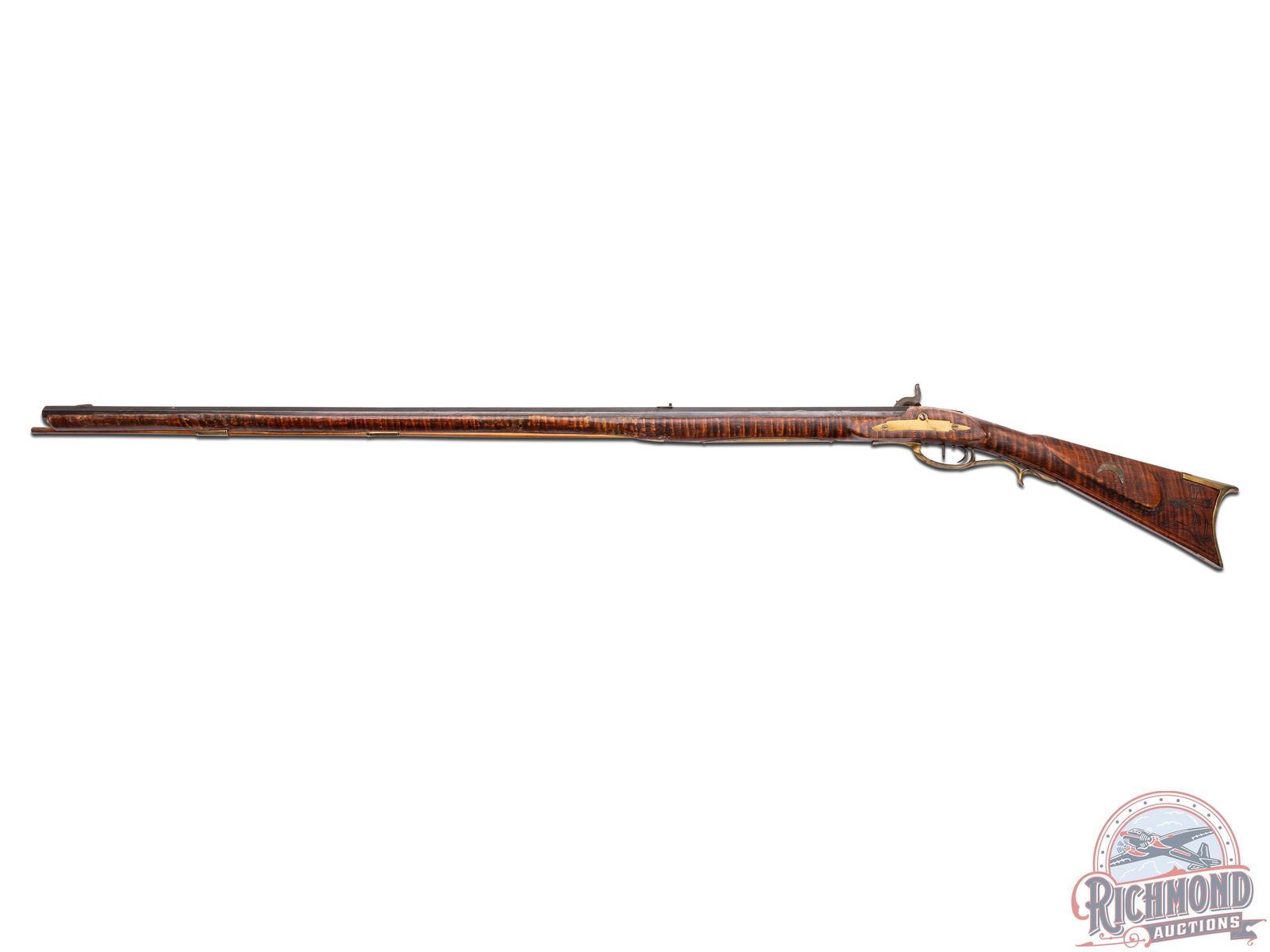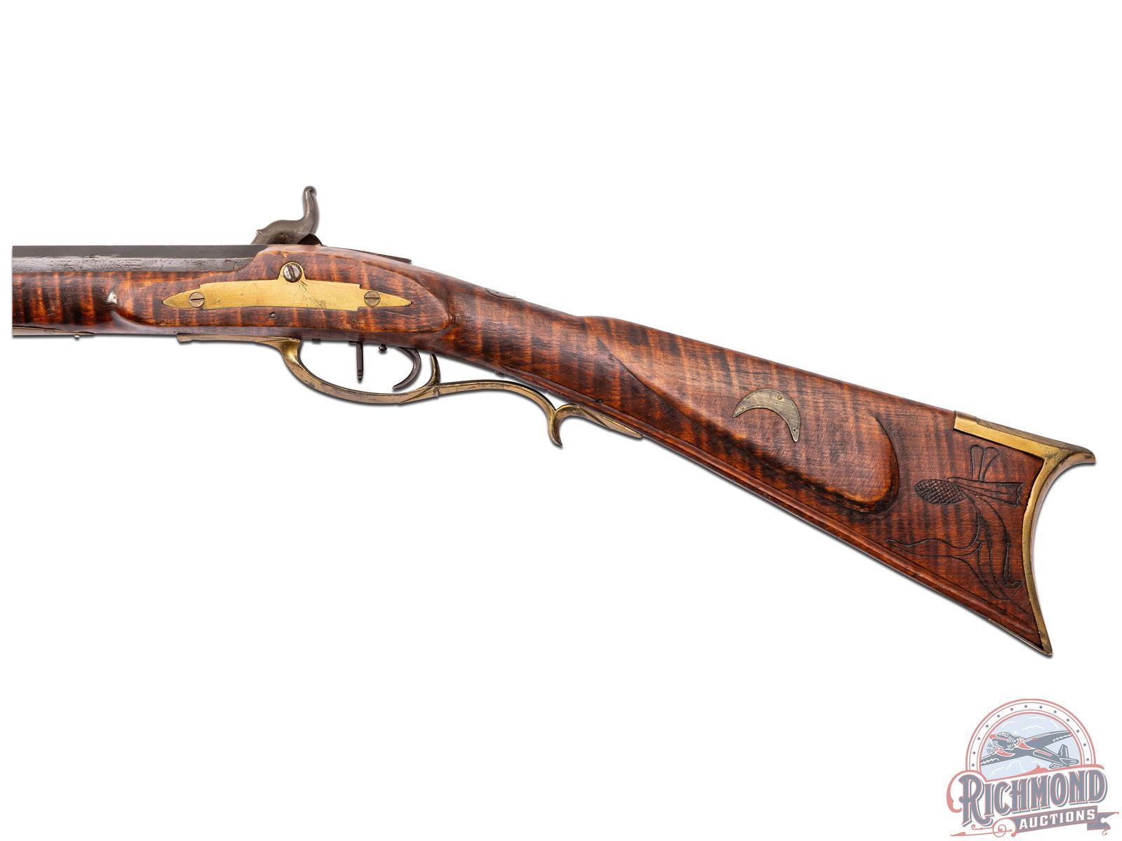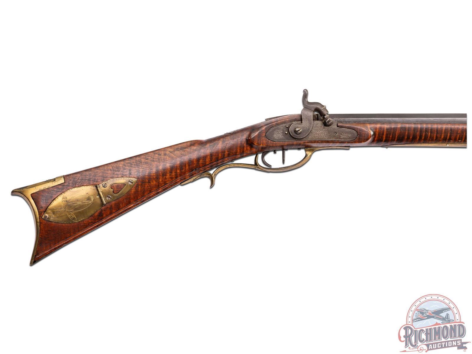 Percussion Kentucky rifle made in Ligonier, Westmoreland County, Pennsylvania, circa 1850. Rifle measures overall 56" with 41" octagon rifled barrel in 38 caliber with hunting sights and signed in script "B. McDowell". Bard McDowell was a sometimes gunsmith and shopkeeper from the Ligonier area. More information on McDowell can be found in the book "The Western Pennsylvania Rifle", by Richard Rosenberger and Charles Kaufmann. Rifle has a percussion Joseph Golcher lock with turned front trigger and rear set control. Full curly maple stock with cheekpiece with incise carving. Forestock has molding line and incise carving at tailpipe. Stock has typical Western PA brass hardware with unique two piece floral engraved patchbox with heart piercing and lid held in place with tapered wooden pin. Stock also has brass saddle plate, brass moon cheek inlay and brass thumbpiece. Comes with hardwood ramrod. CALIBER: 38. FFL STATUS: Antique.