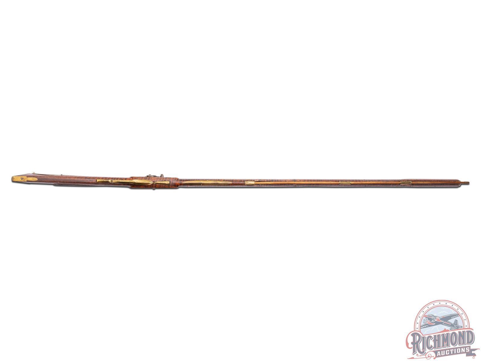 Overall good appearance with metal having a brown patina and brass having been coated with lacquer. Wood has been cleaned with crack in forestock and poor repair at the last ten inches of forestock. Dark bore with mechanics needing work.