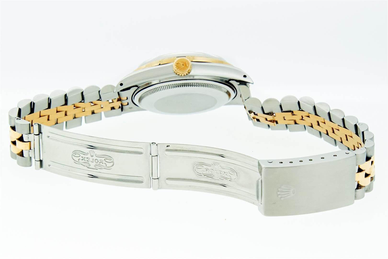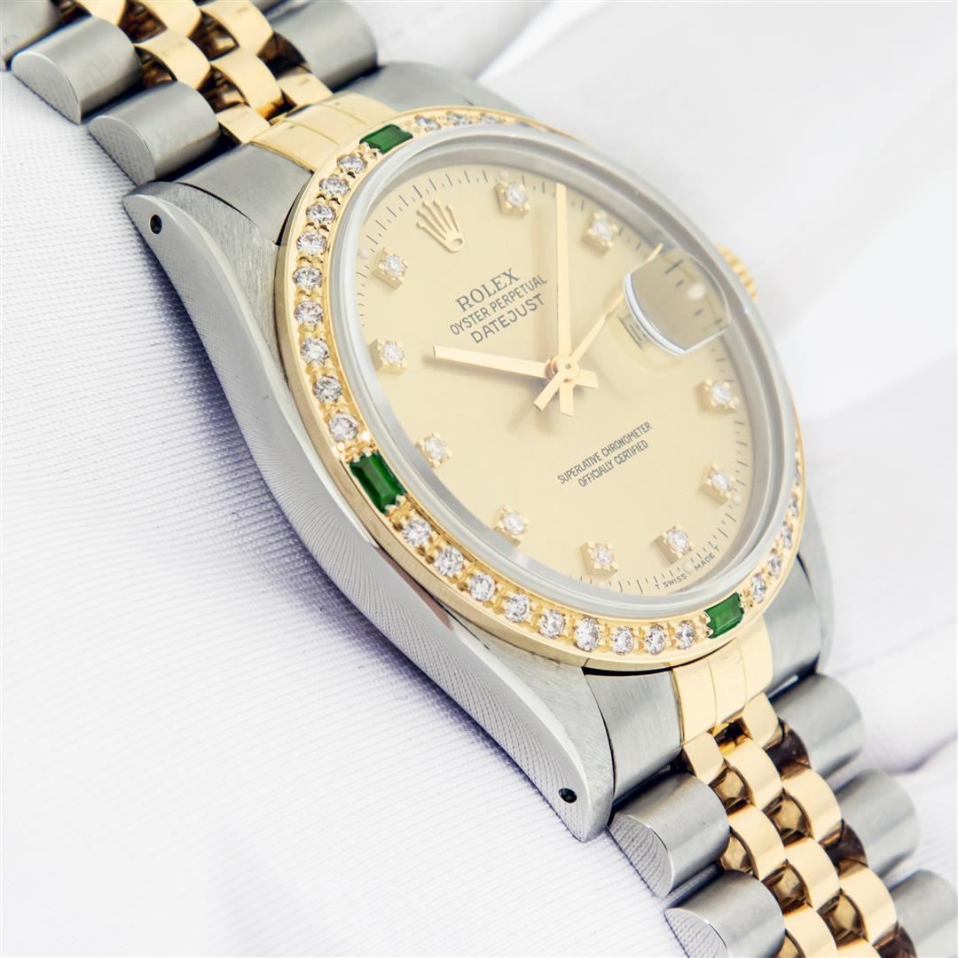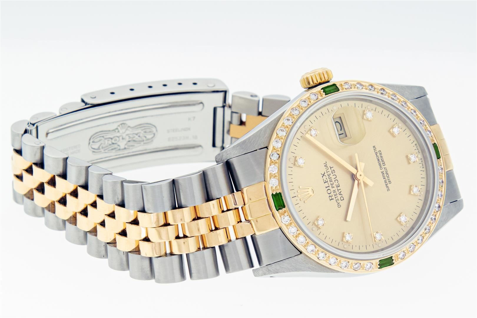 One Mens Pre owned Two Tone Yellow Gold & Stainless Steel Rolex Datejust Polished, Serviced & Electronically Tested, Yellow Gold & Stainless Steel Case: 36mm, Rolex Yellow Gold Crown, Custom Bezel: New 18K Yellow Gold Emerald Beadset Diamond Bezel, Diamond Count: 36 Diamonds + 4 Emeralds, Clarity: SI-VS, Color: G to H. Custom Crystal: New Sapphire With Magnified Date Window. Custom Hands: New Hands. Rolex Movement: Automatic Winding Movement. Rolex Factory Dial: Champagne Dial With Diamond Hour Markers. Diamond Count: 10 Diamonds In Dial. Date Window: 3 O'Clock Position Date Display, Quickset, Model: Datejust. Condition: G-6 Extra Fine. Rolex Bracelet: Two Tone Yellow Gold & Stainless Steel Jubilee Band. Bright Polish. 7.0 Inch Length, Adjustable. Standard Clasp, With Rolex Logo. This Pre Owned Watch Has Been Serviced Time Tested And Is In Excellent Condition It Is Free Of All Scratches And Dents.
