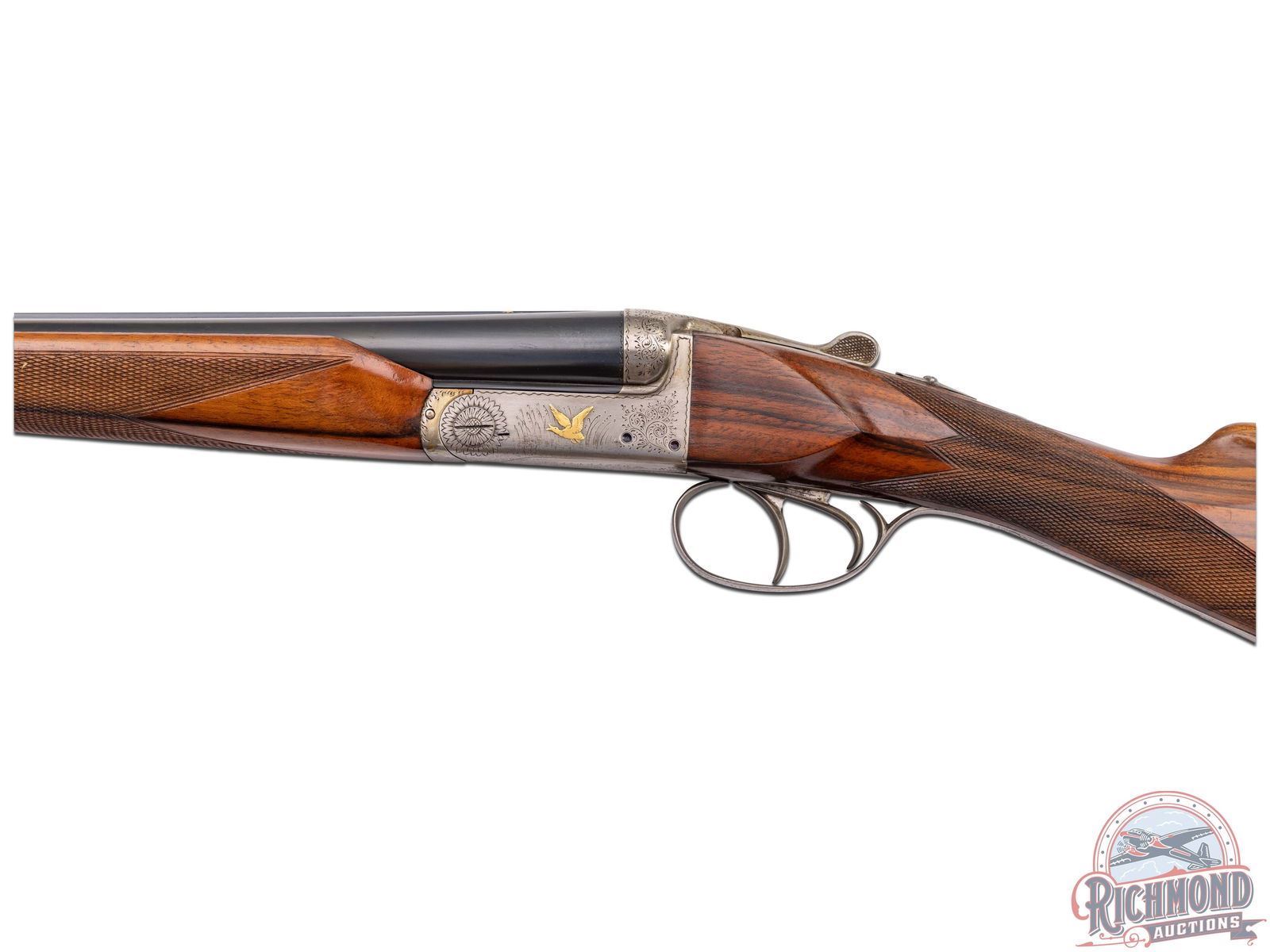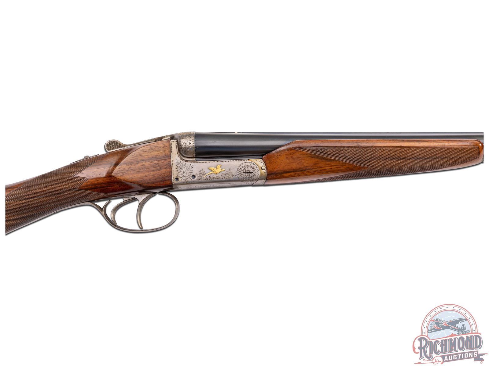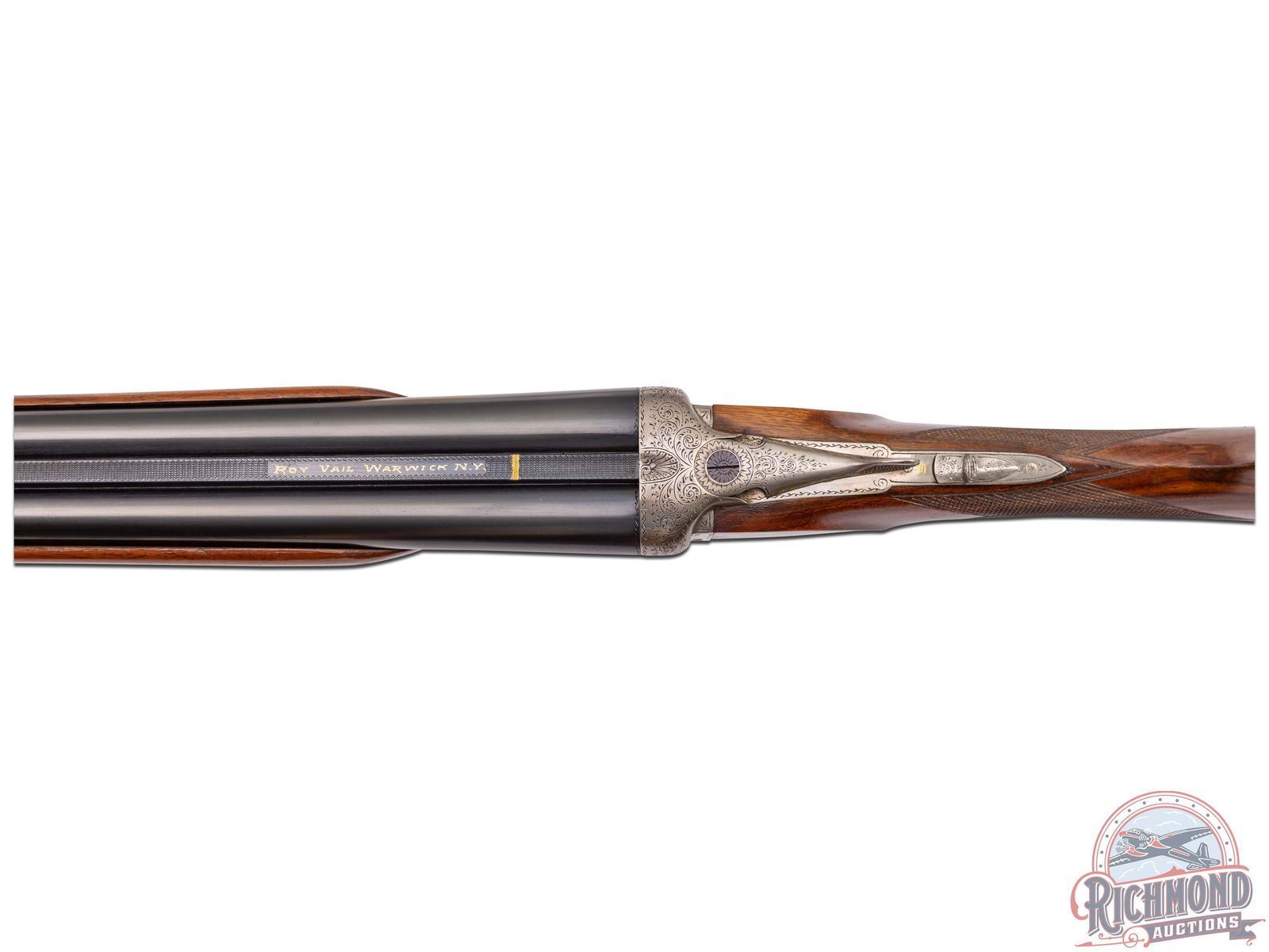 Made in Belgium by Francotte and custom stocked and engraved by Roy Vail in Warwick, New York. 26-1/4" blued Belgium proofed fluid steel 20 gauge barrels with matted rib, 2-3/4" chambers, ejectors, Modified and Modified chokes, and maker marked on rib "Roy Vail Warwich, NY" in gold. Satin finished boxlock action with vignette engraving and gold duck on left and gold pheasant on right. Action fitted with double triggers and non-automatic safety. Walnut English grip checkered stock with gold vanity plate with former owner's initials. Stock has leather faced pad and contrasting wood inlay of a Setter on right side. Inlay would have taken great effort. Gun has matching walnut checkered beavertail forearm with push button release. LOP: 14-3/4". DAC: 1-1/2". DAH: 2". CALIBER: 20 GA. S/N: 70606. FFL STATUS: Curio & Relic.