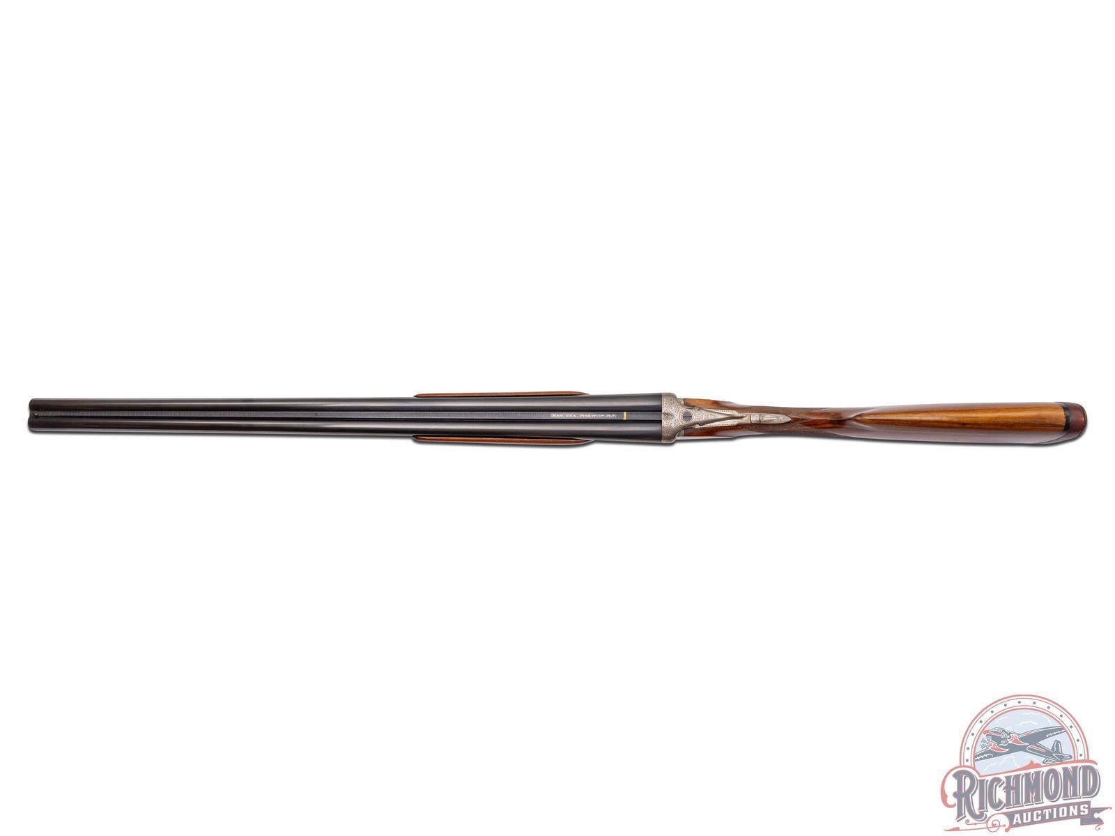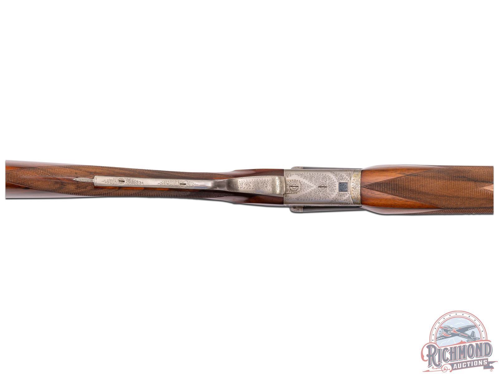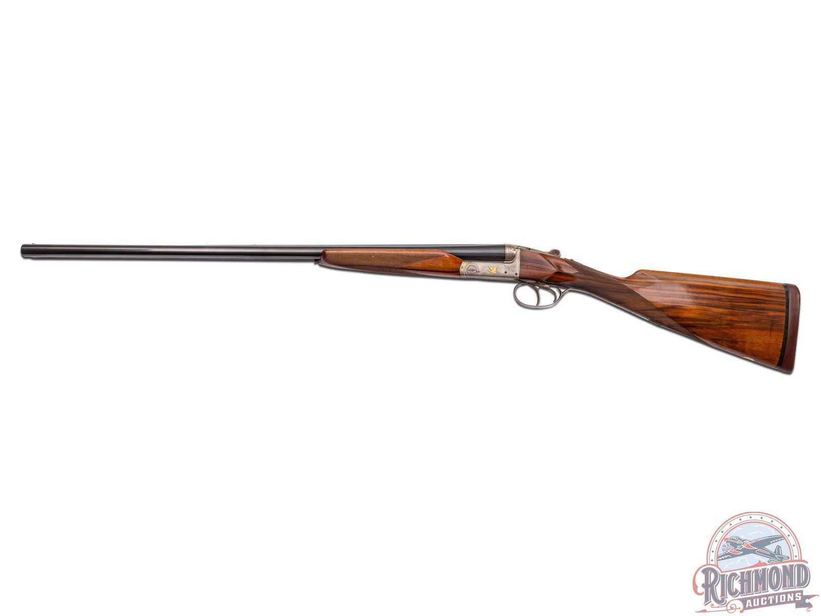 Made in Belgium by Francotte and custom stocked and engraved by Roy Vail in Warwick, New York. 26-1/4" blued Belgium proofed fluid steel 20 gauge barrels with matted rib, 2-3/4" chambers, ejectors, Modified and Modified chokes, and maker marked on rib "Roy Vail Warwich, NY" in gold. Satin finished boxlock action with vignette engraving and gold duck on left and gold pheasant on right. Action fitted with double triggers and non-automatic safety. Walnut English grip checkered stock with gold vanity plate with former owner's initials. Stock has leather faced pad and contrasting wood inlay of a Setter on right side. Inlay would have taken great effort. Gun has matching walnut checkered beavertail forearm with push button release. LOP: 14-3/4". DAC: 1-1/2". DAH: 2". CALIBER: 20 GA. S/N: 70606. FFL STATUS: Curio & Relic.
