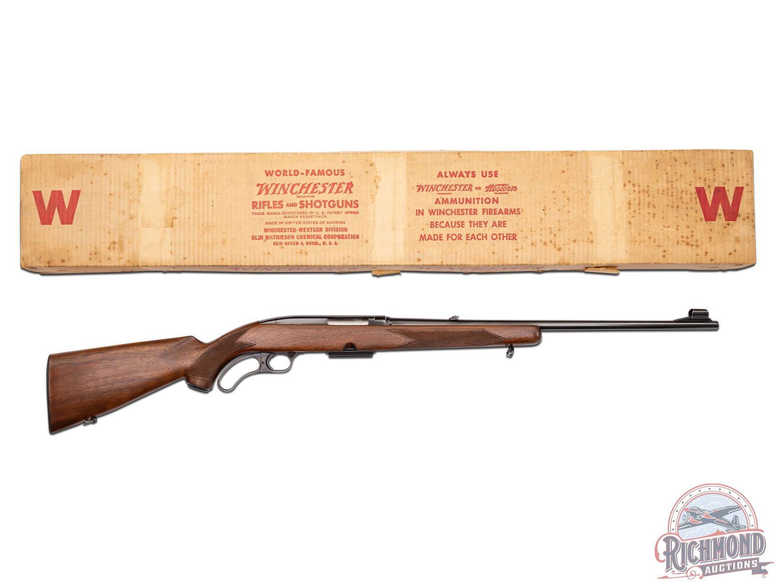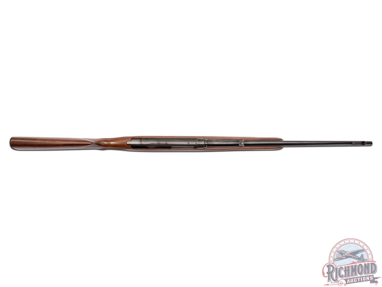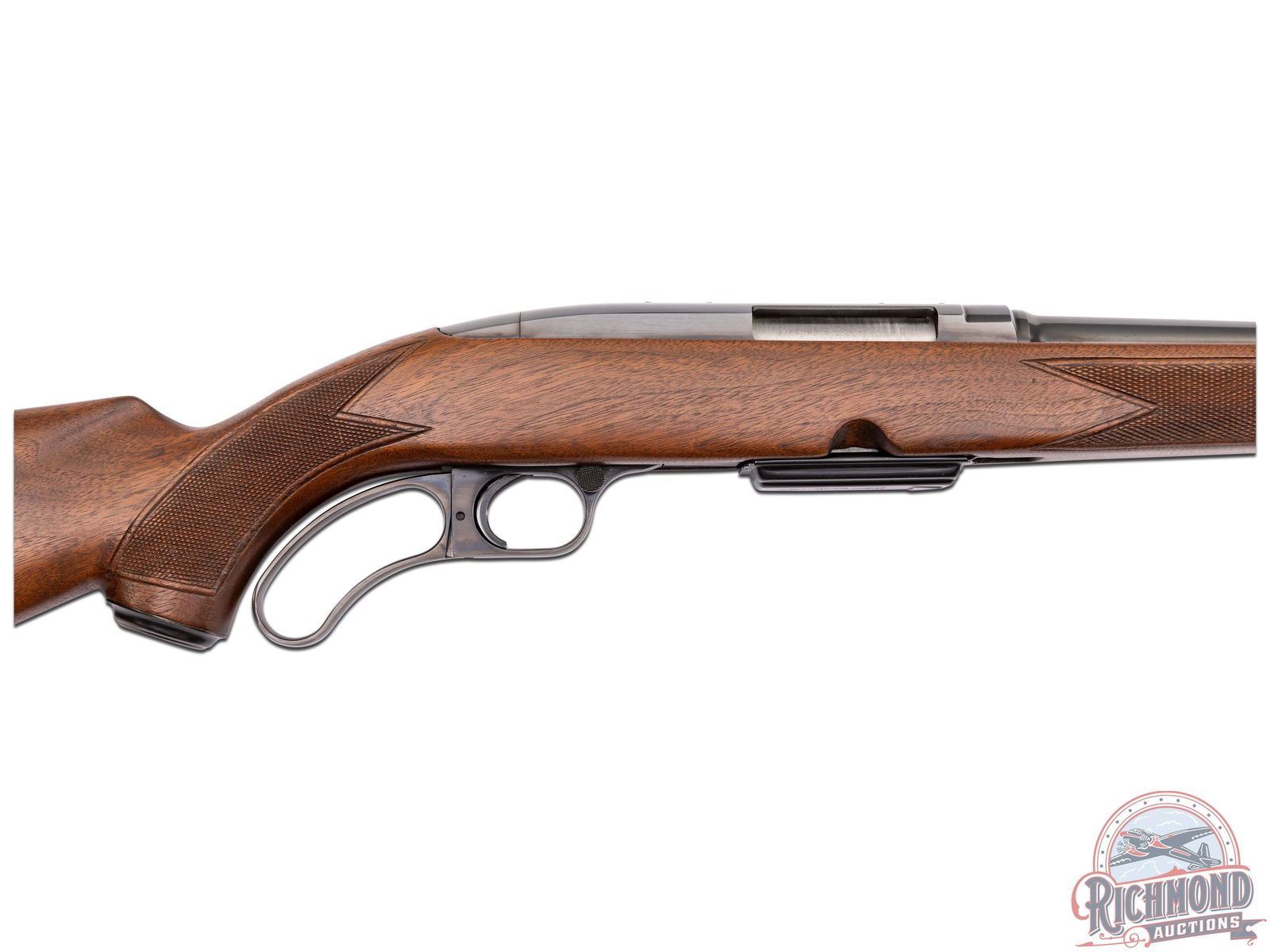 This model 88 was manufactured in 1958. Features a 22" blued tapered Winchester Proof Steel barrel with all standard factory roll marks and proof marks. Chambered in the rare 358 WIN caliber. Hooded front ramp sight and rear flip-up notch sight with white diamond insert. Blued receiver drilled and tapped for scope mount. Unique lever that actions with the trigger and crossbolt safety. Includes original factory detachable magazine. Satin walnut stock with hand checkered pistol grip, metal pistol grip cap, and matching checkered forearm. Fitted with a factory synthetic butt plate and swivel sling rings. Includes the original factory box with hanging tag. LOP: 13-3/4". CALIBER: 358 WIN. S/N: 72520. FFL STATUS: Curio & Relic.