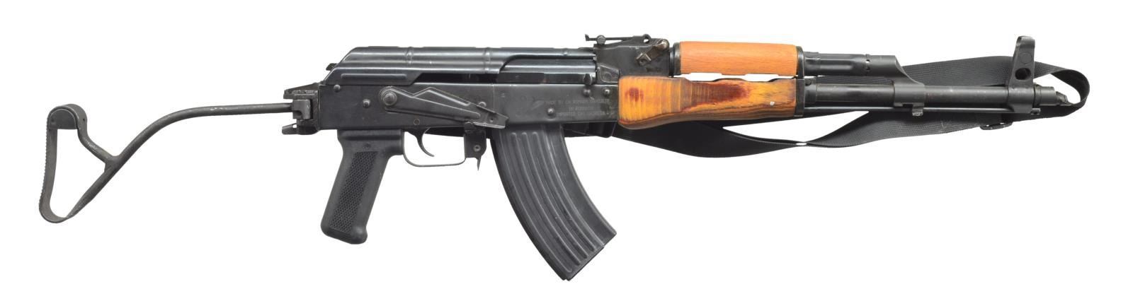 WITH TRHEADED MUZZLE. Cal. 7.62x39. S# KX-4580-80. Bbl. 16". Romanian right side folding WASR 10 imported through Century International Arms. Stamped metal receiver w/ left side scope mount. Correct left hand threaded muzzle w/ slant brake. Bayonet lug secures on board cleaning rod. Protected post front sight & rear tangent sight marked to 1000m. Right side controls. Wood forearm & heatshield w/ black plastic pistol grip. Nylon single point sling assembly affixed at rear of receiver. Tapco G2 trigger. MAGS: 1-20 rd. metal mag. UNATTACHED ACCESSORIES: bayonet & scabbard, 2 green canvas slings, laminated shoulder stock, cleaning kit & oil bottle, spare rubber butt pad, original owner’s manual, factory cardboard box, black padded nylon transport bag. CONDITION: wood has typical impressions & marks as found on surplus guns. Metal coverage is complete & consistent w/ thinning & wear scattered. Bore is shiny w/ good rifling. Fire control mechanism appears to function correctly when cycled by hand. (21-1071/JZ). MODERN. $500-800.