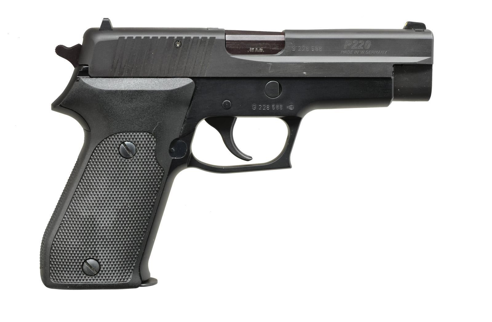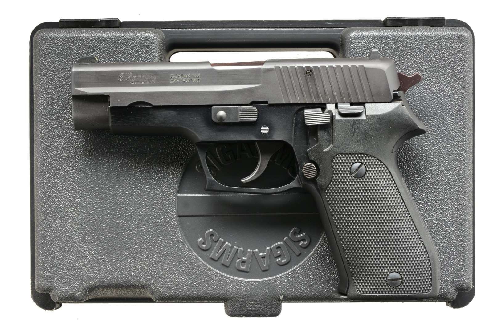 Cal. 45 ACP. S# G228588. Bbl. 4.4". Matte black traditional semi-auto chambered in 45 ACP w/ left side decocker. Serrated slide w/ drift adj. sights. 2 Piece black plastic factory checkered grips. MAGS: 2 factory 8 rd. UNATTACHED ACCESSORIES: Sig plastic transport box. CONDITION: exterior finish is complete & consistent w/ only gentle thinning on some high spots. Shiny bore w/ strong rifling. Fire control mechanism appears to function correctly when cycled by hand. (21-1073/JZ). MODERN. $400-600.