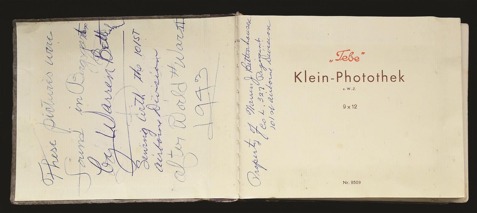 HITLER’S EAGLE'S NEST BY A MEMBER OF THE 101ST AIRBORNE. An incredible original photo album possibly belonging to Adolf Hitler & possibly taken by his personal photographer, Heinrich Hoffmann. This historic album was taken from Adolf Hitler’s underground living quarters in the mountains at Berchtesgaden, Germany. A notarized handwritten letter by Corporal Warren J. Bettenhausen of Company L of the 327th Glider Infantry Regiment of the 101st Airborne Division is included w/ the album. Cpl. Bettenhausen personally liberated the album from Hitler’s living quarters during the 101st Airborne’s occupation of the area around Berchtesgaden. The inside title page of the album is signed by Warren Bettenhausen. The exceptional photographs, many of which depict Hitler himself, show a myriad of high ranking Nazi officials along w/ Mussolini. Each picture is dated & identified in German above & below the photo. Hermann Goring appears in many of the pictures. There are photos of staff meetings & walks in the winter scenery. The album appears to cover late 1941 through 1942. A truly unique opportunity to obtain personal images of the leader of the Third Reich & many of his accomplices. UNATTACHED ACCESSORIES: a notarized letter attesting to the origin of the album. A photograph of Cpl. Warren Bettenhausen. Information on Bettenhausen gleaned from the internet. Personal correspondence about the photo album. CONDITION: album is well worn but the photographs are clear, crisp & undamaged. (02-15026/BF). $2,500-3,000.