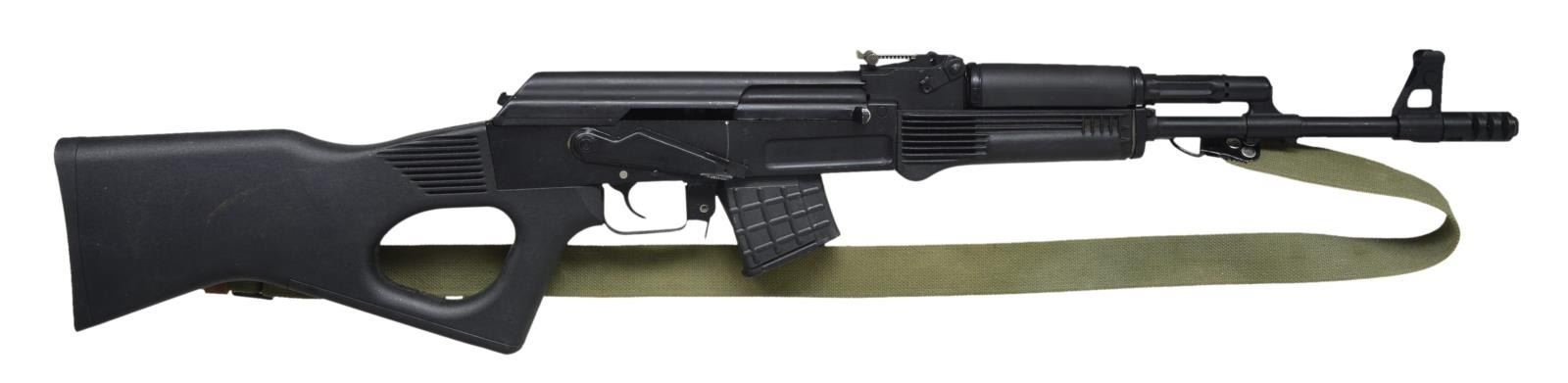 Cal. 7.62x39. S# IK372871. Bbl. 18". The name Arsenal Inc. is synonymous w/ some of the highest quality Bulgarian firearms mfg. worldwide. This example is a milled receiver sporter variant w/ black synthetic furniture & thumbhole stock. Traditional dark black painted finish on all exposed metal surfaces. The muzzle brake seems to be pinned to the bbl. & is included in the overall length. No bayonet lug. Protected post front sight & elevation adj. rear sight to 800m. Correct left side sling swivel corresponds w/ left side rear sling swivel on stock. Green canvas sling. MAGS: 1-5 rd. black plastic waffle pattern. CONDITION: finish on bbl. receiver & top cover is matching & complete, a few areas of rubbing indicate storage w/ other like firearms. Very little wear line on receiver below selector. Shiny bore w/ very strong rifling. Fire control mechanism appears to function correctly when cycled by hand. (21-701/JZ). MODERN. $500-800.